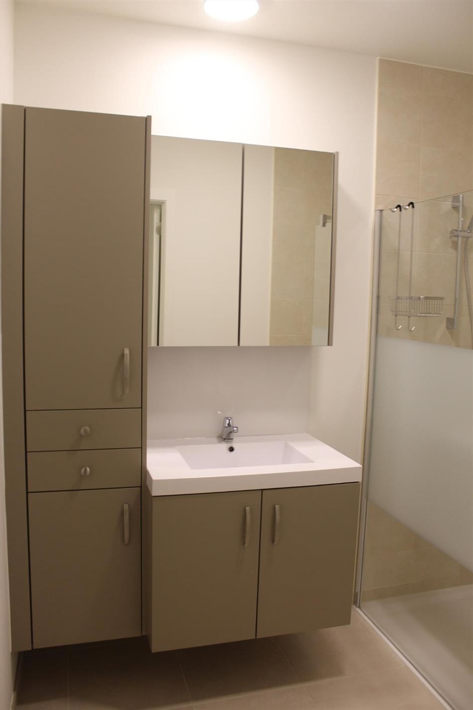 Gelijkvloers nieuwbouw-appartement met zeer ruim terras (30 m2) in het hartje van Overpelt centrum kortbij winkels, scholen, horeca, ... Epeil 50, gas verwarmt, ventilatiesysteem. Het appartement bestaat uit een inkomhal, toilet apart, woonkamer met keukenhoek, sanitaire ruimte, badkamer met douche/wastafel/opbergkastjes, 2 slaapkamers, ruim terras. In de kelder nog een autostaanplaats en aparte berging. Volledig geverfd. Gemeenschappelijke kosten 60 euro per maand. Kortom een instapklaar appartement. Voor meer info contacteer ons op info@vastgoedfransen.be of 011/64 55 00.