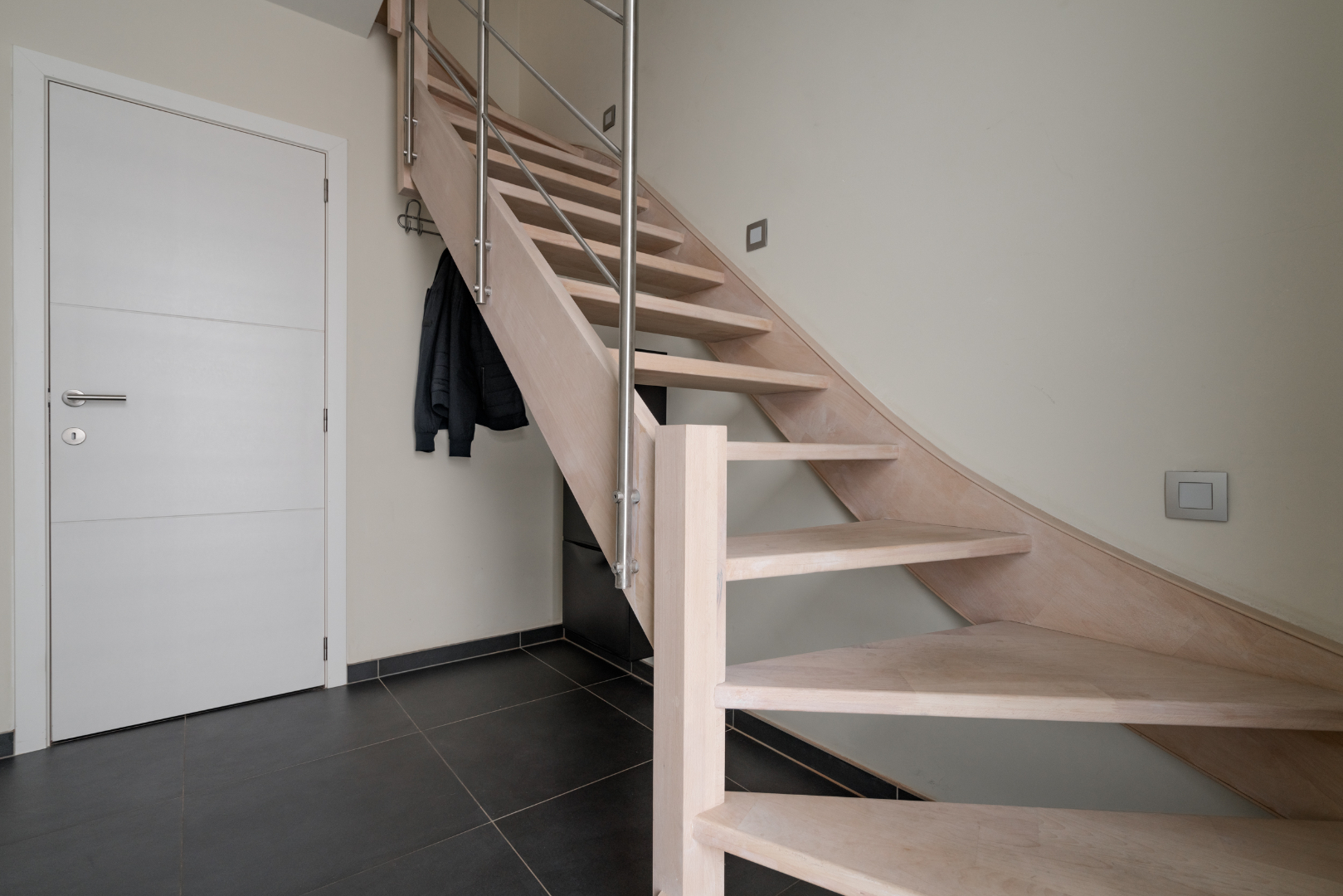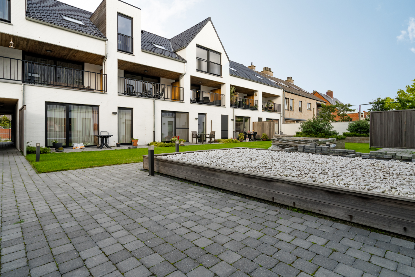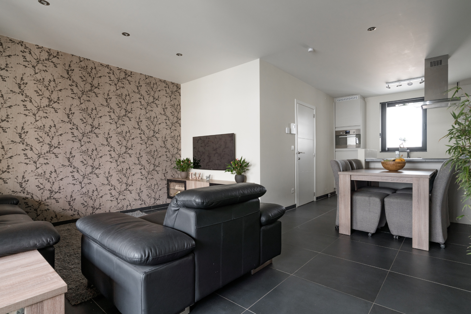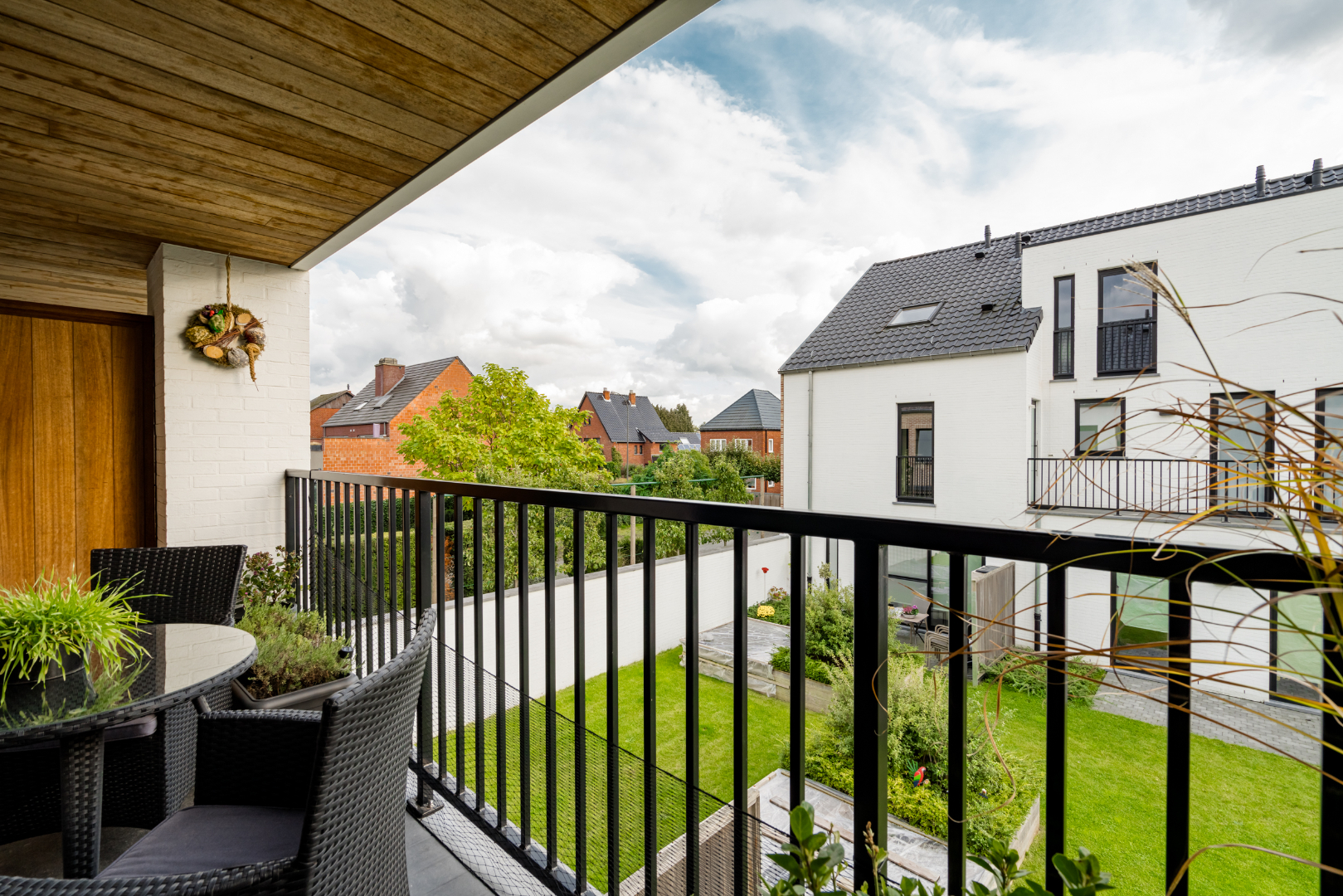 Inkomhal met trap en apart toilet, leefruimte met open keuken en toegang naar zuidelijk gelegen zonneterras met zicht op de fraai aangelegde binnentuin.