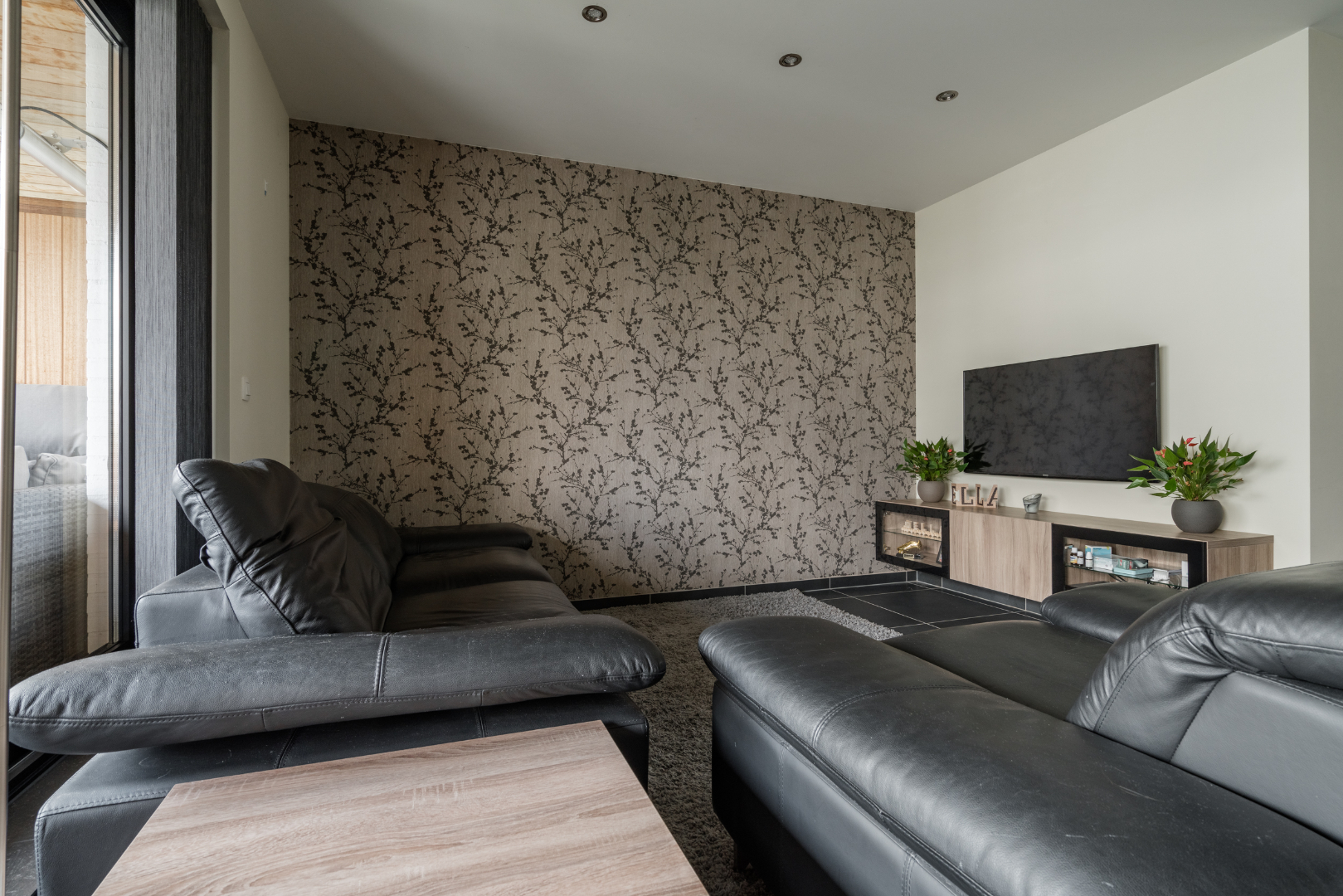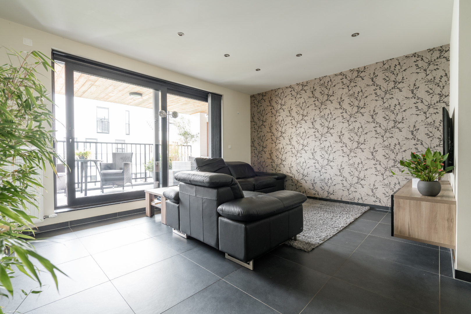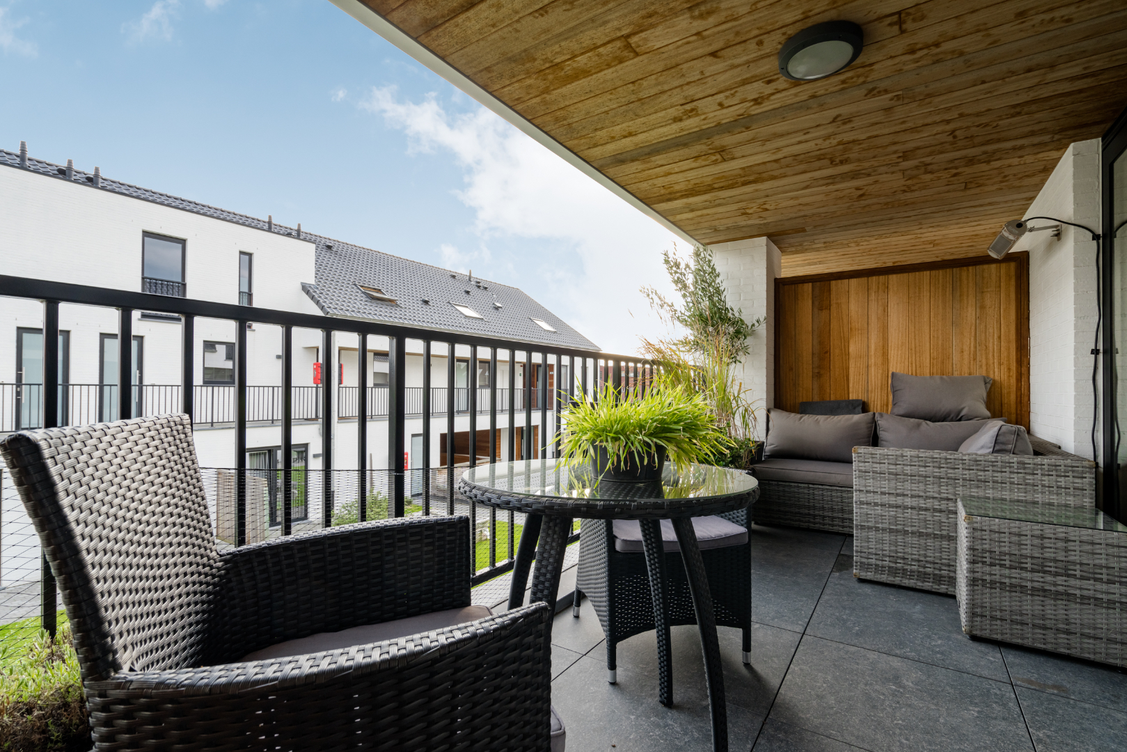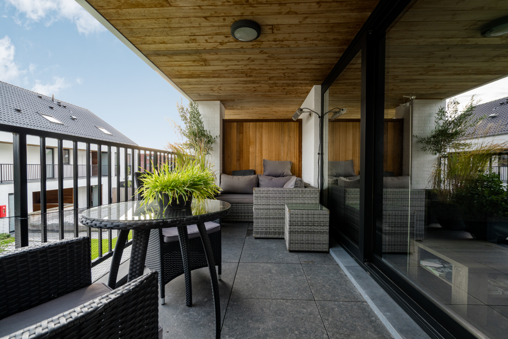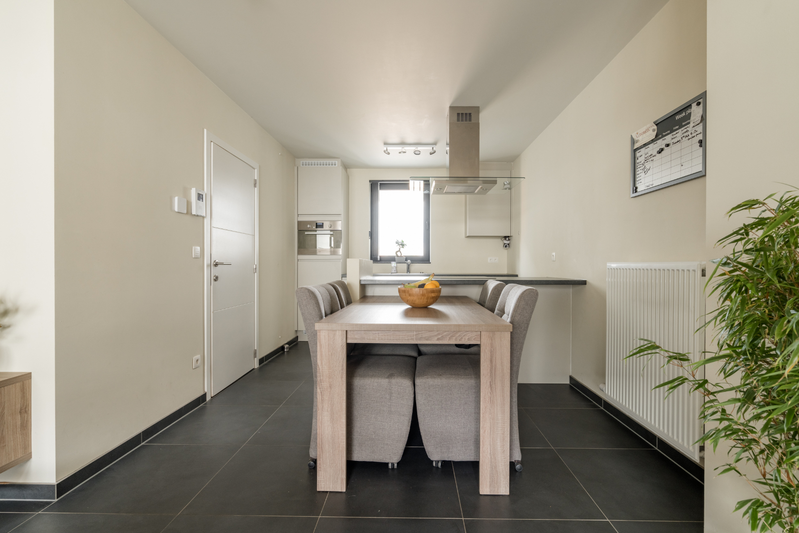 Inkomhal met trap en apart toilet, leefruimte met open keuken en toegang naar zuidelijk gelegen zonneterras met zicht op de fraai aangelegde binnentuin.