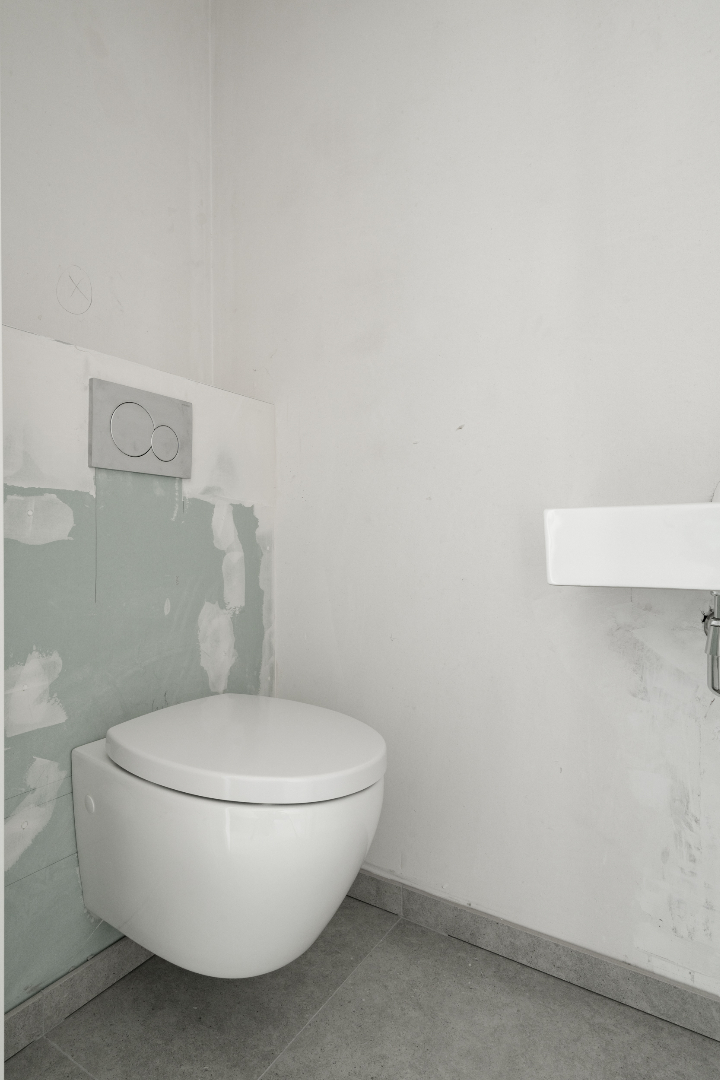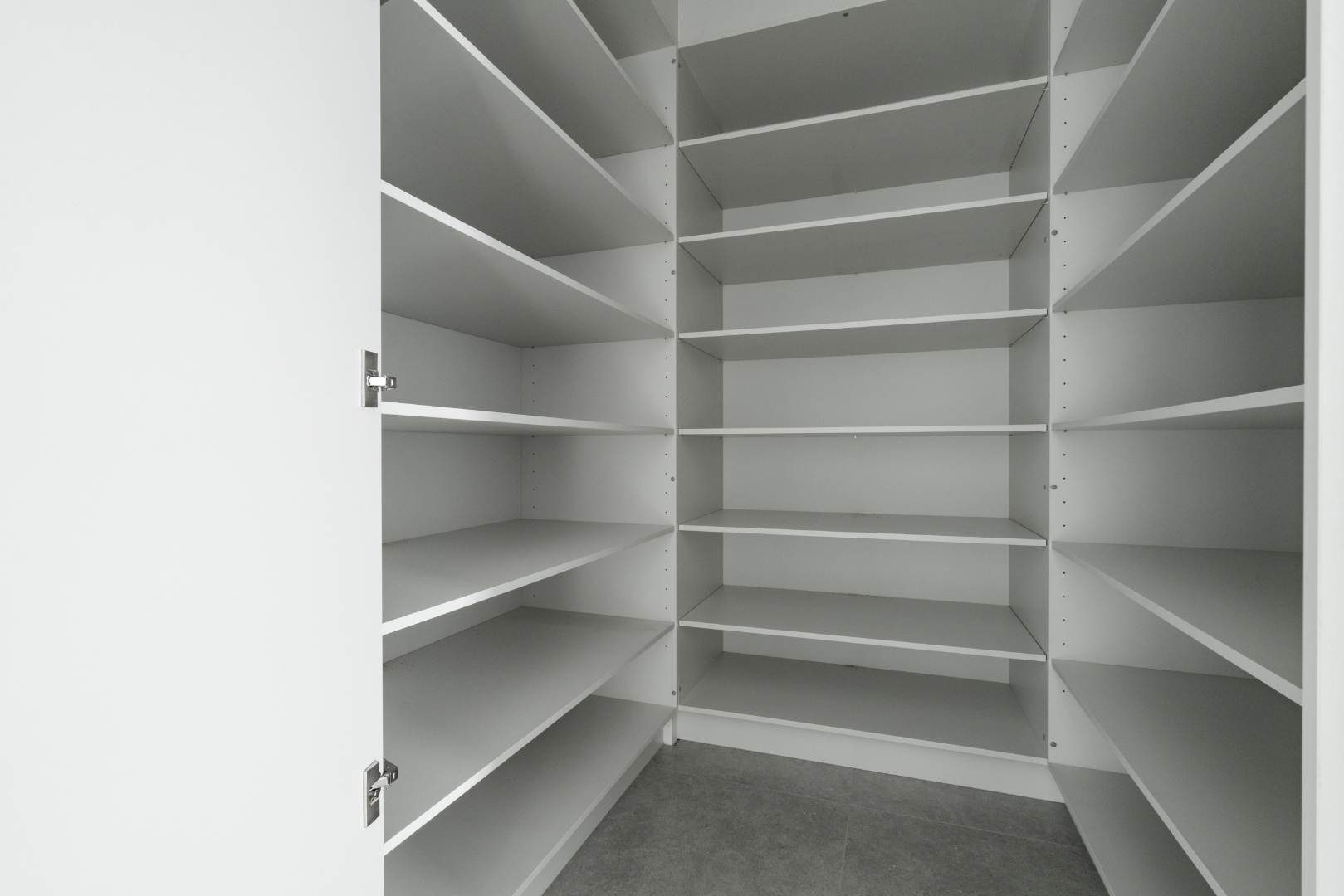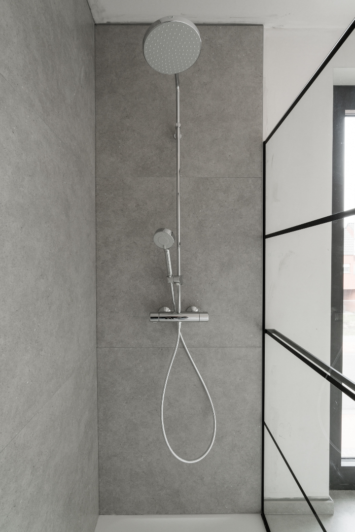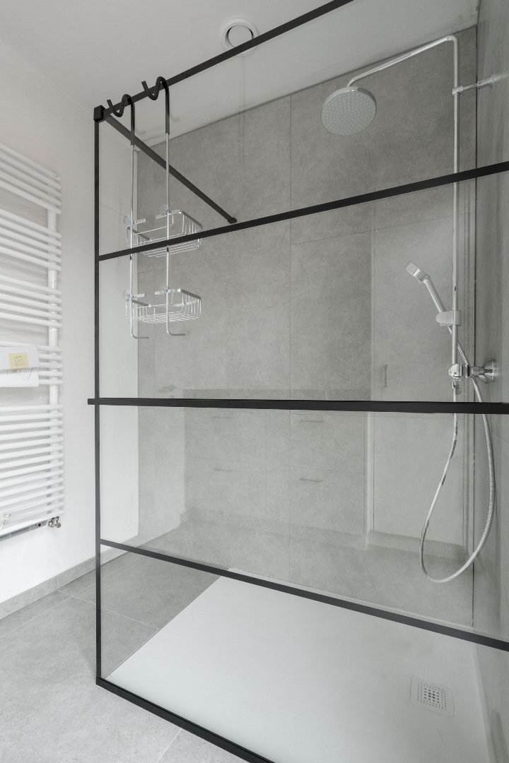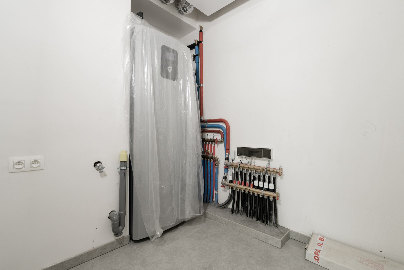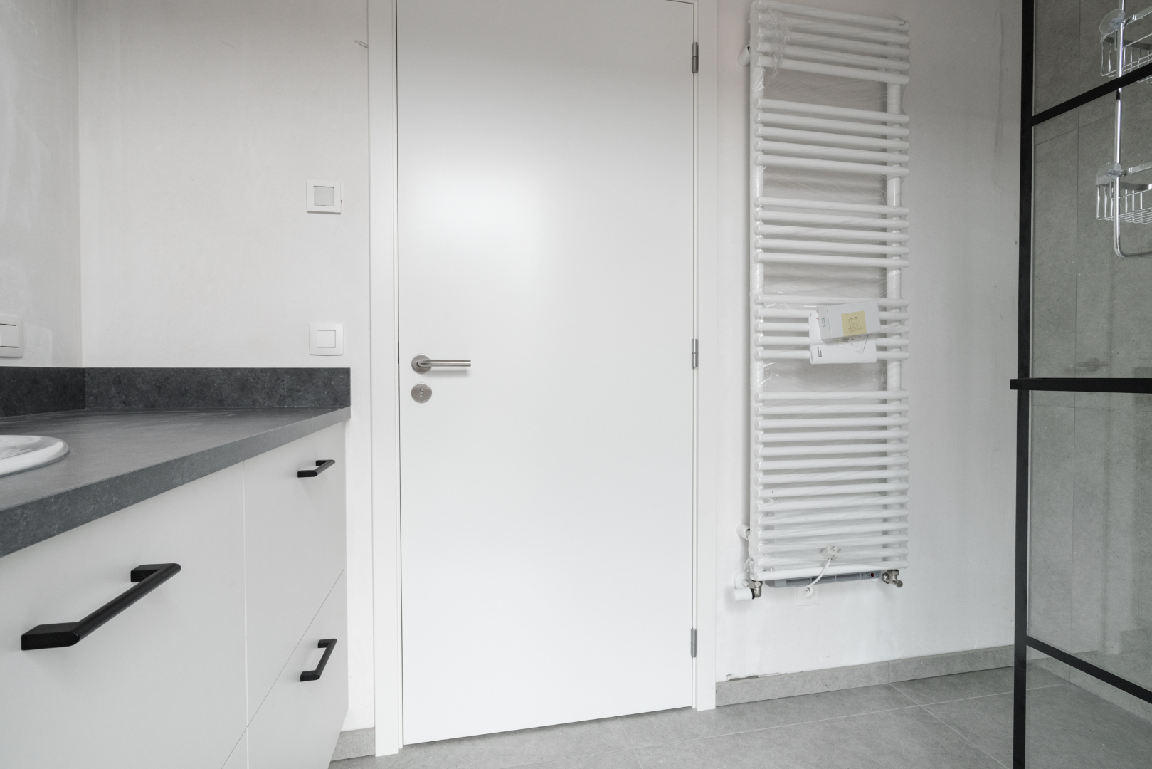 Badkamer voorzien van ruime inloopdouche met glaswand, badmeubel met dubbele wastafel. Berging-wasplaats aanwezig.