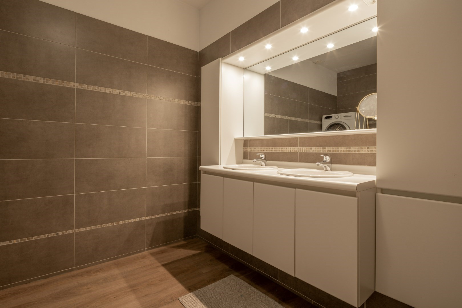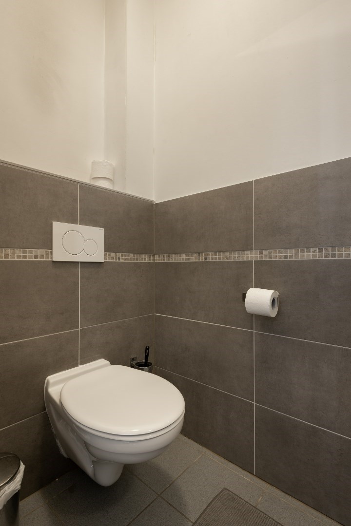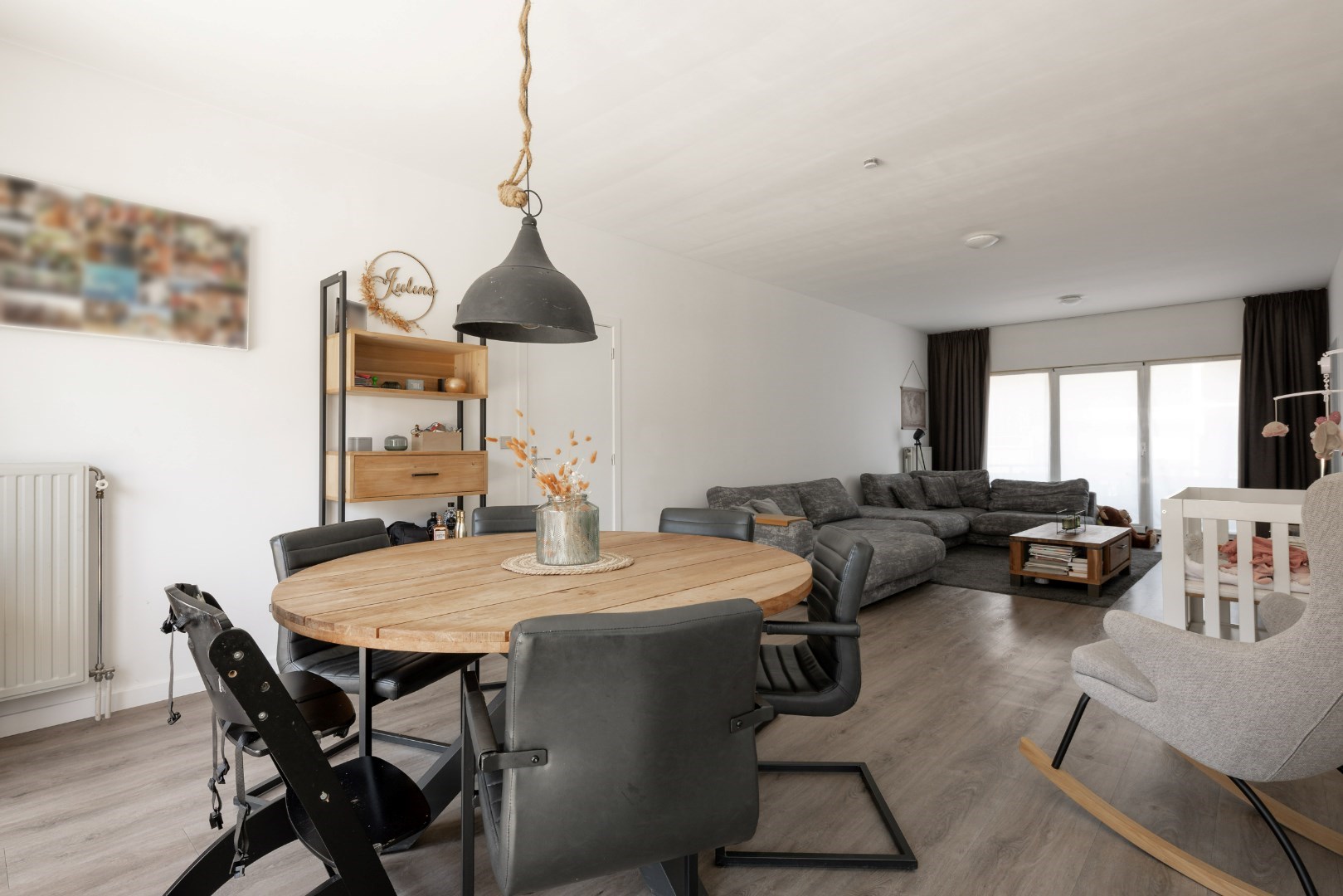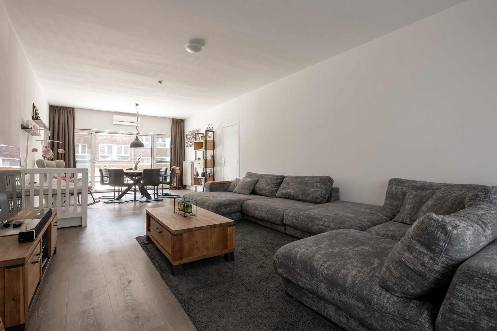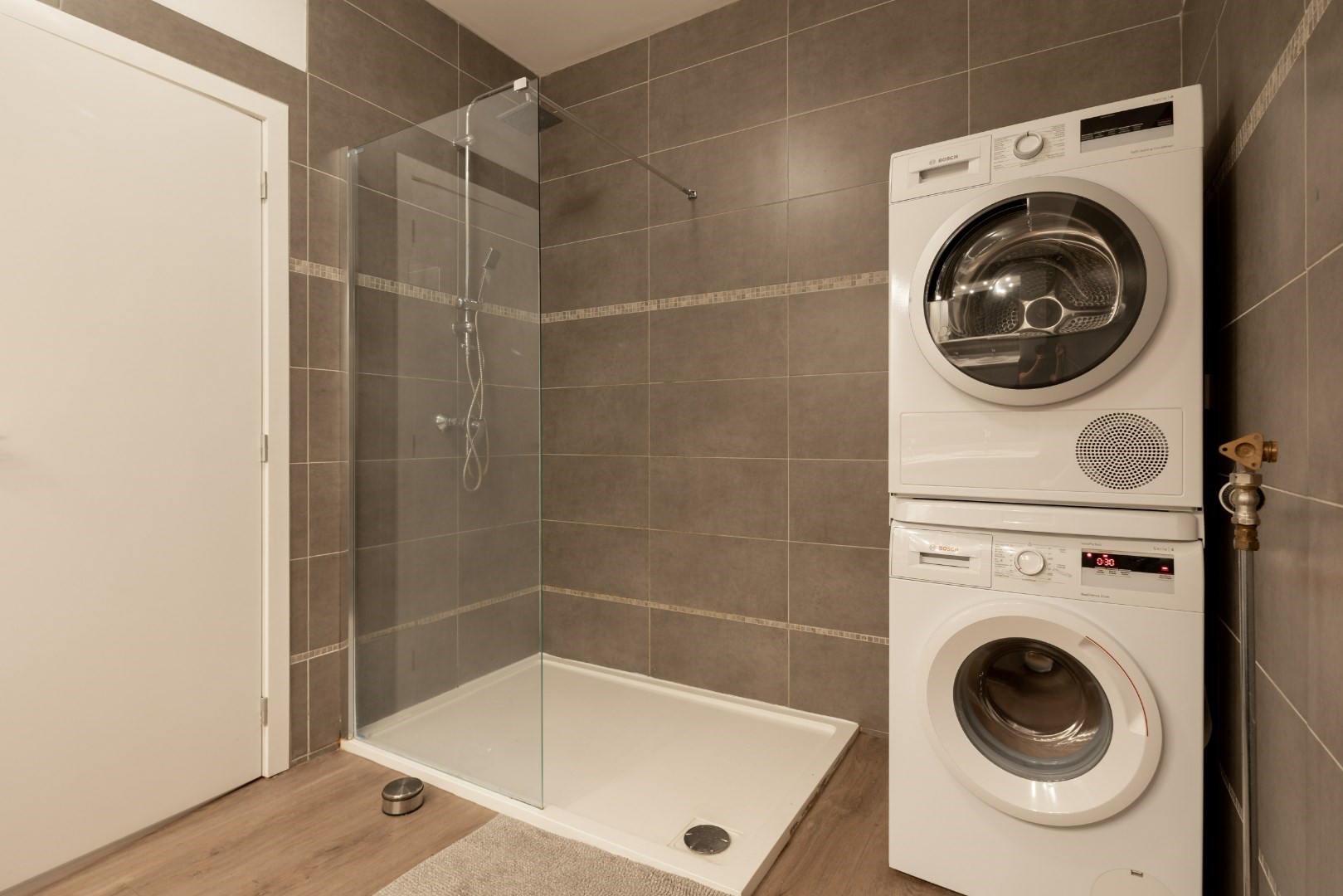 Vanuit de gemeenschappelijke inkomhal, kom je in een privatieve hal met toilet. Van hieruit komen we terecht in een ruime open leefruimte, met aansluiting aan het aanpalende zeer ruime terras. Het leuke is dat de ramen hier ook volledig opengezet kunnen worden, waardoor het een mooi geheel wordt met zomerse temperaturen. Aanpalend de leefruimte bevindt zich ook de keuken met een nieuw inductievuur, een oven, nieuwe vaatwasser en spoelbak. Hiernaast is de berging zodat je extra voorraad kan stockeren vlakbij de keuken.