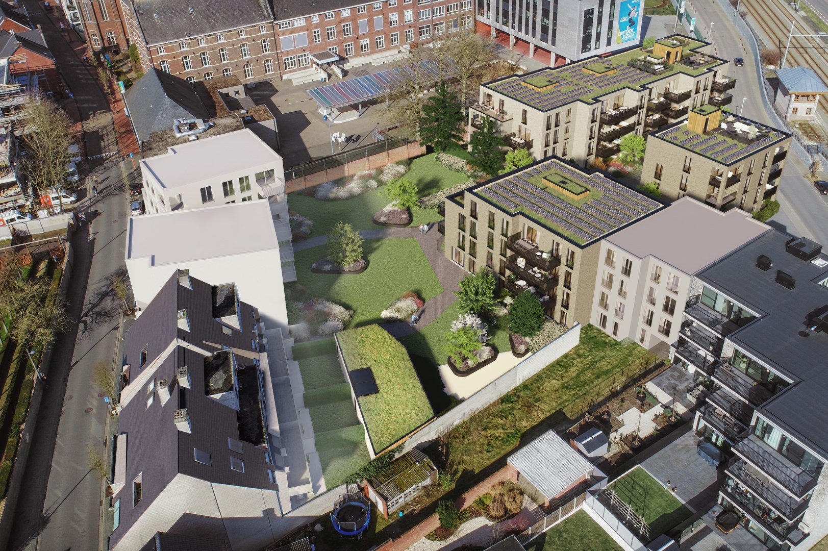 * Een volledig aangelegde gemeenschappelijke tuin, uitgerust met een retentie- en irrigatiesysteem, samen met de groendaken, zorgt voor een duurzaam waterbeheer en een aangenaam microklimaat.