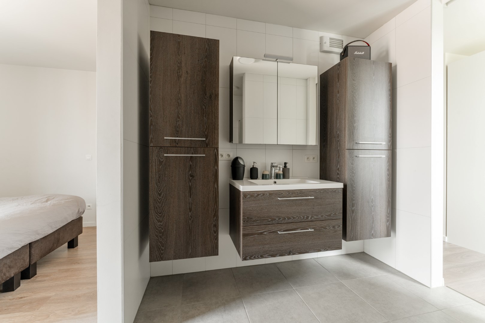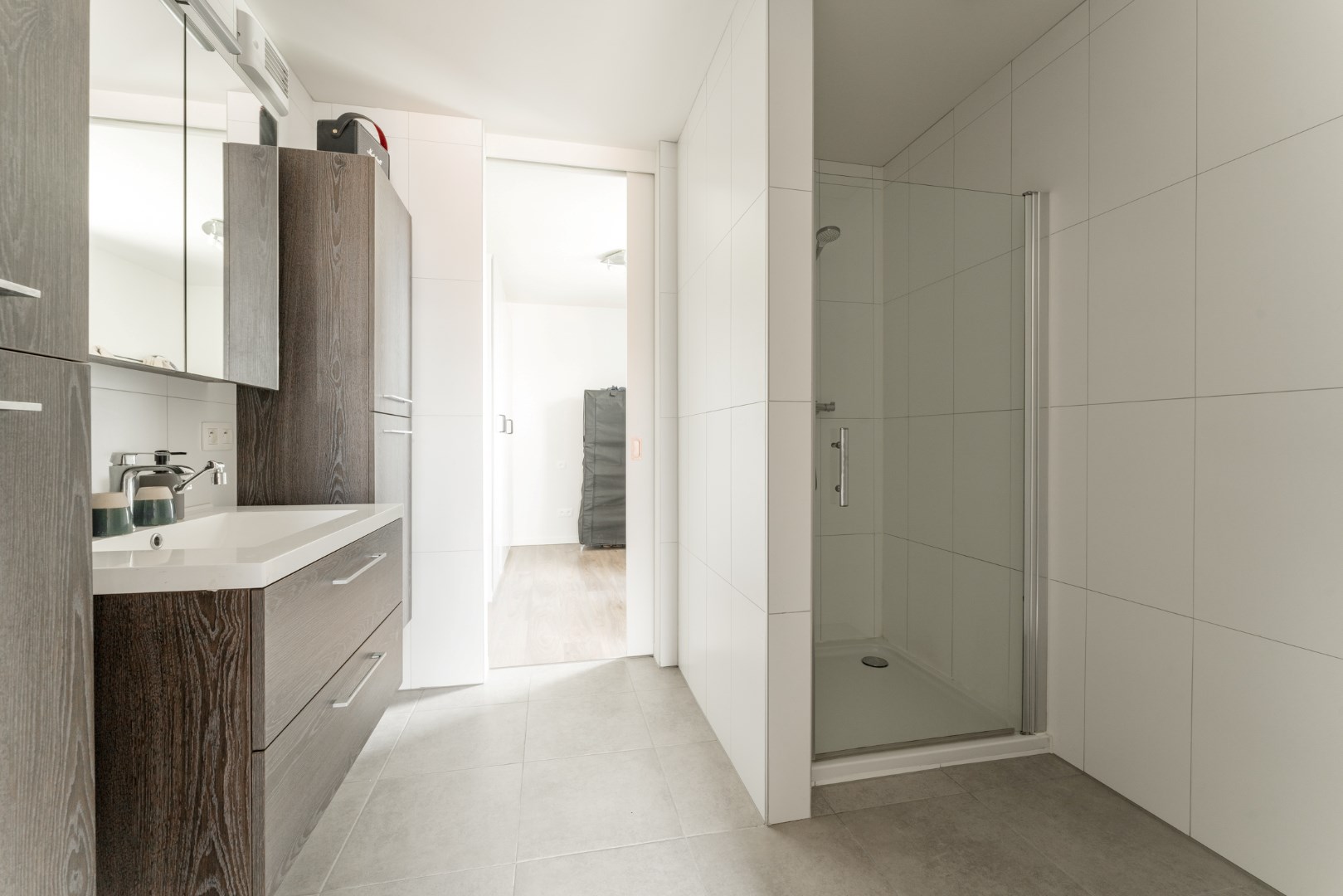 Verder vinden we nog twee slaapkamers terug, die beide in verbinding staan met de volledig ingerichte badkamer. De badkamer is netjes afgewerkt en heeft een douche en lavabo. Om alle ruimtes compleet te maken, is er nog een aangename bergruimte met uitgietbak (koud+warm water) en de voorzieningen voor wasmachine en droogkast.