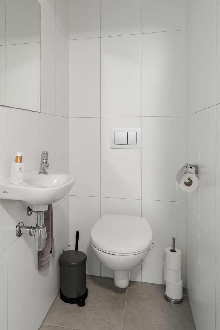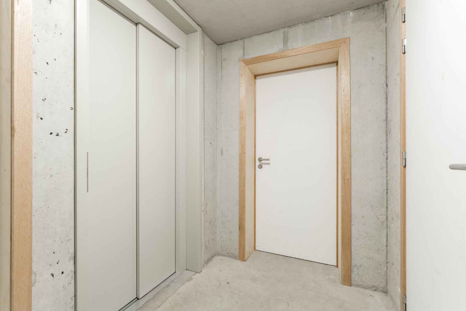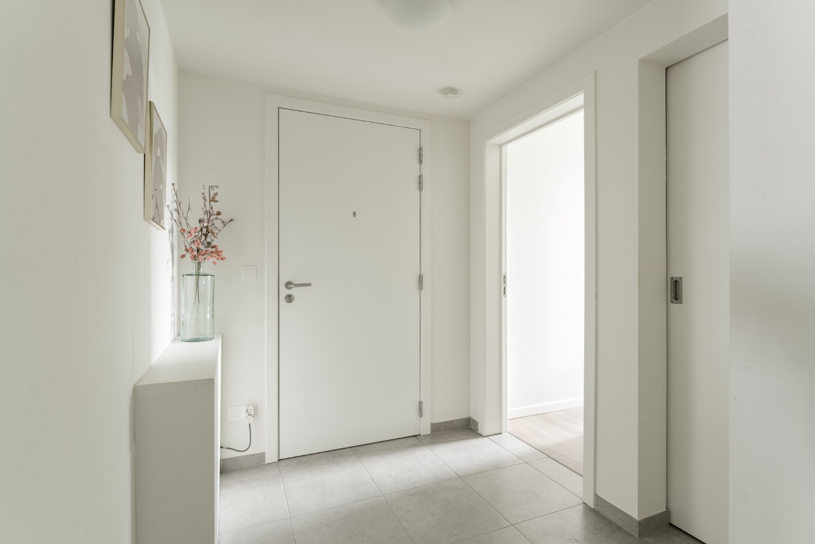Wanneer we met de lift stijgen naar het derde verdiep, vinden we dit lichtrijke appartement terug. Vanuit te inkomhal is er toegang richting het aparte toilet met lavabo, alsook richting de open leefruimte. De hal wordt afgesloten met een mooie glazen deur die in verbinding staat met de leefruimte.