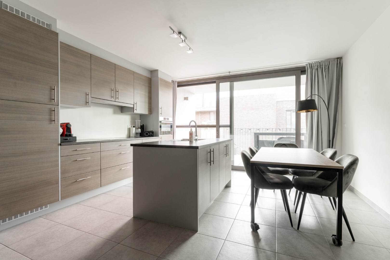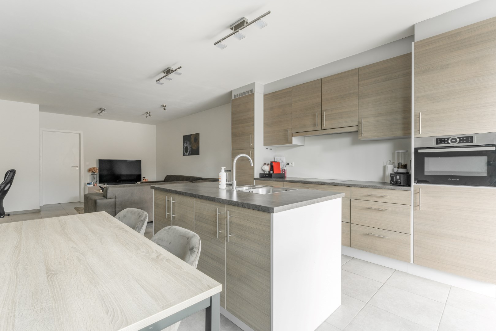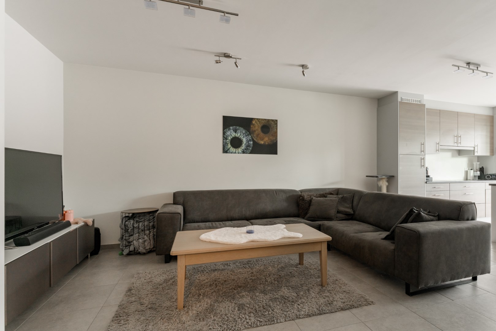 De leefruimte bevat een open keuken met combi-oven, koelkast, vaatwasser, inductievuur en anderhalve spoelbak. Verder is er een mooi eiland voorzien zodanig dat er genoeg opbergruimte is. Deze leefruimte leunt aan tegen het terras, wat dankzij zijn hoogte een mooie licht- en zonsinval kent.
