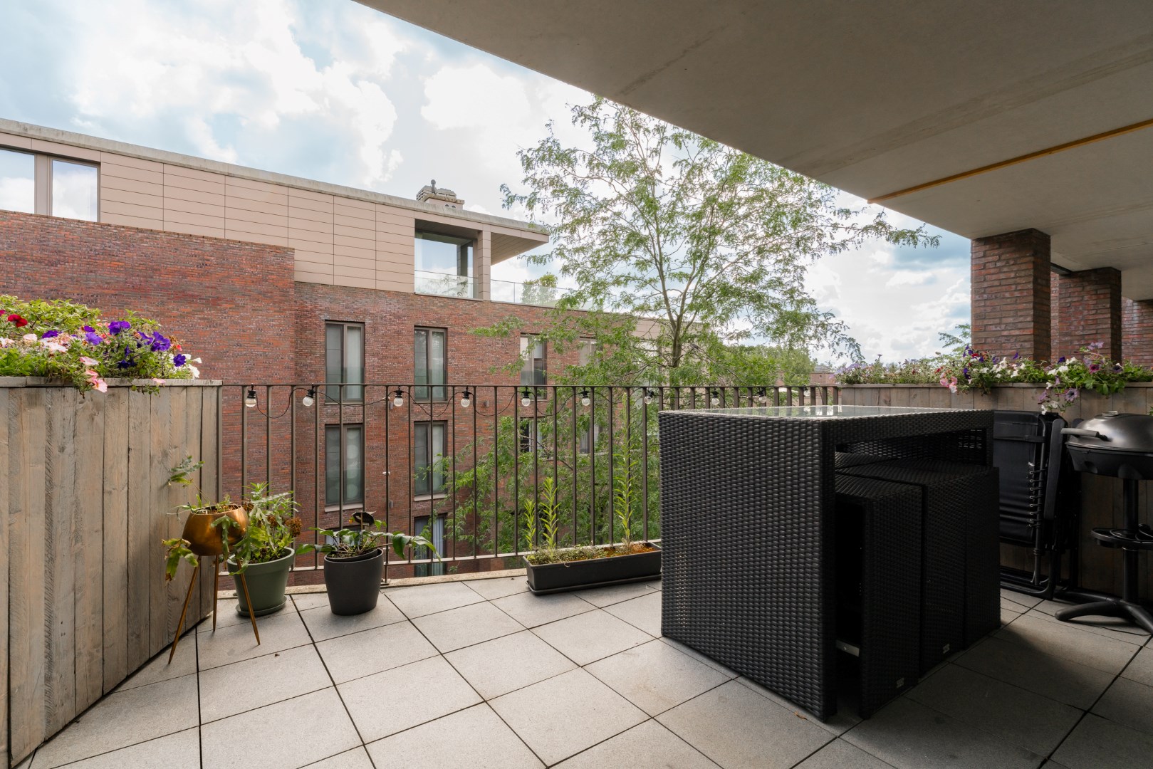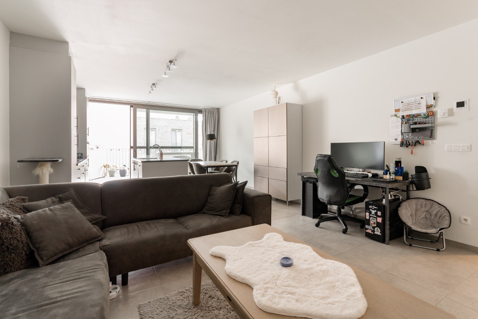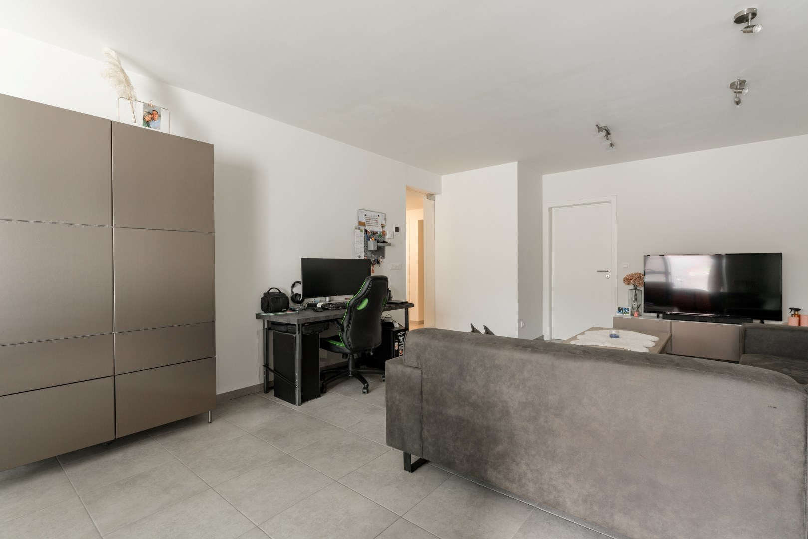 De leefruimte bevat een open keuken met combi-oven, koelkast, vaatwasser, inductievuur en anderhalve spoelbak. Verder is er een mooi eiland voorzien zodanig dat er genoeg opbergruimte is. Deze leefruimte leunt aan tegen het terras, wat dankzij zijn hoogte een mooie licht- en zonsinval kent.