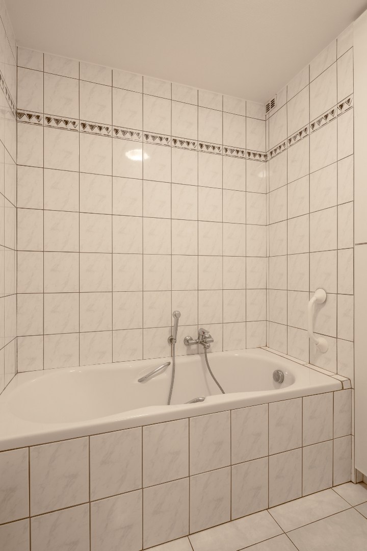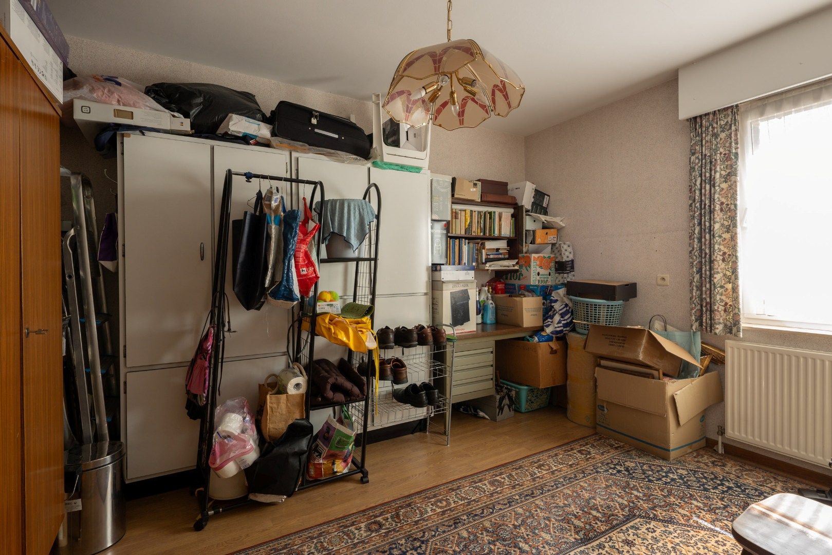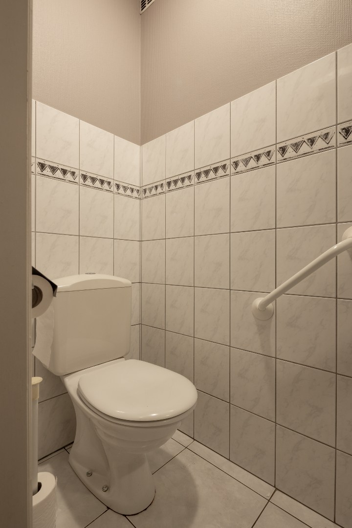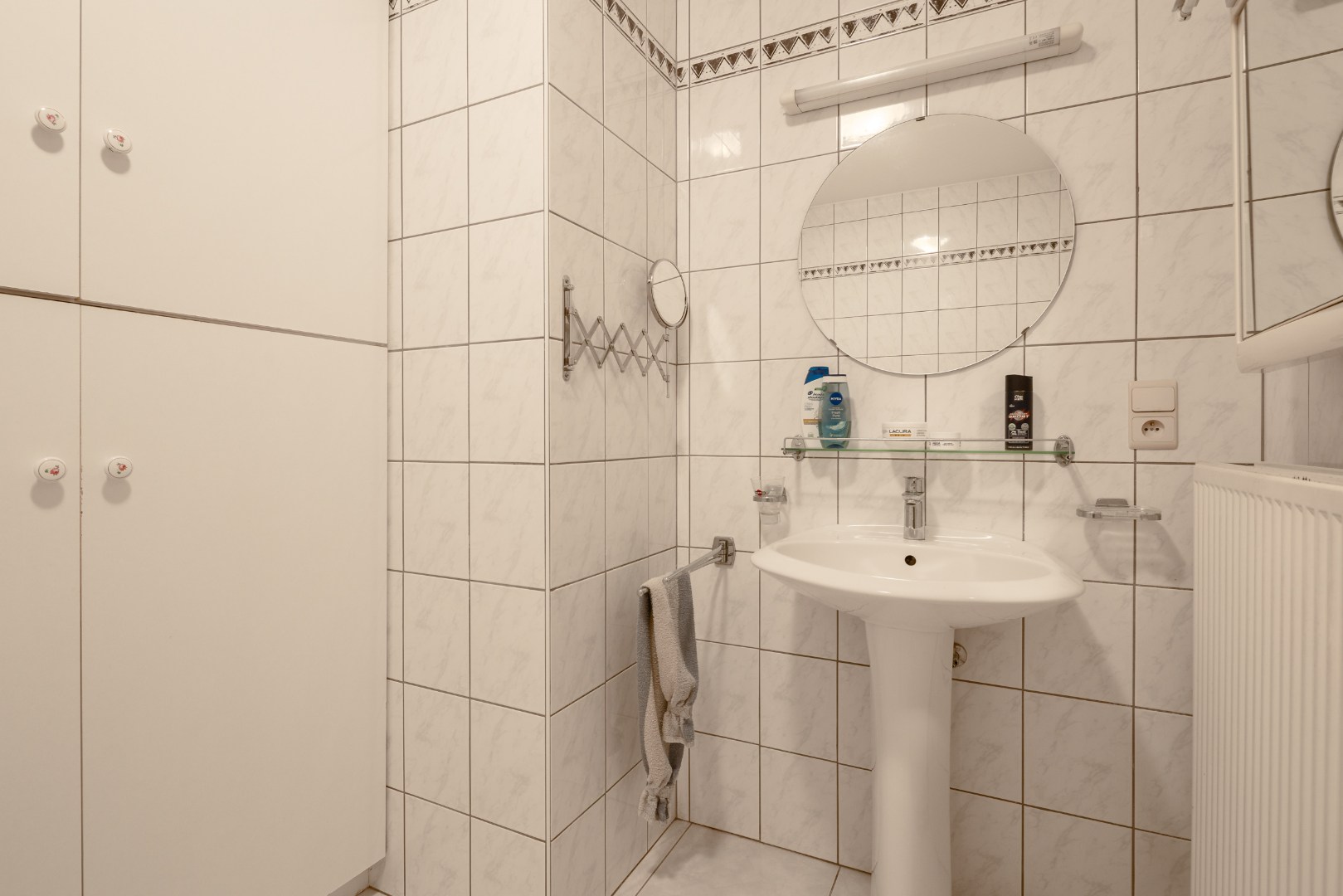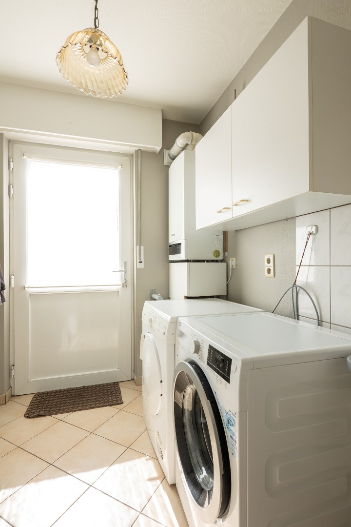 Verder hebben we nog toegang tot twee slaapkamers (+/- 12,5m²), een badkamer met bad en veel inbouwkasten, een apart toilet met lavabo alsook een bergruimte voor wasmachine en droger.