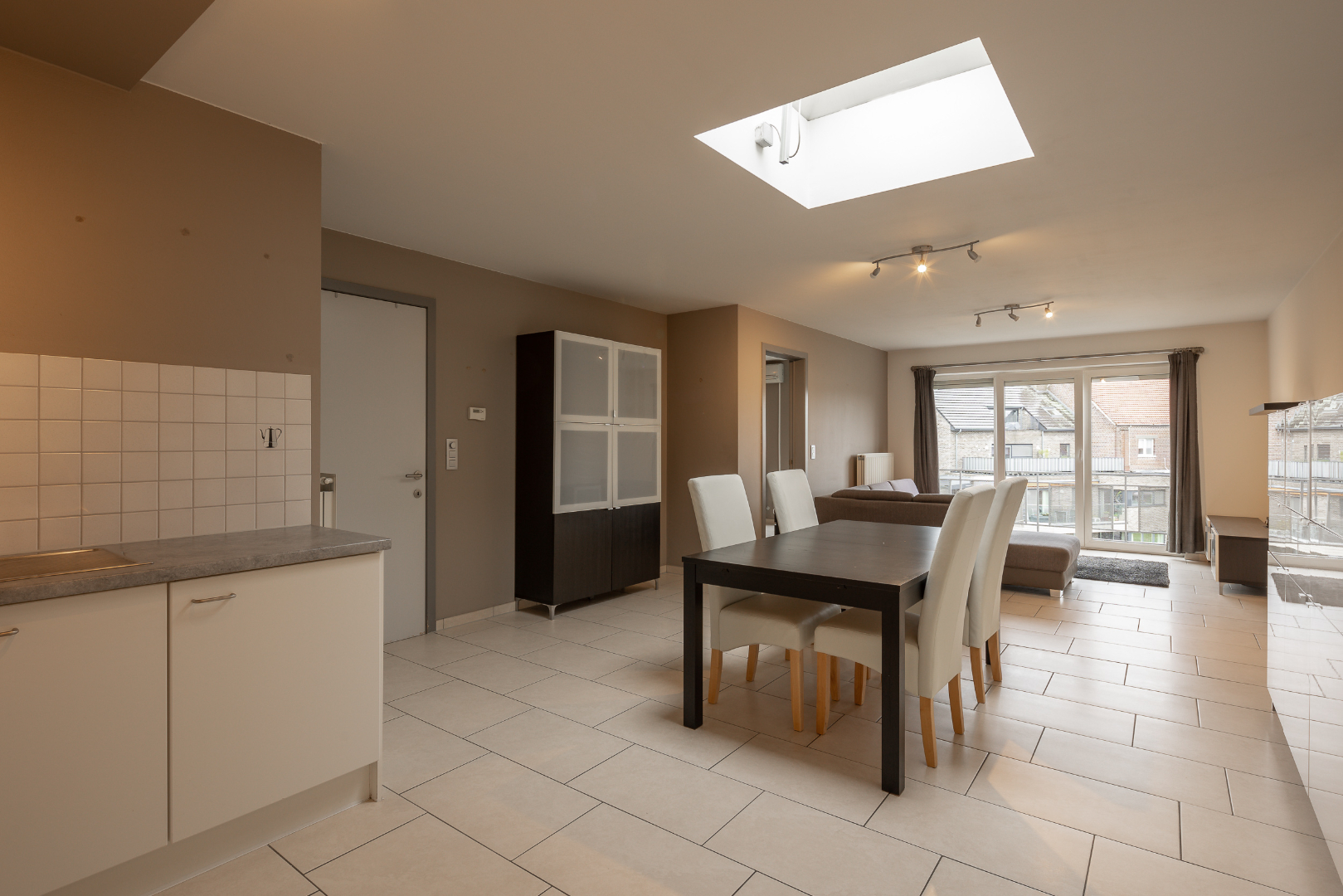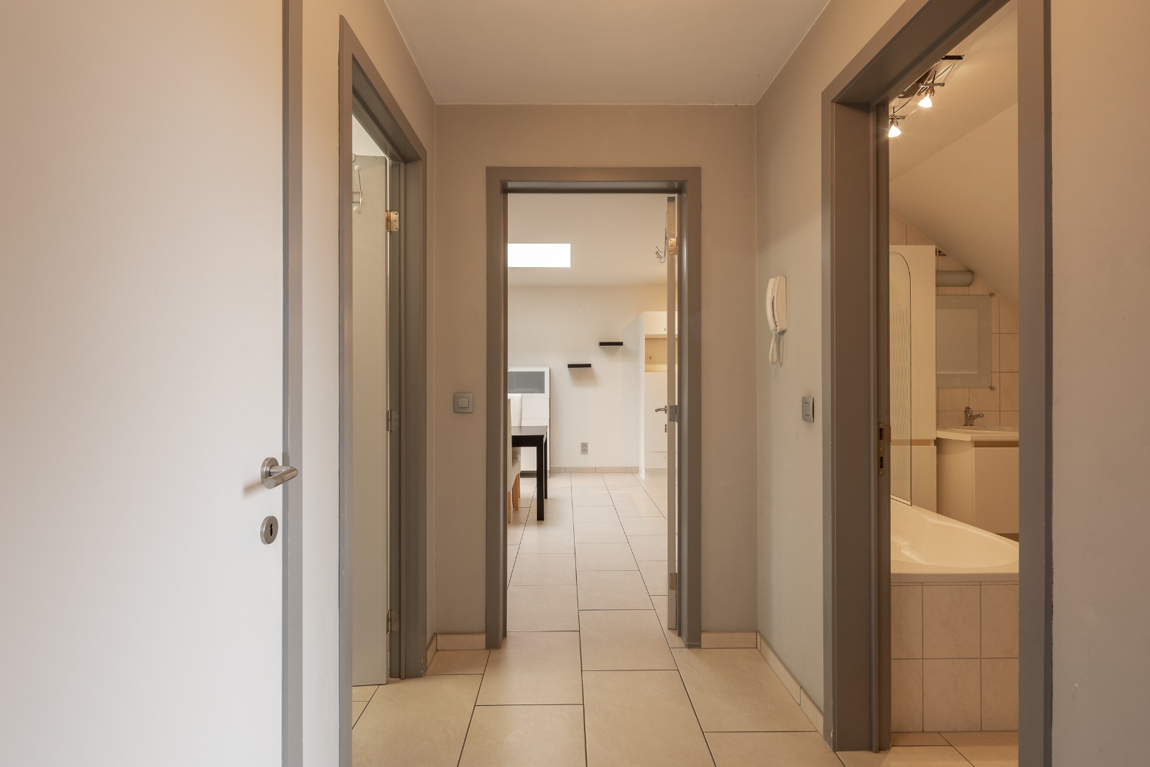 Eens je het appartement binnenkomt tref je onmiddellijk de inkomhal die verbinding geeft aan een apart toilet, het terras, aparte berging en de badkamer met enkele lavabo en ligbad. Verder bevindt zich de ruime, lichtrijke leefruimte met open keuken. Een groot pluspunt is hier de lichtkoepel waardoor er veel natuurlijk licht binnenkomt in het appartement. Achteraan de leefruimte beschikt het appartement over grote raampartijen.