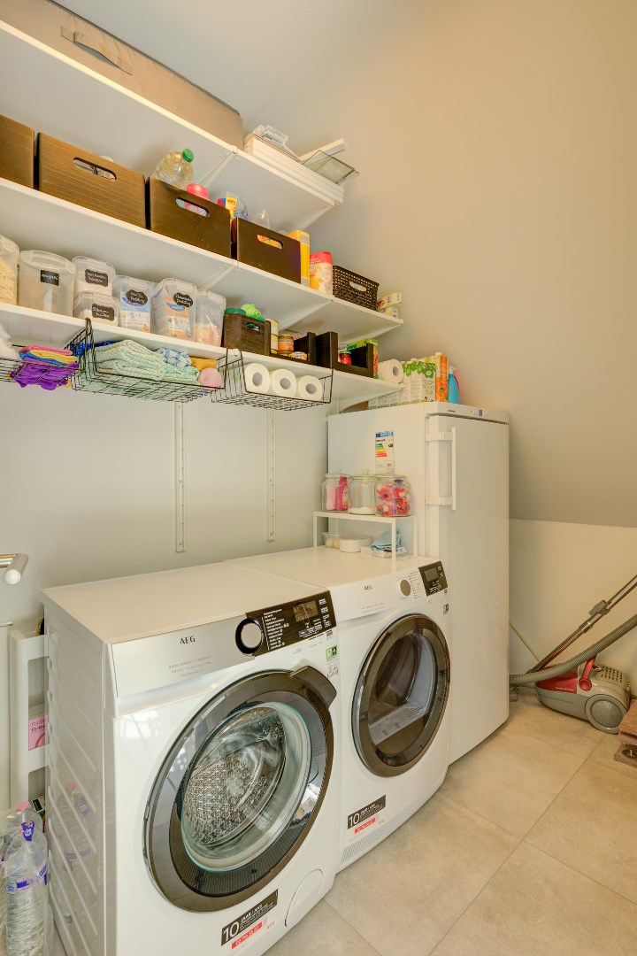 De keuken voorzien van een natuurstenen blad, combi-oven, vaatwasser en keramisch vuur is mooi verwerkt in het geheel. Vervolgens is er nog een aparte bergruimte voor wasmachine en droogkast.