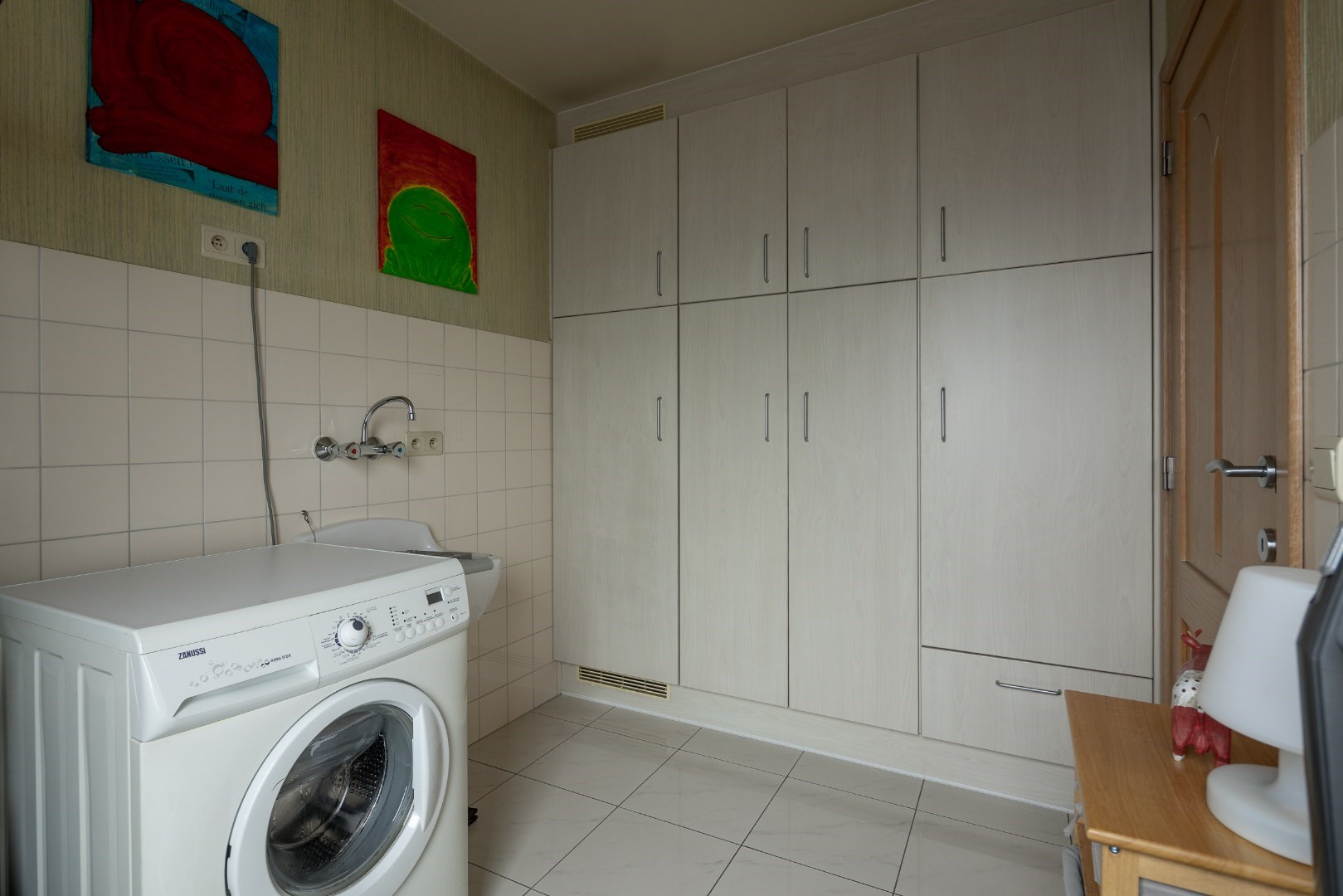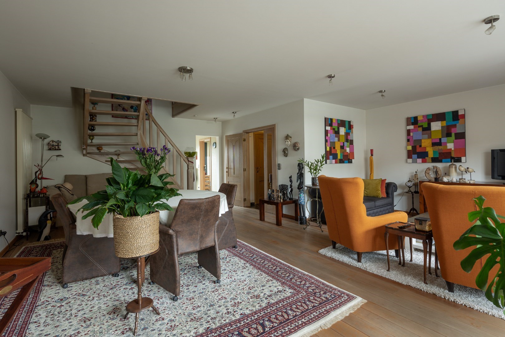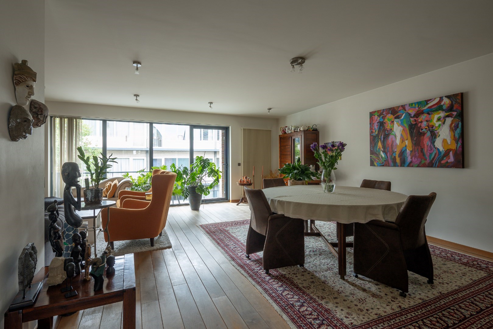 Het appartement, goed voor 170m² woonoppervlakte is voorzien van kwalitatieve materialen. Zo is er gekozen voor parket in de ruime en lichtrijke leefruimte. Grenzend aan de leefruimte is een terras aan de voorzijde met bergruimte. Vervolgens grenst aan de andere kant de keuken, uitgerust met alle benodigdheden zoals vuur, microgolf, oven, vaatwasser en koelkast. Deze keuken grenst aan een zeer ruim terras waar je geen inkijk hebt van andere appartementen. Verder ligt hier ook een handige bergruimte met inbouwkast en diepvries. Vervolgens is er ook nog een royale inkomhal met toilet.