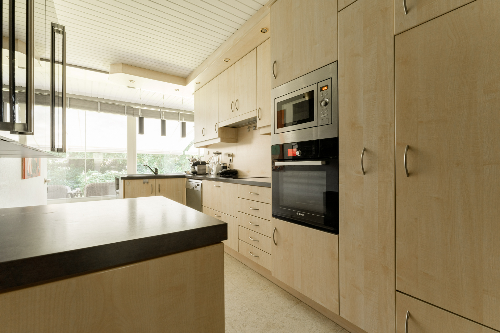 - Compleet ingebouwde keuken met vaatwasser, magnetron, oven en koelkast. Tevens inbouwkast met bergruimte en aparte gedeelte voor wasmachine en droogkast. Via een grote schuifpui is ook hier het terras toegankelijk.