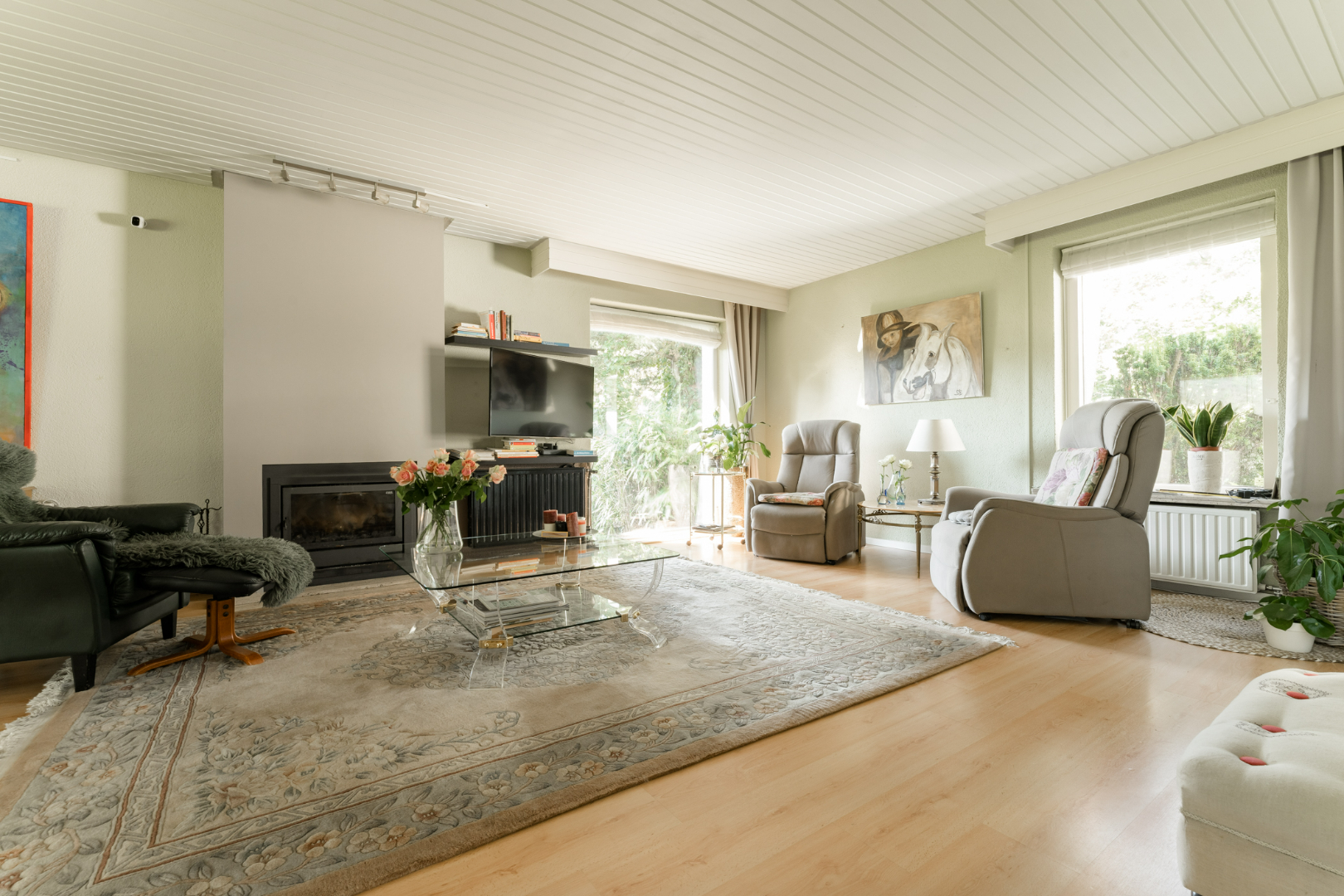 - Zeer ruime leefruimte met houtkachel en grote schuifpui richting veranda en terras. Leefruimte en verande voorzien van schuifbare gaasdeuren.