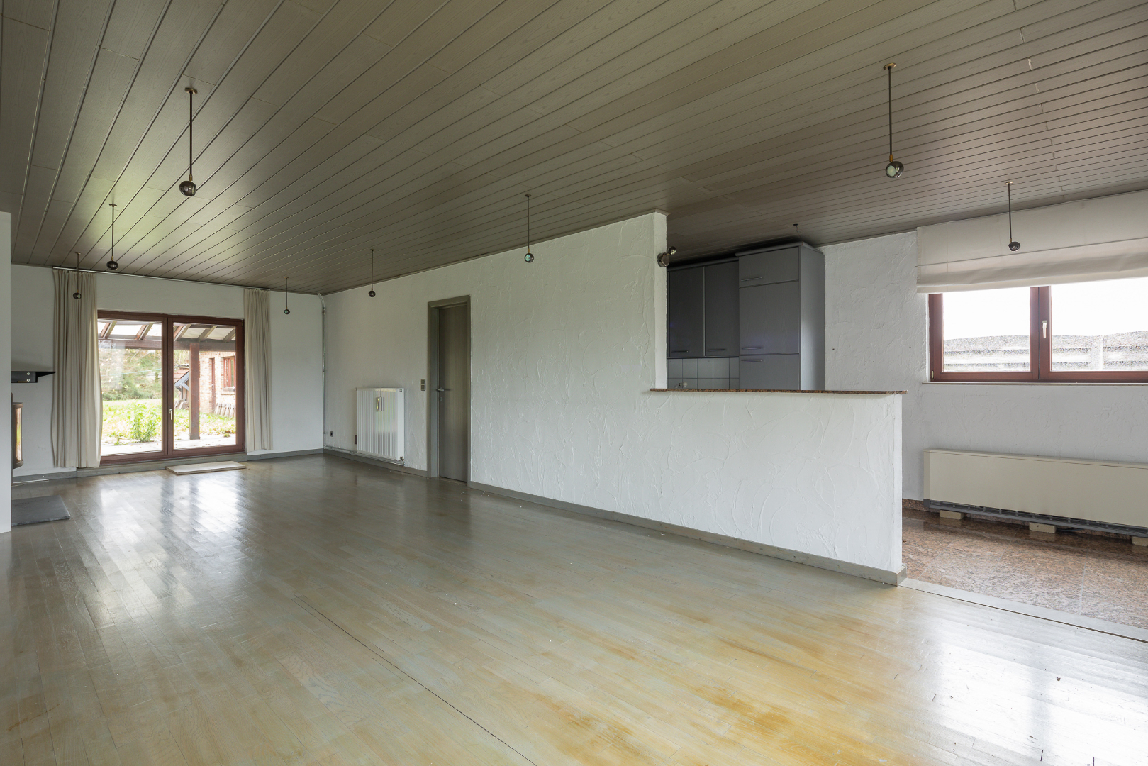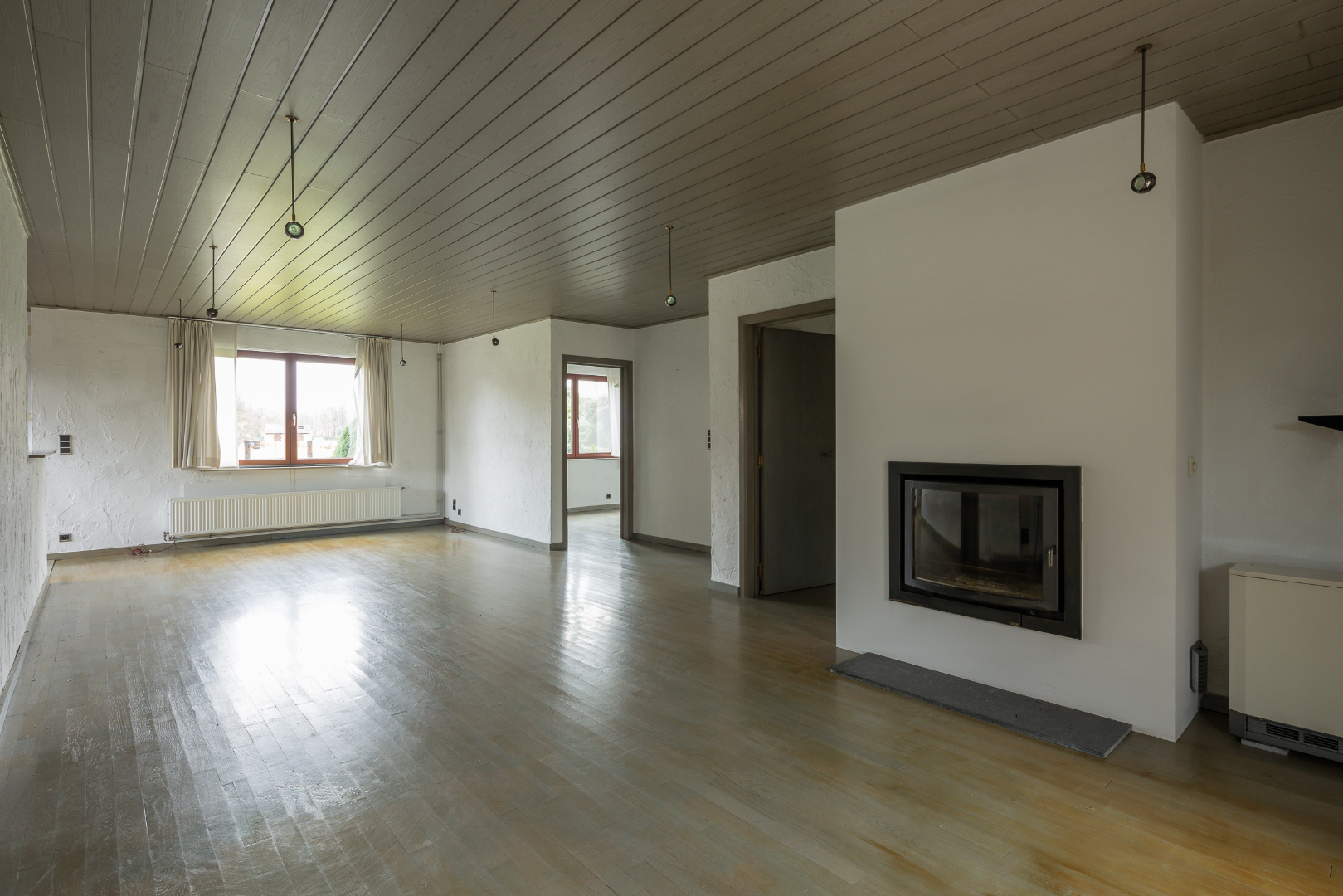 Gelijkvloers: Inkomhal, grote open leefruimte met parketvloer, keuken, apart toilet, badkamer met douche, ligbad en enkele lavabo, 2 slaapkamers.