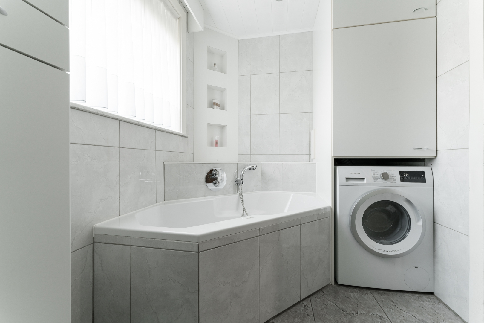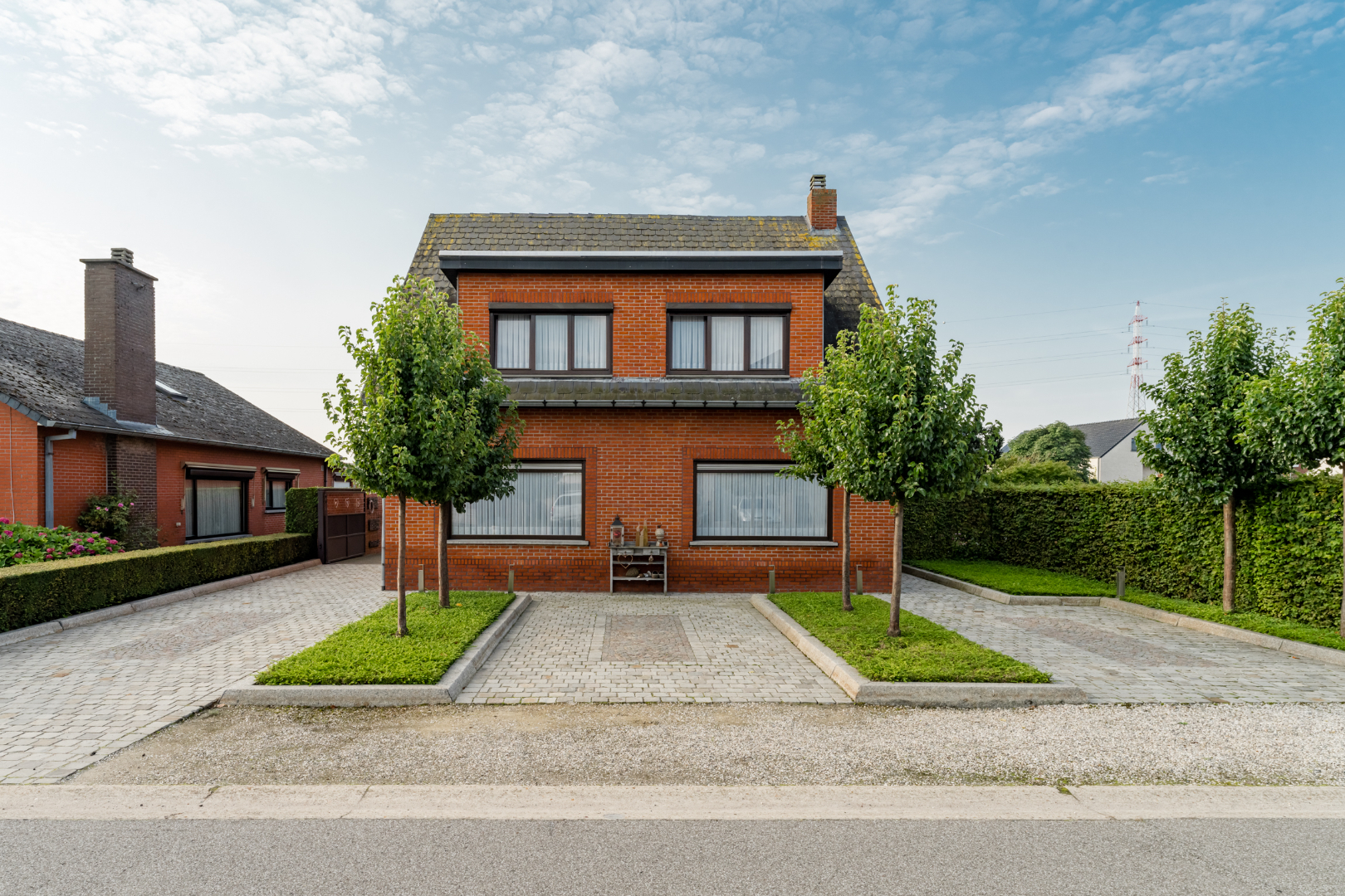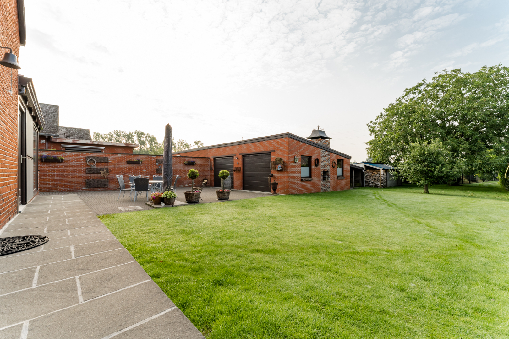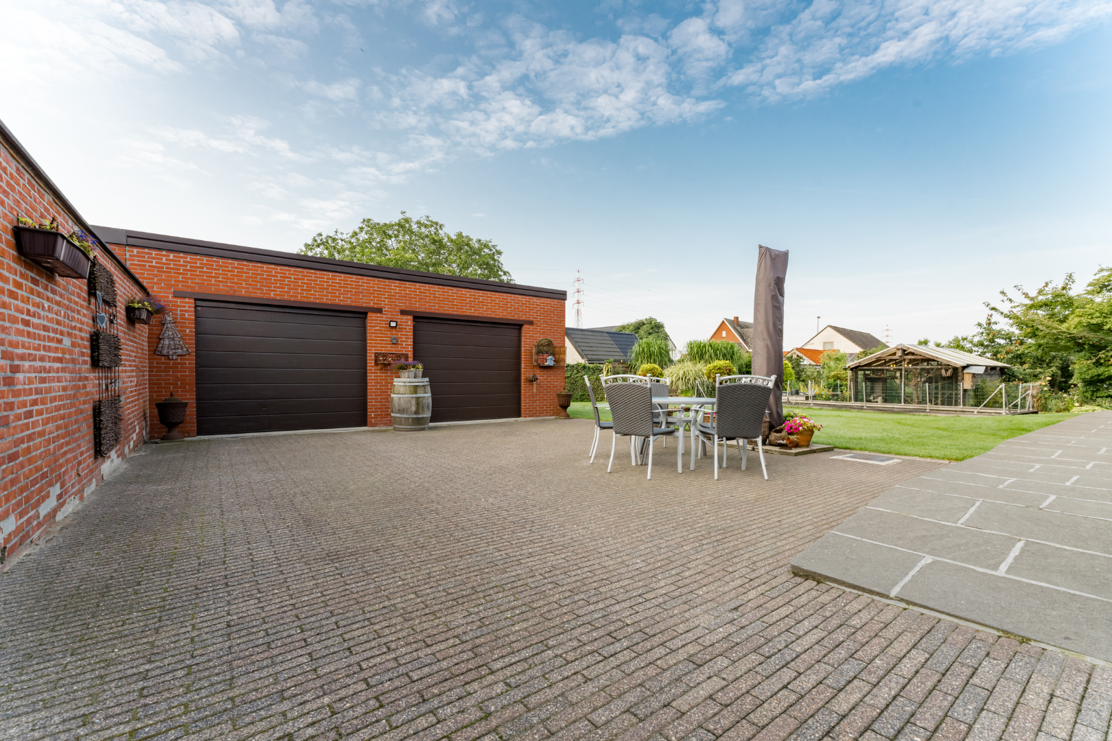 Buiten beschikt de woning over een automatische poort, een grote dubbele garage met plaats voor 2 auto's en een extra opbergruimte.