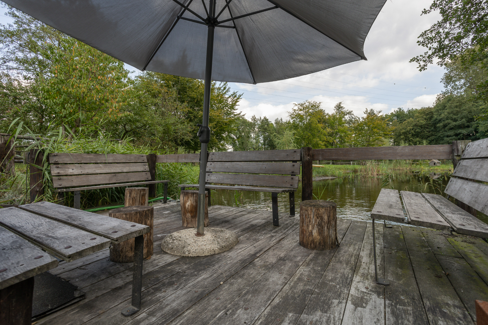 De grootste vijver (6 are groot) ligt tegen het huis en is altijd gevuld met een levendig schouwspel van vogels en vissen. Het waterterras geeft in de hete zomers een aangename plek om te verpozen.