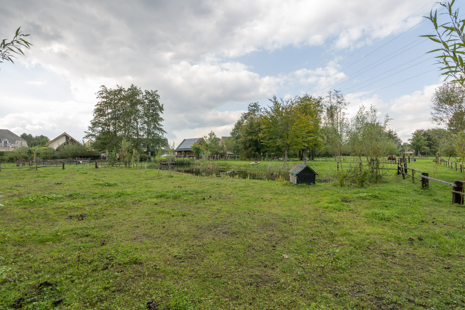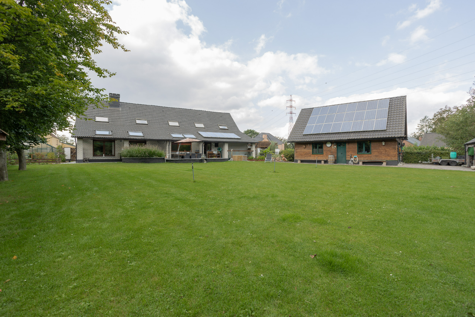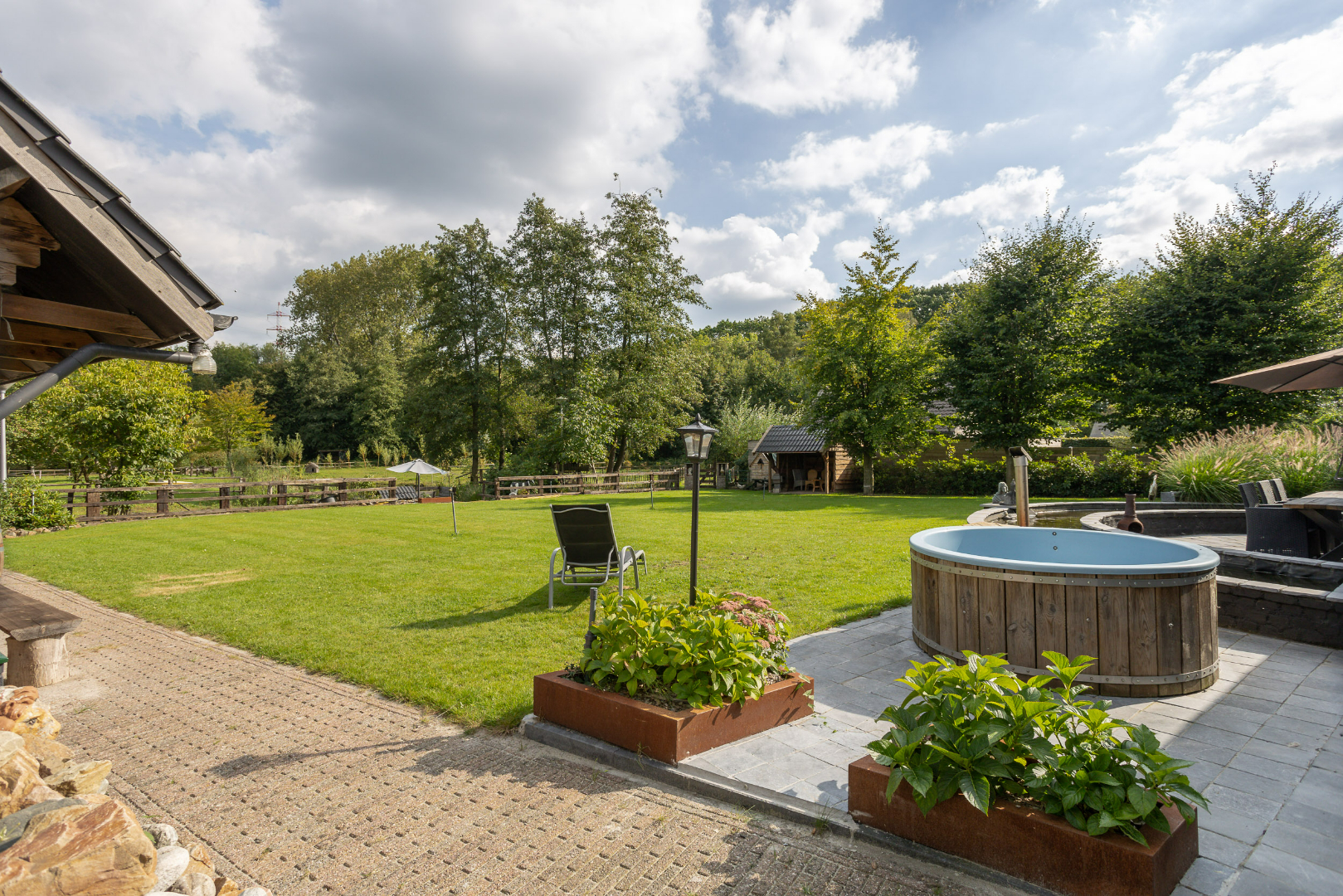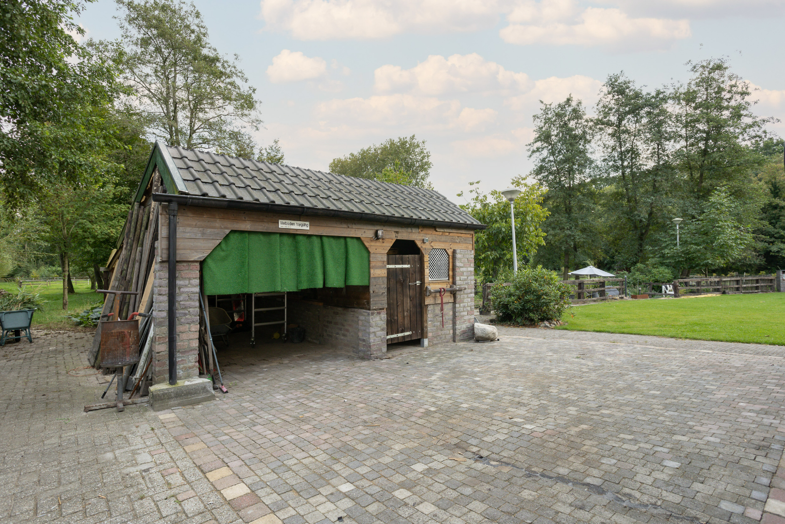 Aan de achterkant van het huis zijn er verschillende plekken om jezelf en je bezoekers te verrijken met een prachtige uitzicht op de weilanden, de grote vijver en de boompartijen. Zo is er ook een bijgebouw met eigen leefruimte, badkamer met toilet en douche, berging en twee ruime slaapkamers. Ook zijn er nog andere opbergruimtes en cosy zithoekjes gecreëerd in de tuin. Daarnaast is er achter het bijgebouw een paardenstal, een berging voor tuingereedschap en een houtopslag.
