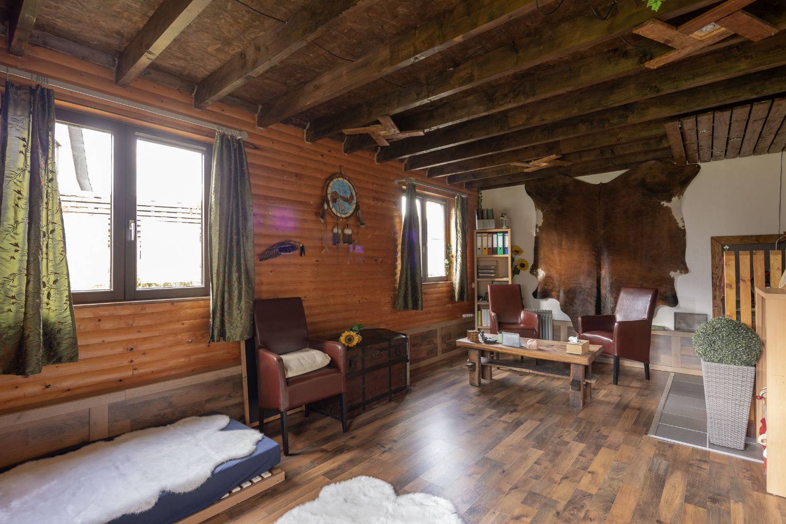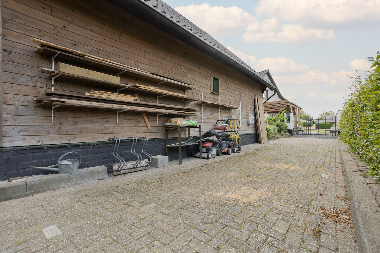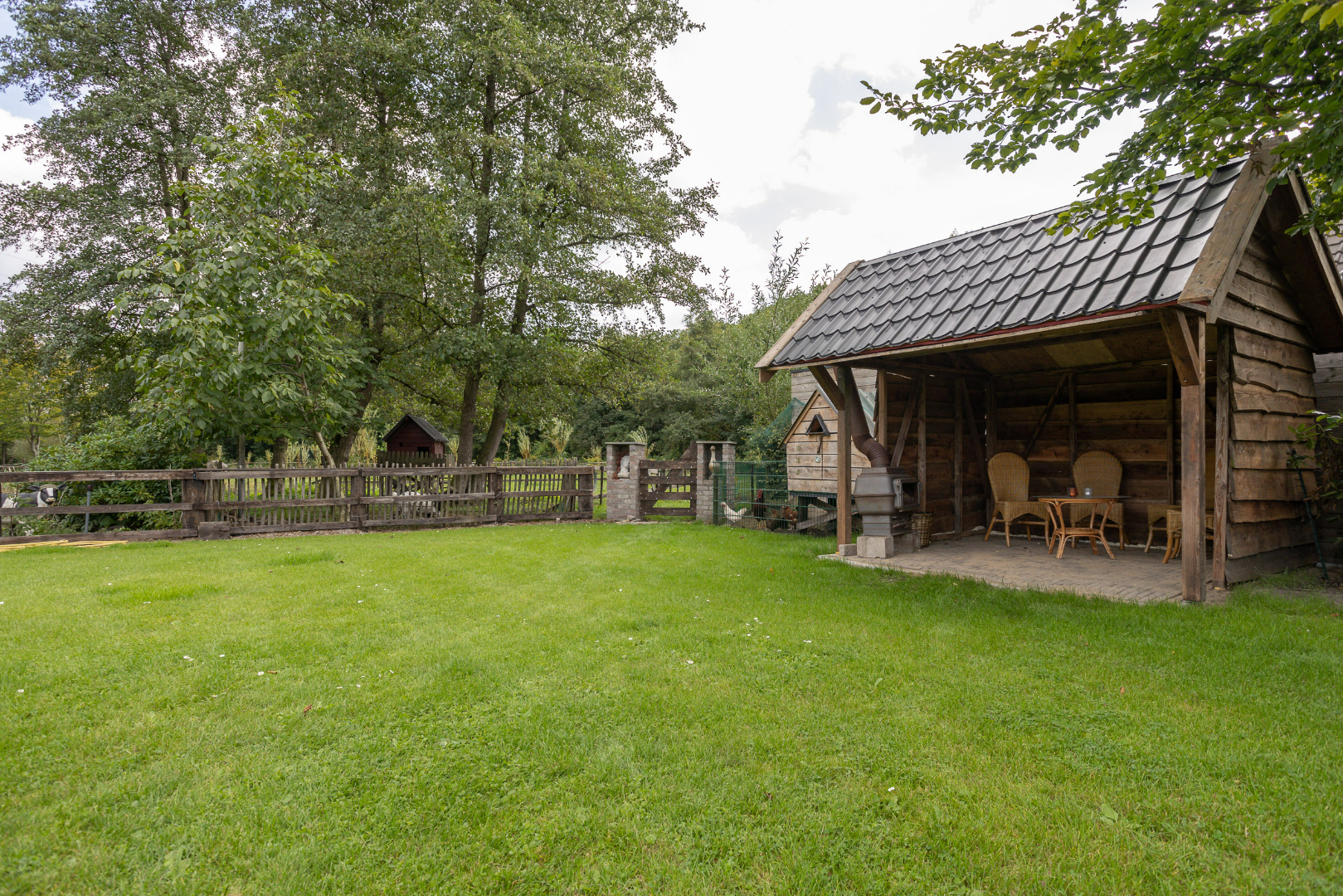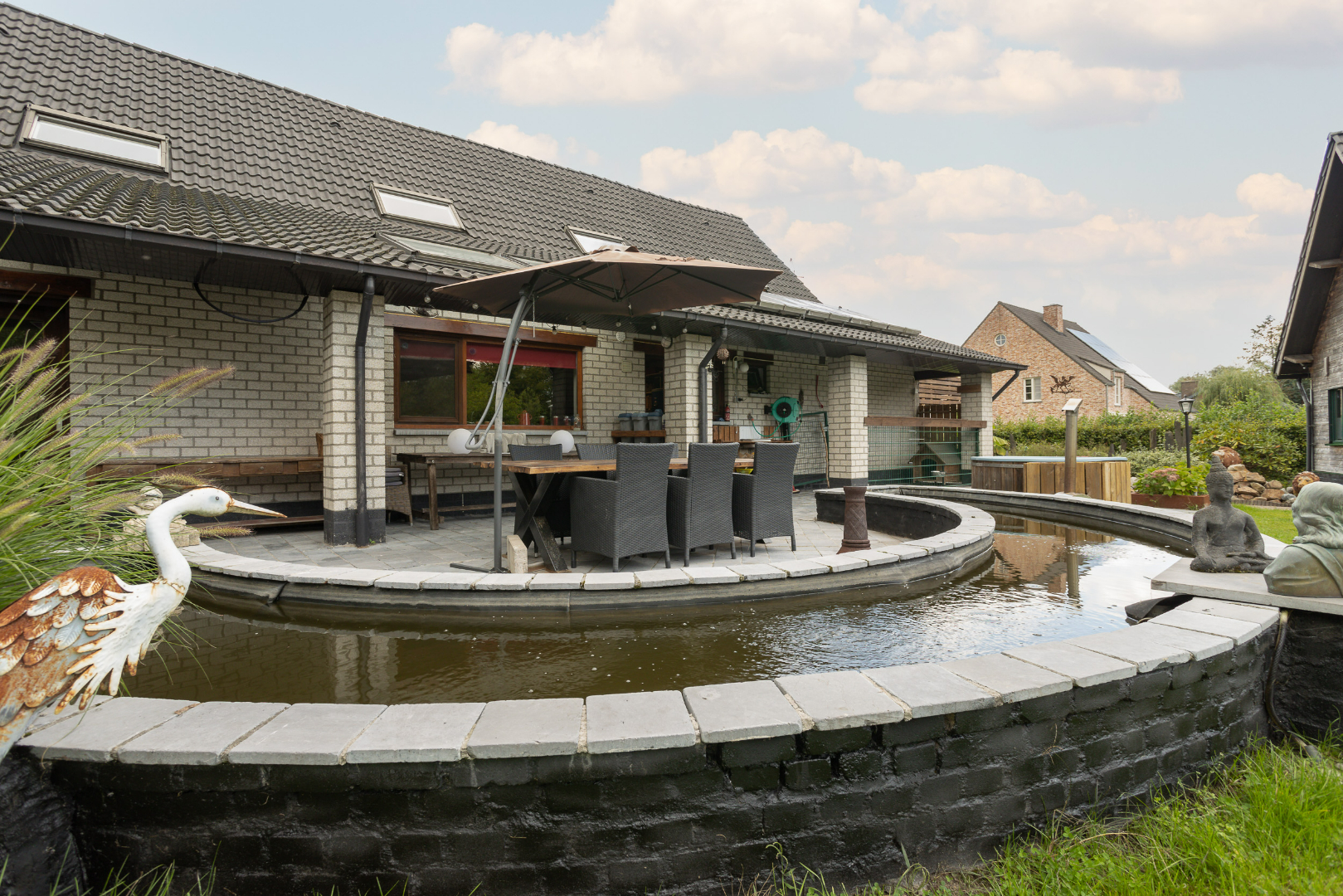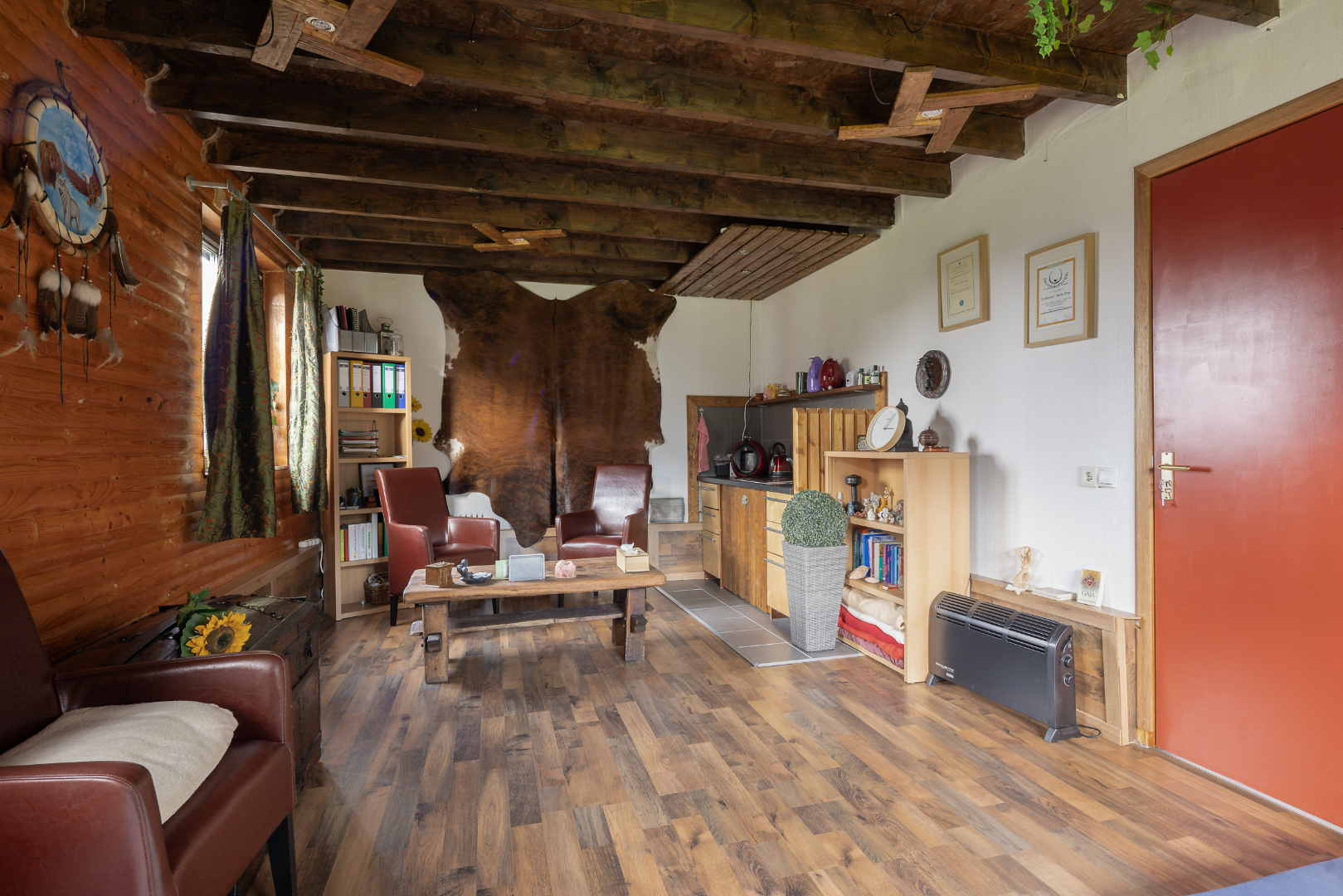 Aan de achterkant van het huis zijn er verschillende plekken om jezelf en je bezoekers te verrijken met een prachtige uitzicht op de weilanden, de grote vijver en de boompartijen. Zo is er ook een bijgebouw met eigen leefruimte, badkamer met toilet en douche, berging en twee ruime slaapkamers. Ook zijn er nog andere opbergruimtes en cosy zithoekjes gecreëerd in de tuin. Daarnaast is er achter het bijgebouw een paardenstal, een berging voor tuingereedschap en een houtopslag.