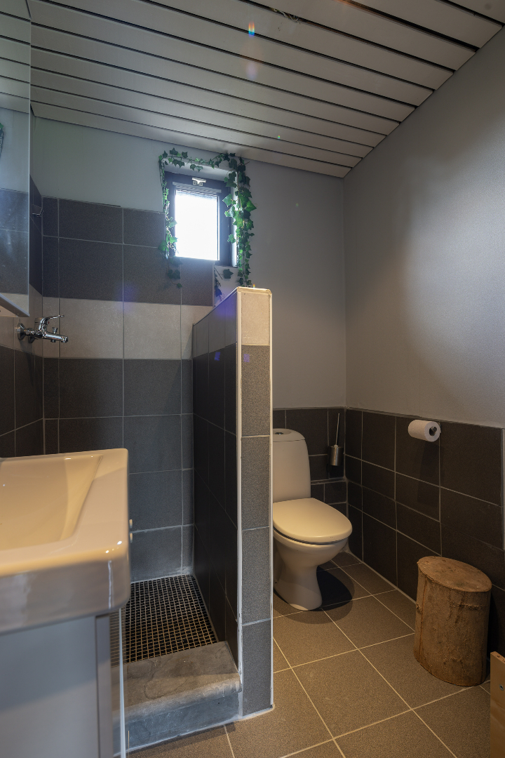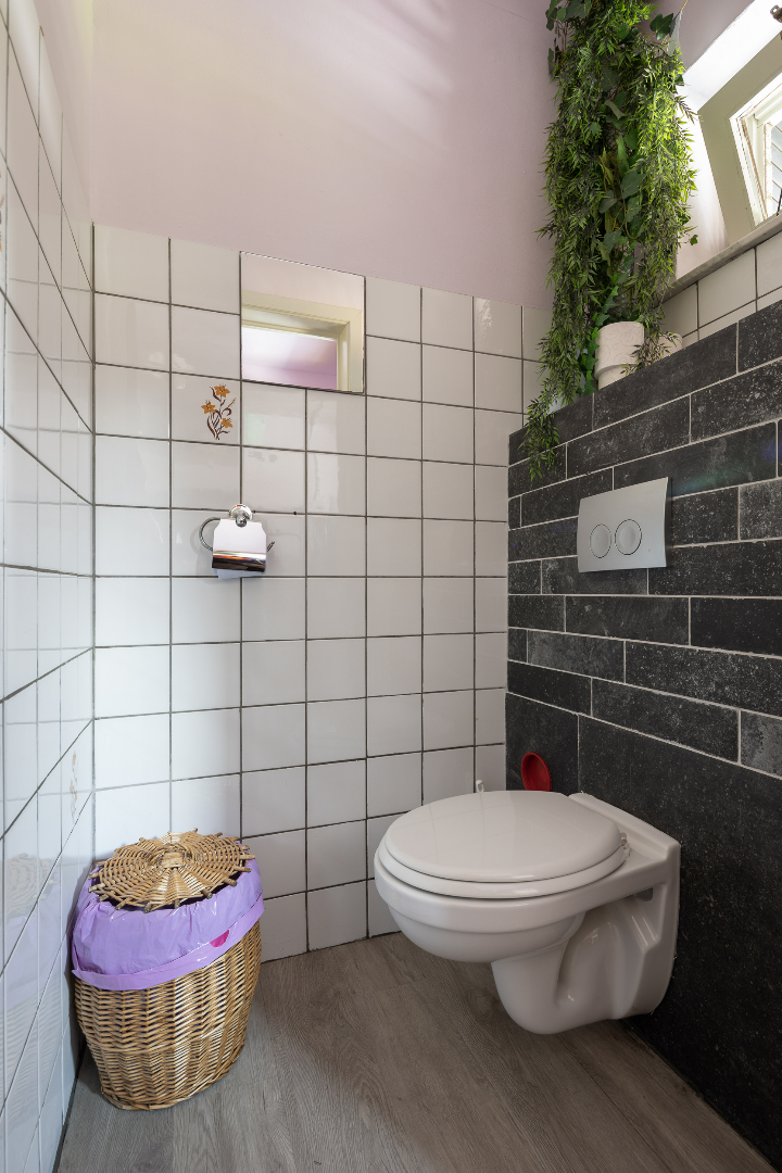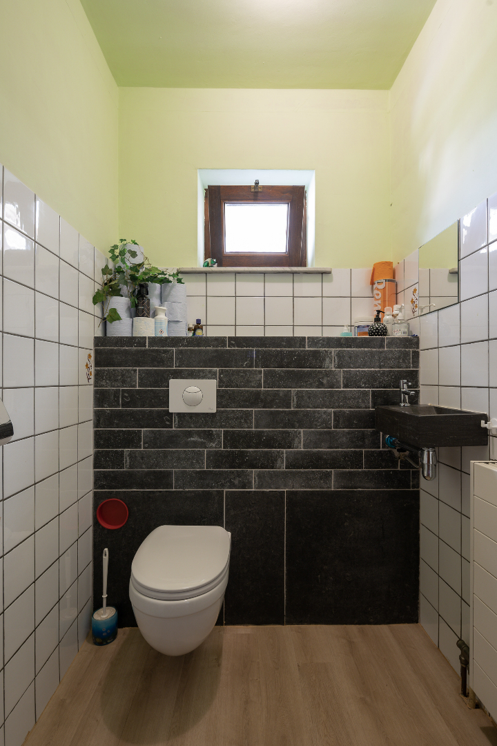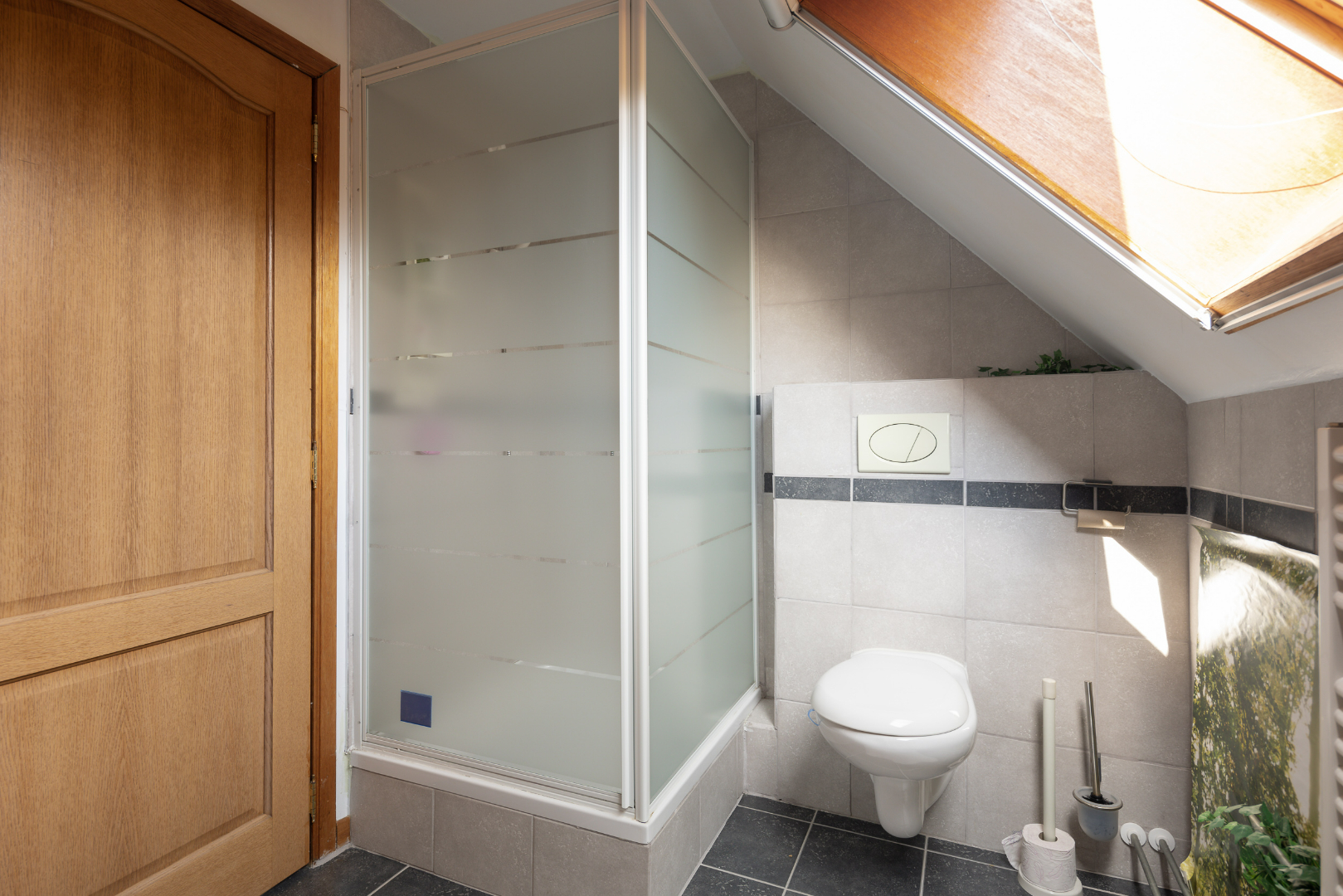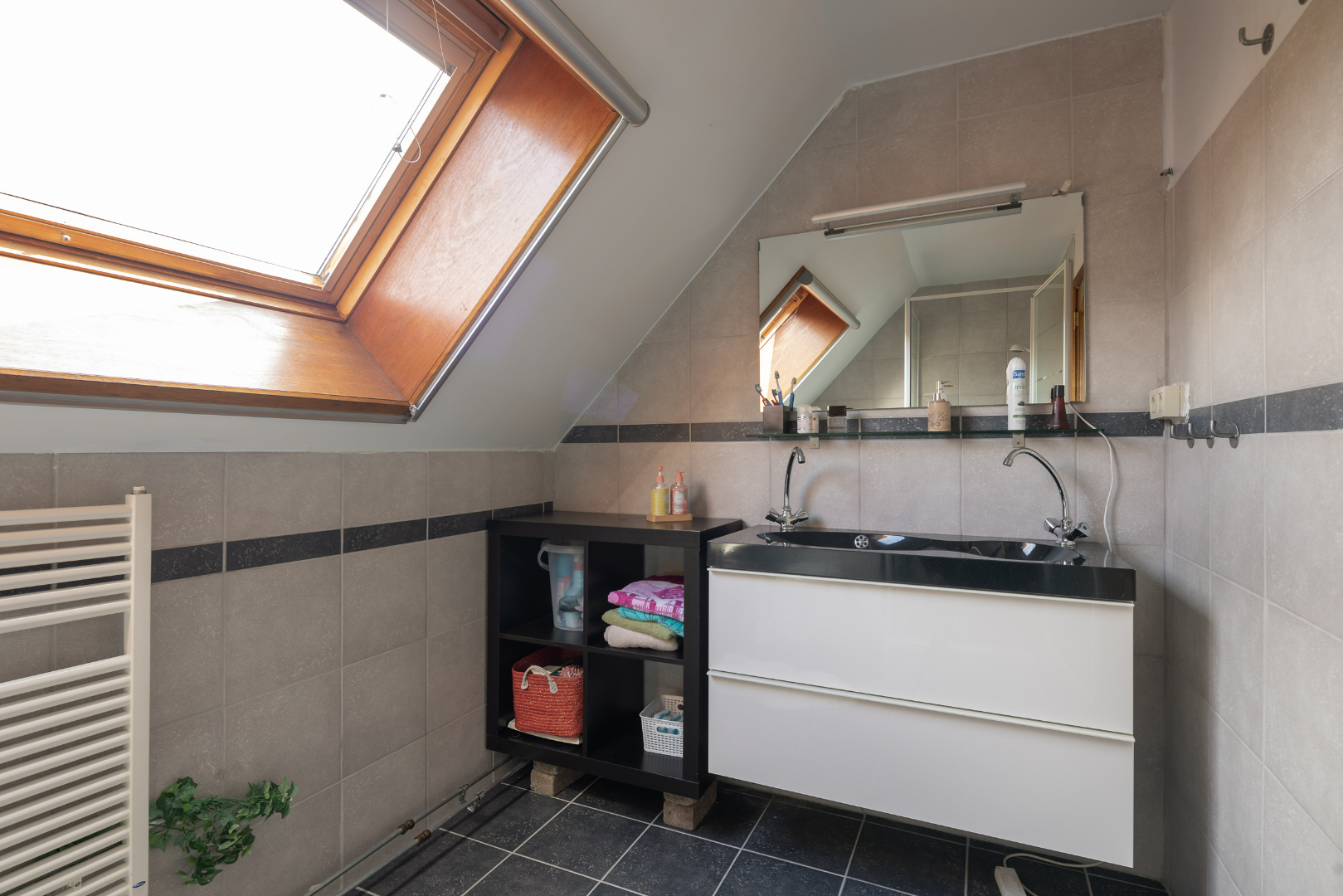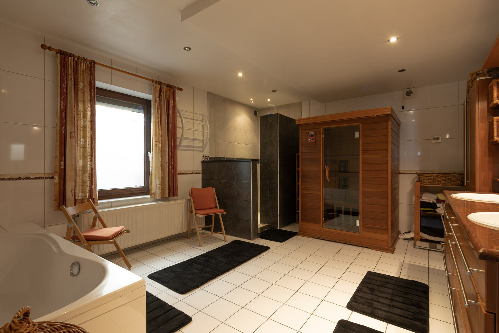 Daarnaast zijn er 2 badkamers (één gelijkvloers en één boven). Gelijkvloers is de badkamer volledig betegeld en zijn er twee lavabo's, een bad, douche en sauna. Op verdiep is de badkamer in 2017 gerenoveerd en zijn er twee lavabo's, een douche en toilet.