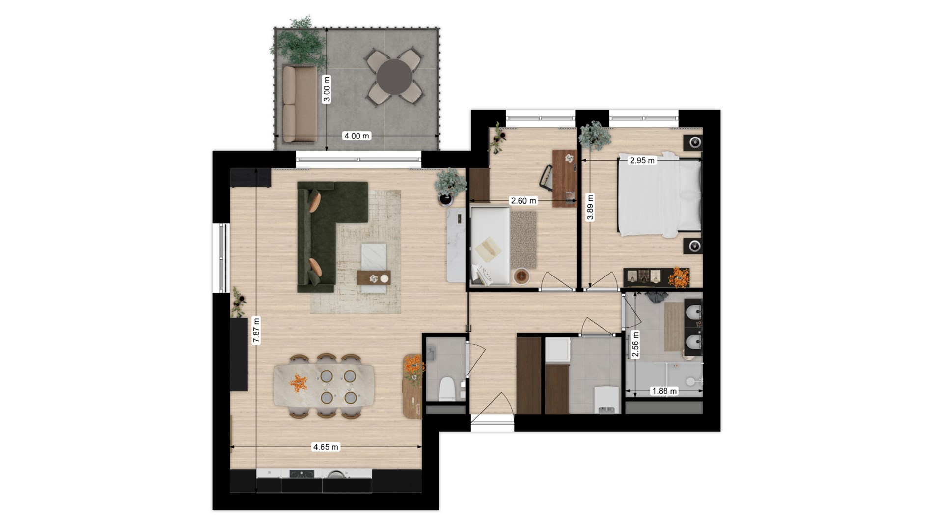 Dit appartement, goed voor 94,40m² woonoppervlakte beschikt over twee slaapkamers. De leefruimte is ruim 40m² groot, heeft aanpalend een terras van 12,51m² en heeft een eigen dakterras van maar liefst 35,77m²!