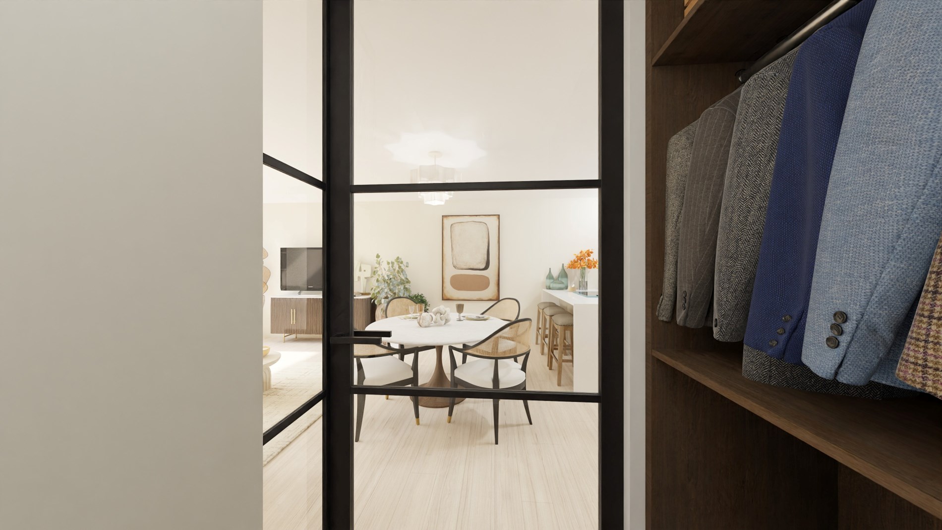 De leefruimte is mooi open, voorzien van een keuken met eiland. Verder vinden we nog een badkamer, berging en apart toilet terug. In de inkomhal is er een nis voorzien als vestiaire en een glazen deur tussen hal en leefruimte. Verder vinden we nog twee slaapkamers terug.
