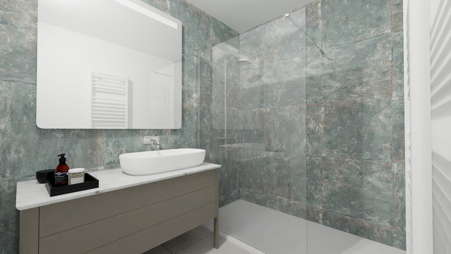 Het appartement beschikt vervolgens gelijkvloers over 3 fietsstaanplaatsen en heeft 1.200 wattpiek aan zonnepanelen. De verwarming is met een warmtepomp op basis van geothermie, waardoor er een mooi E-peil werd behaald van slechts 8!