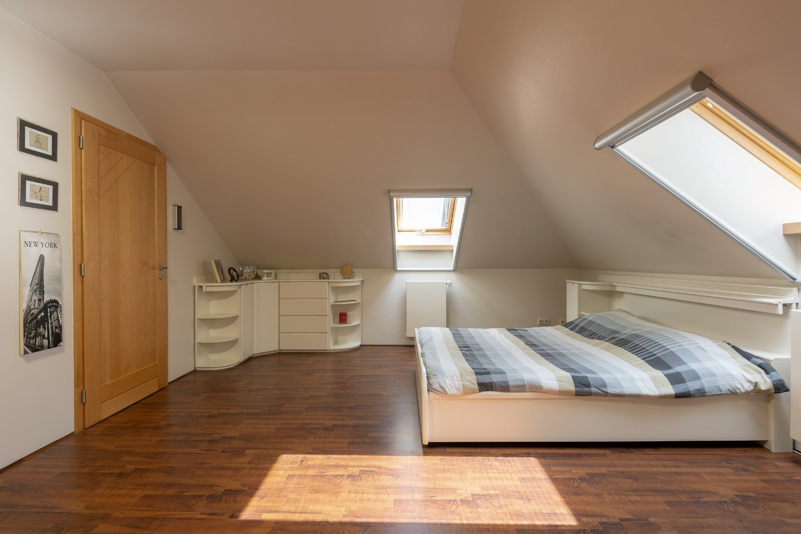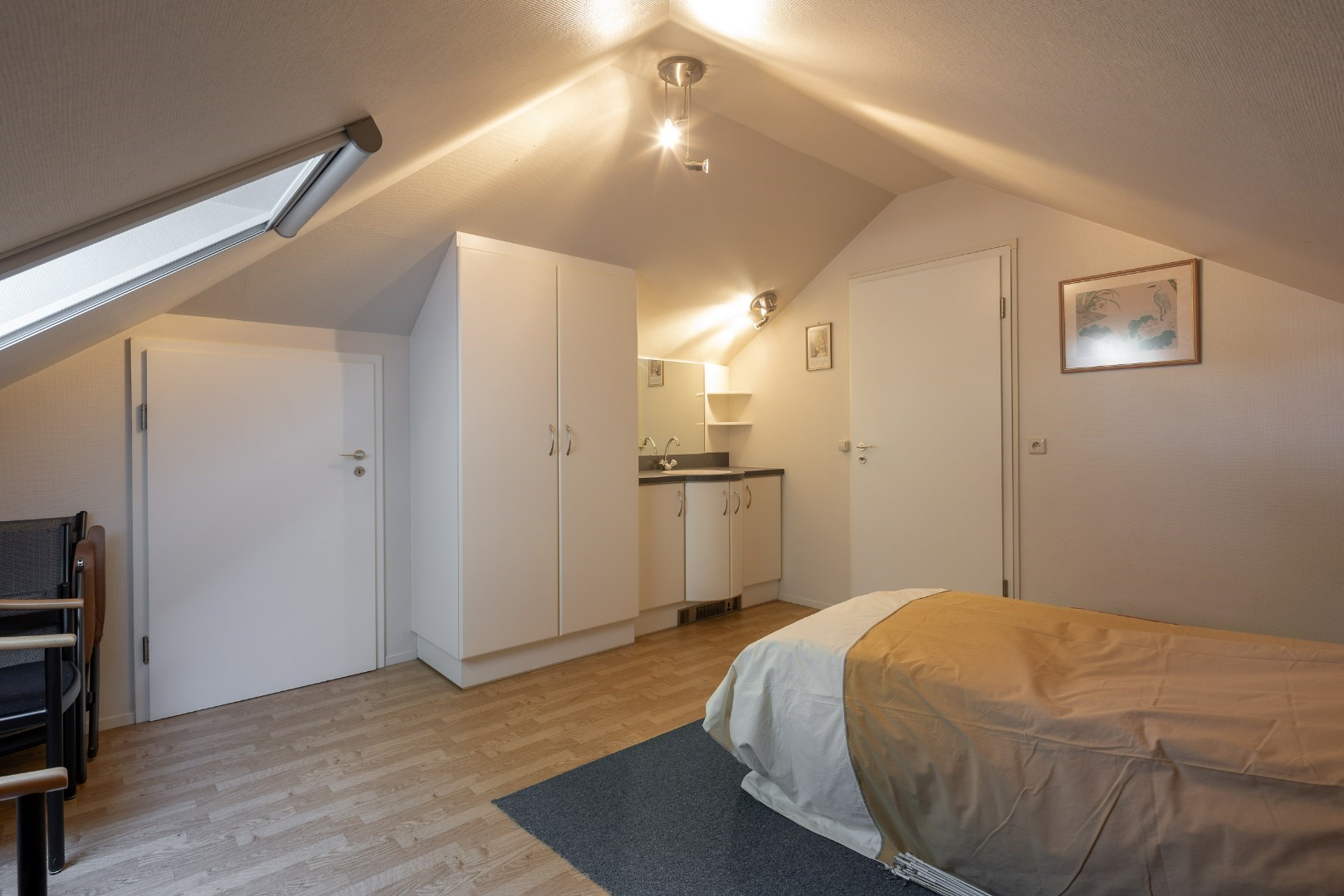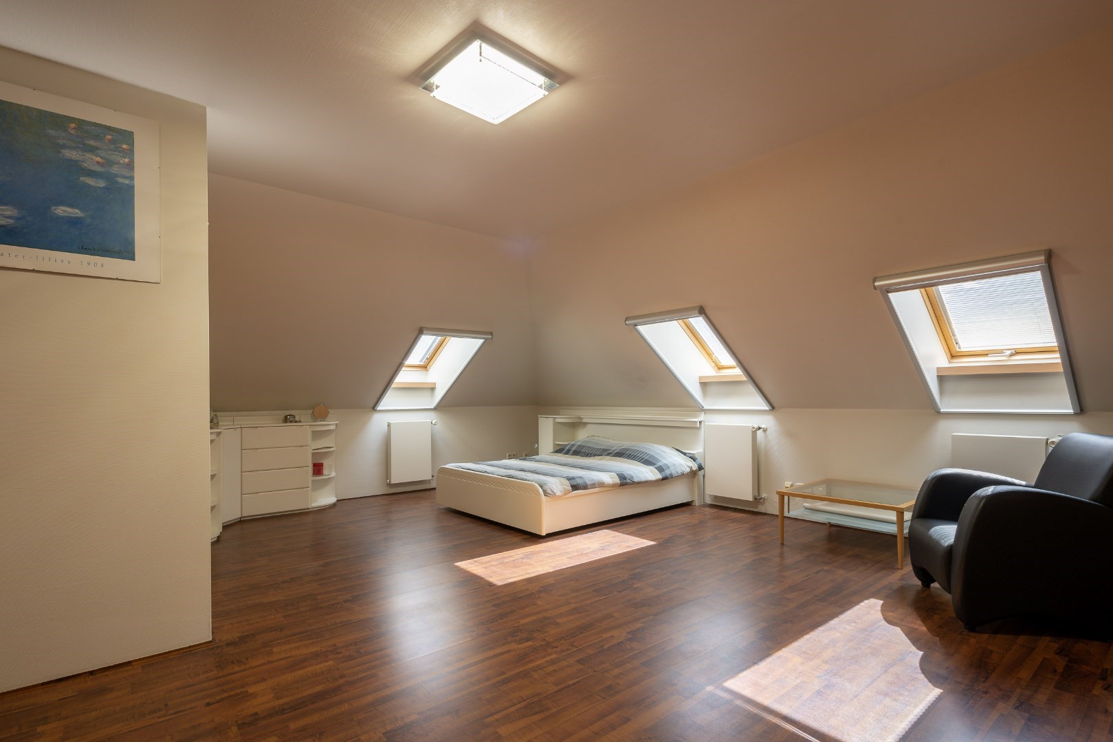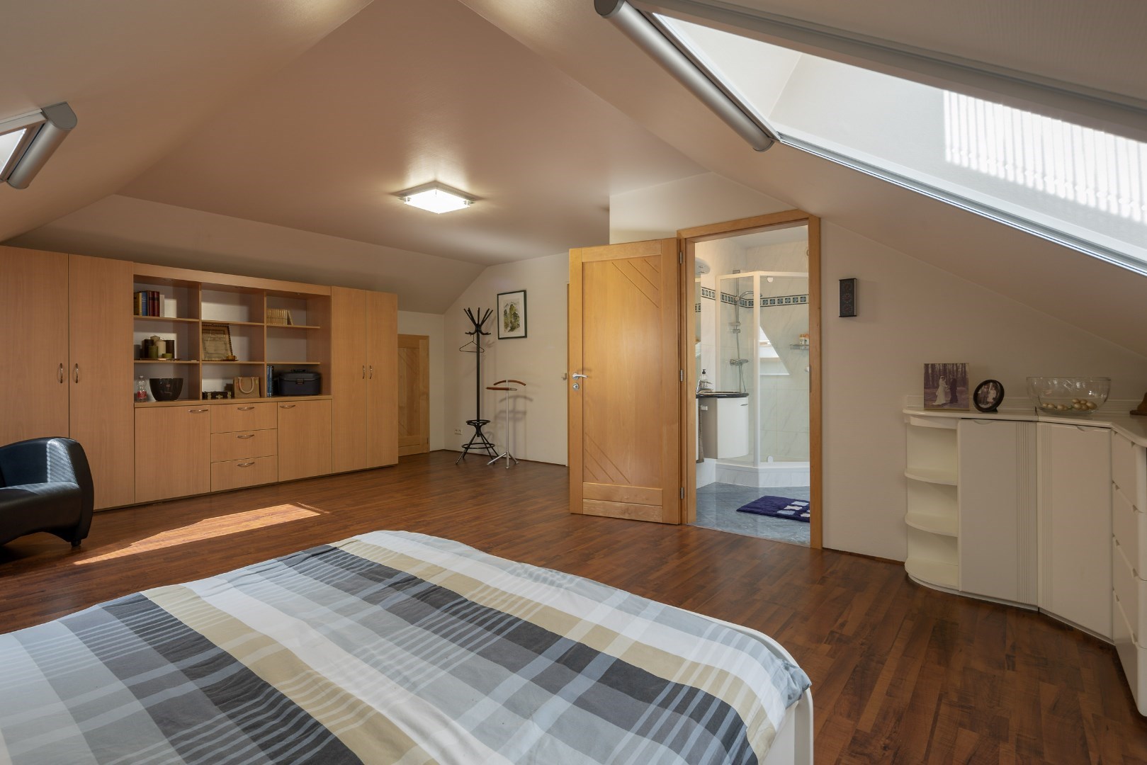 Op verdiep zijn er vervolgens nog 2 slaapkamers. De grootste slaapkamer hier is 40m² en heeft een badkamer ensuite van 10m² met toilet, wasmeubel en douche. De andere slaapkamer is 18m². Verder bevinden zich hier ook installaties van de woning die mooi zijn weggewerkt.
