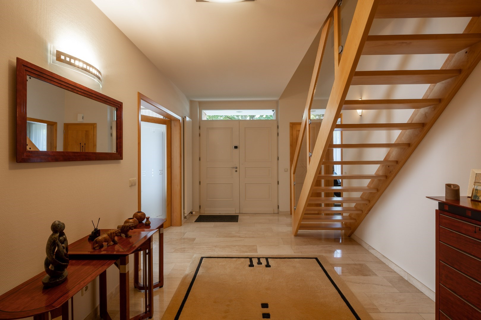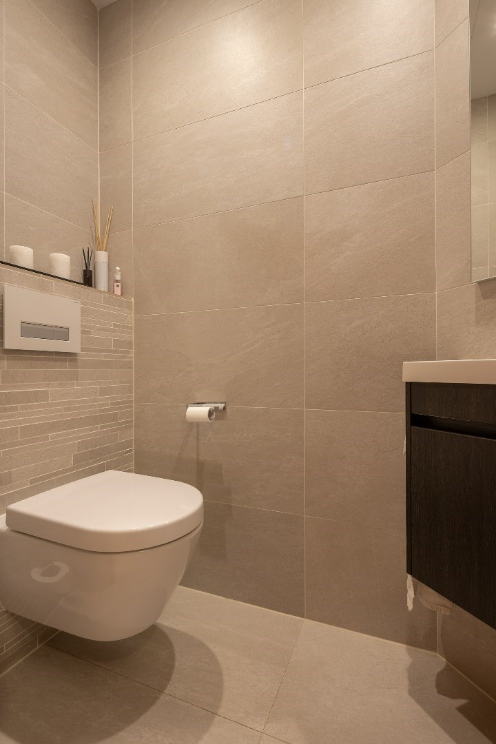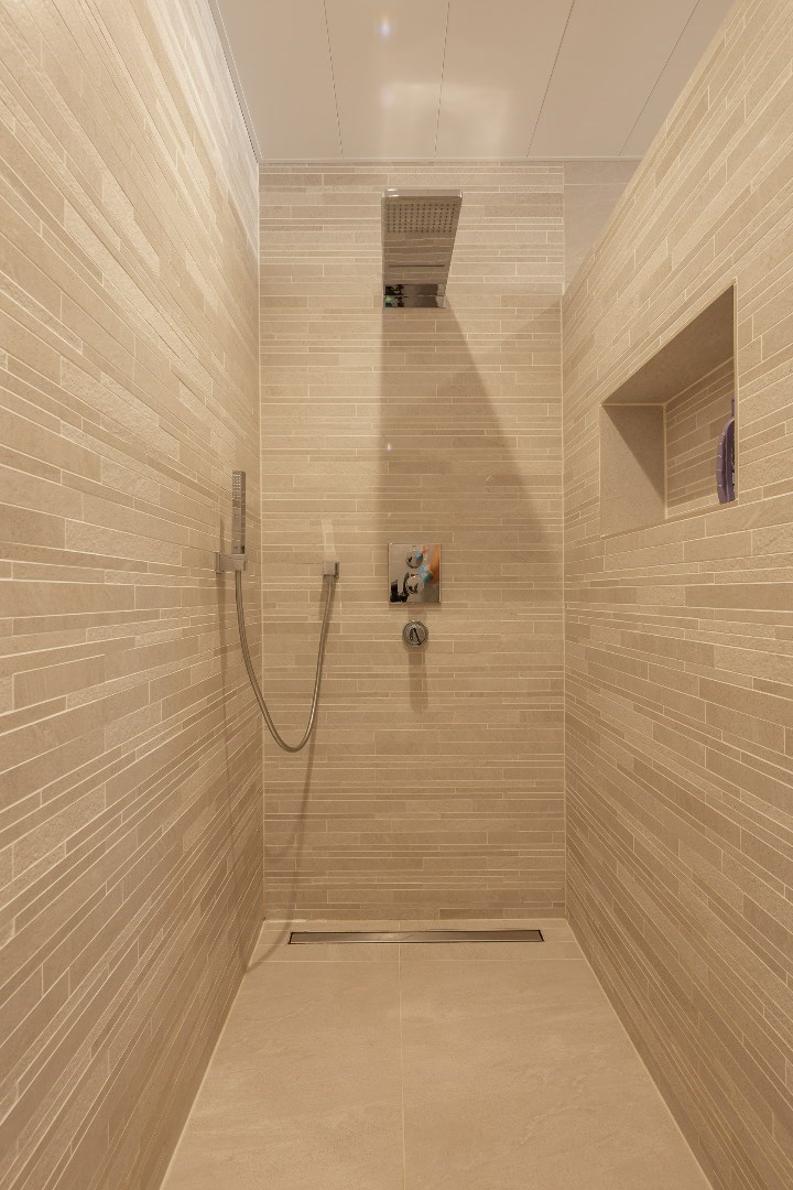 Eenmaal we de voordeur openen, komen we terecht in een grote inkomhal. Van hieruit is de mogelijkheid om naar de bureau/kleinste slaapkamer (11m²) te gaan alsook naar de master bedroom onder (20m²) met badkamer ensuite (10m²). Deze badkamer is voorzien van een toilet, dubbel wasmeubel, bad en douche.