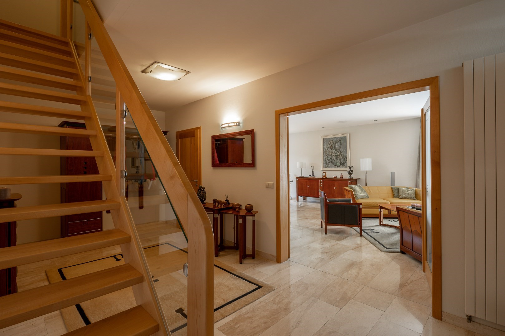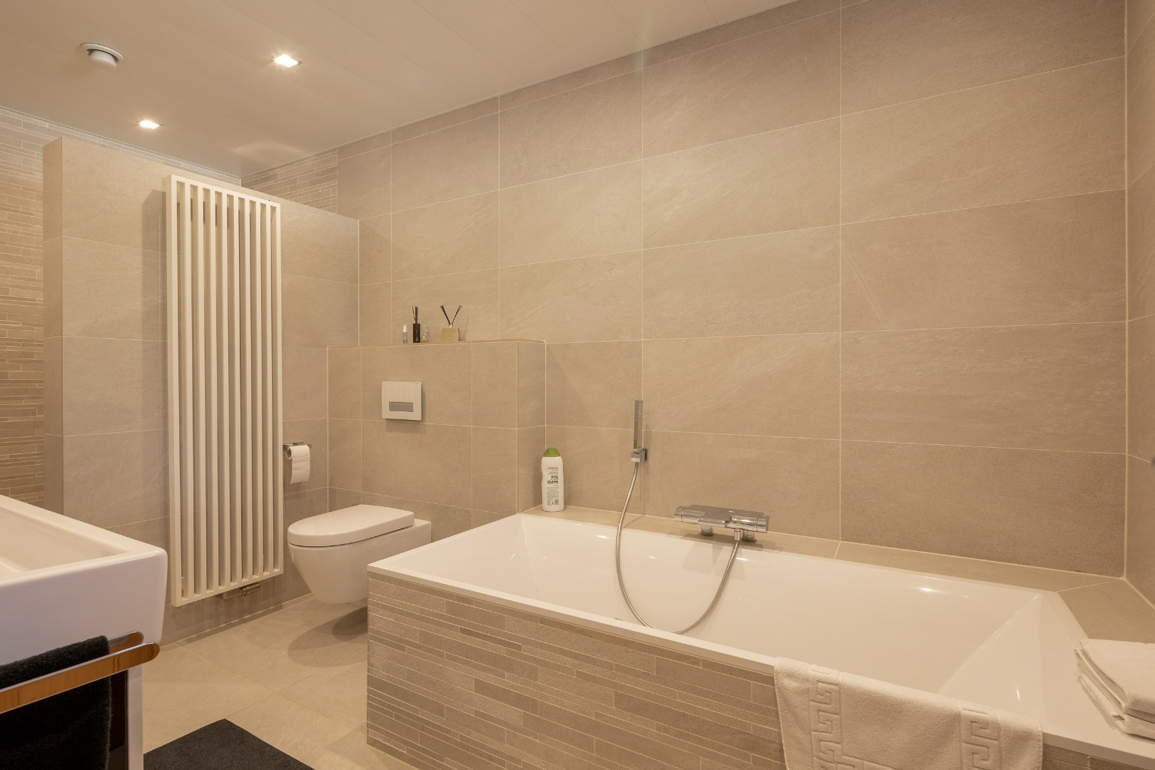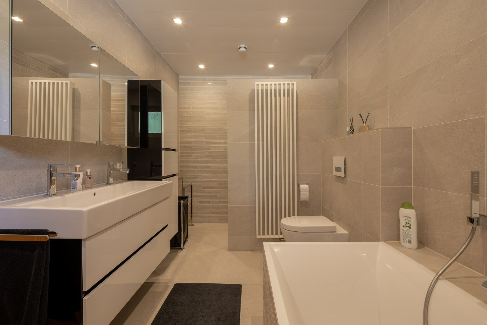 Eenmaal we de voordeur openen, komen we terecht in een grote inkomhal. Van hieruit is de mogelijkheid om naar de bureau/kleinste slaapkamer (11m²) te gaan alsook naar de master bedroom onder (20m²) met badkamer ensuite (10m²). Deze badkamer is voorzien van een toilet, dubbel wasmeubel, bad en douche.