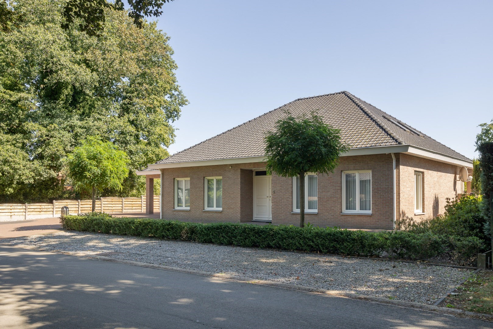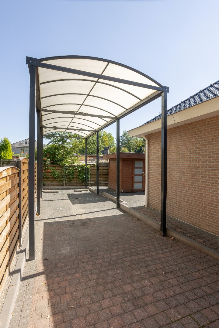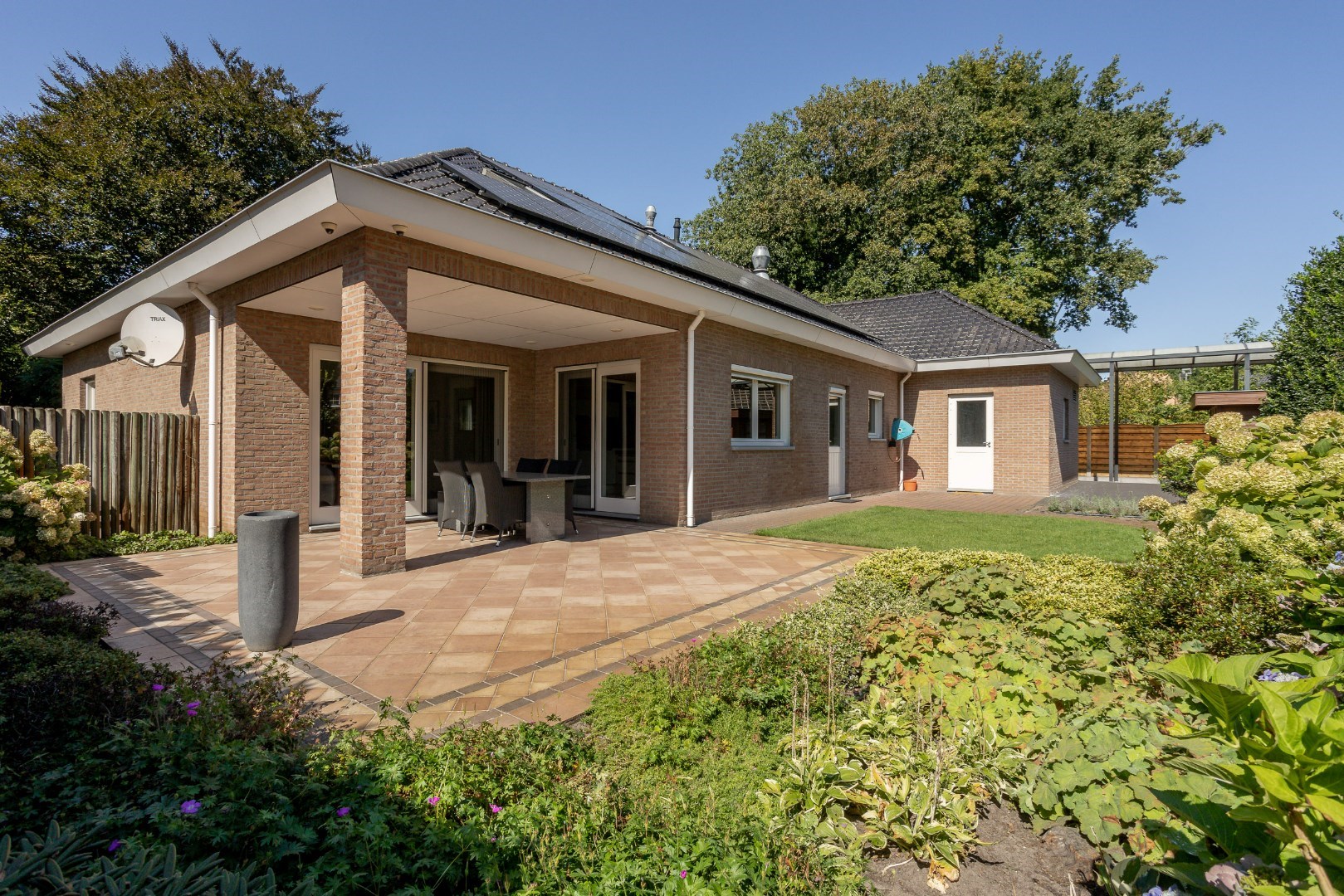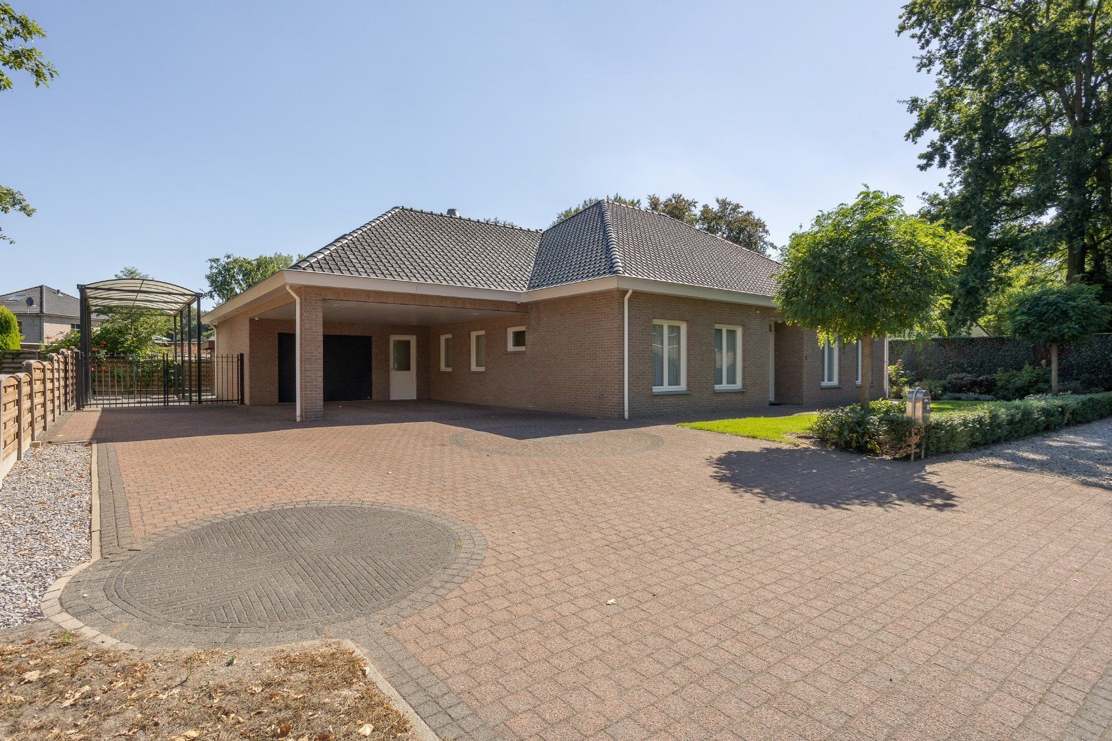 Eens we voor het huis staan, zien we een imposante voordeur, een ruim overdekt gedeelte om wagens te plaatsen, een carport voor een mobilhome en een mooie aangelegde tuin. Deze tuin beschikt over een sproei-installatie.