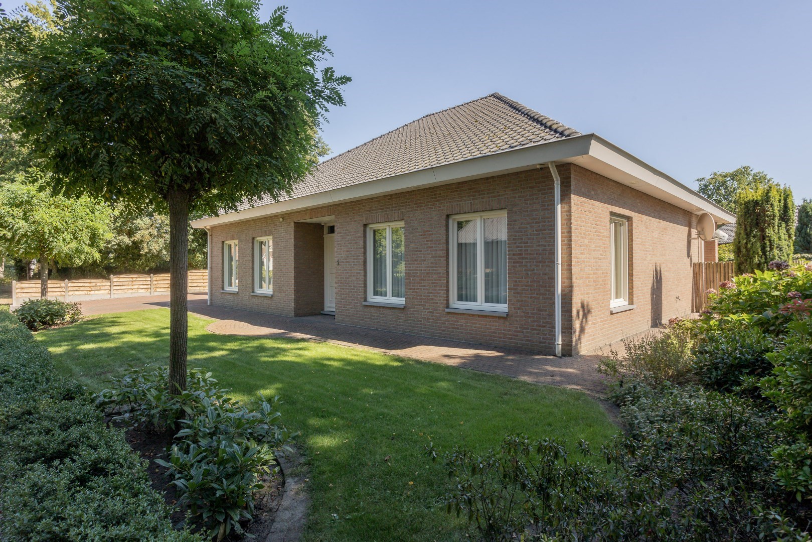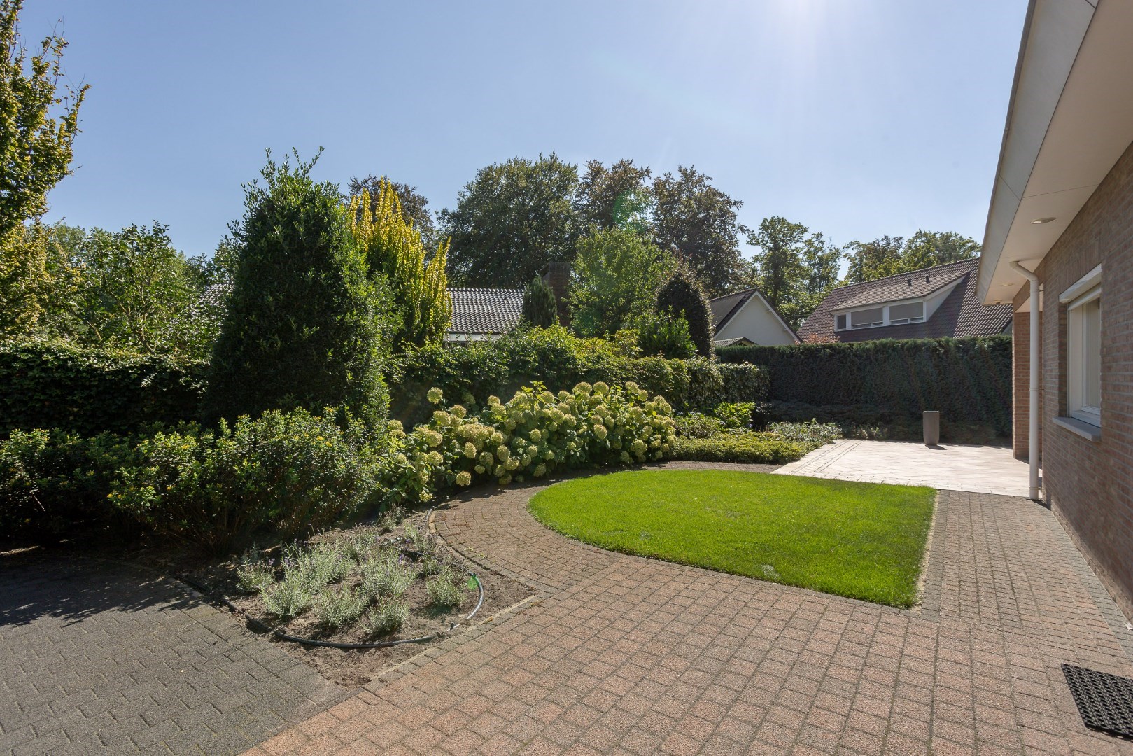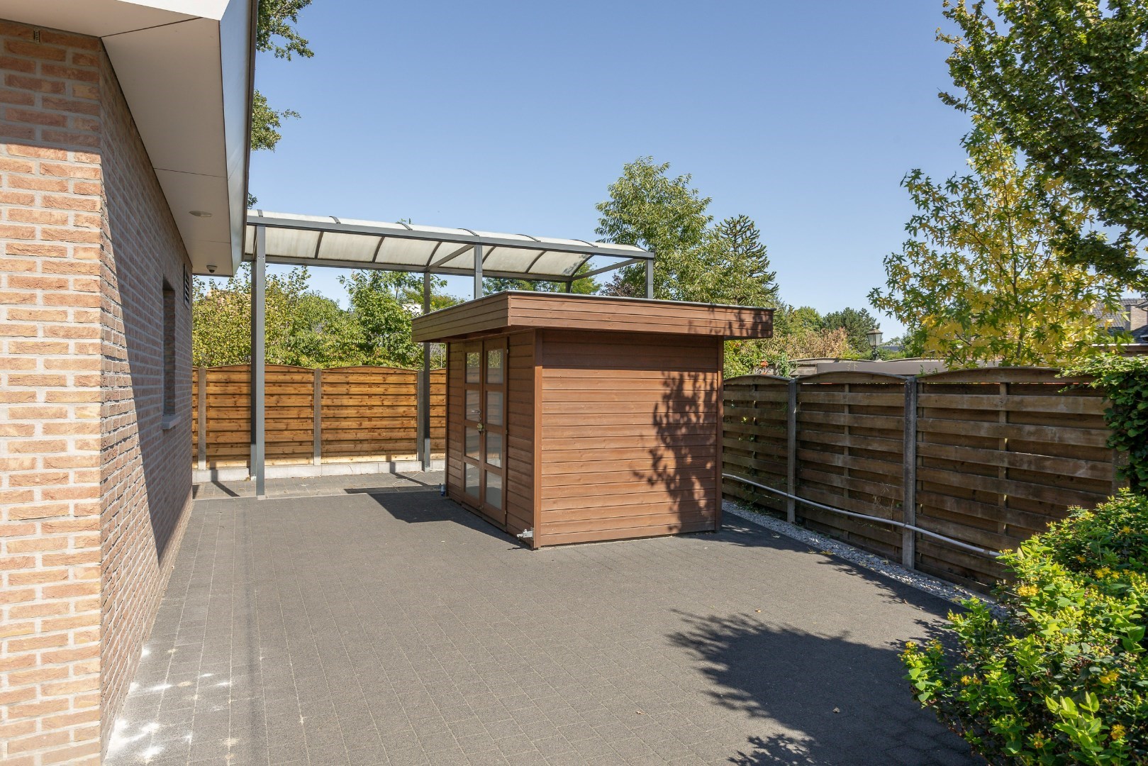 Eens we voor het huis staan, zien we een imposante voordeur, een ruim overdekt gedeelte om wagens te plaatsen, een carport voor een mobilhome en een mooie aangelegde tuin. Deze tuin beschikt over een sproei-installatie.
