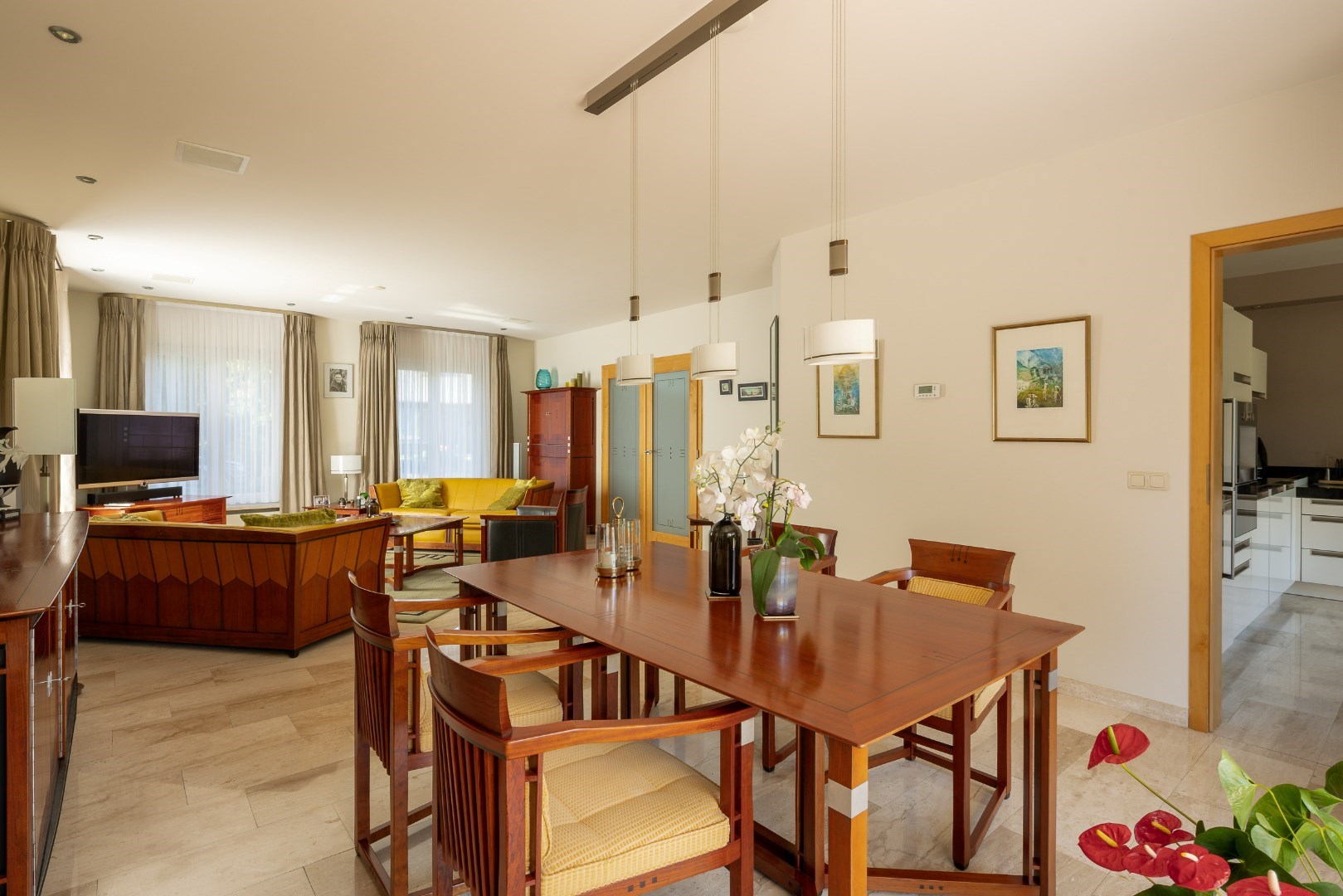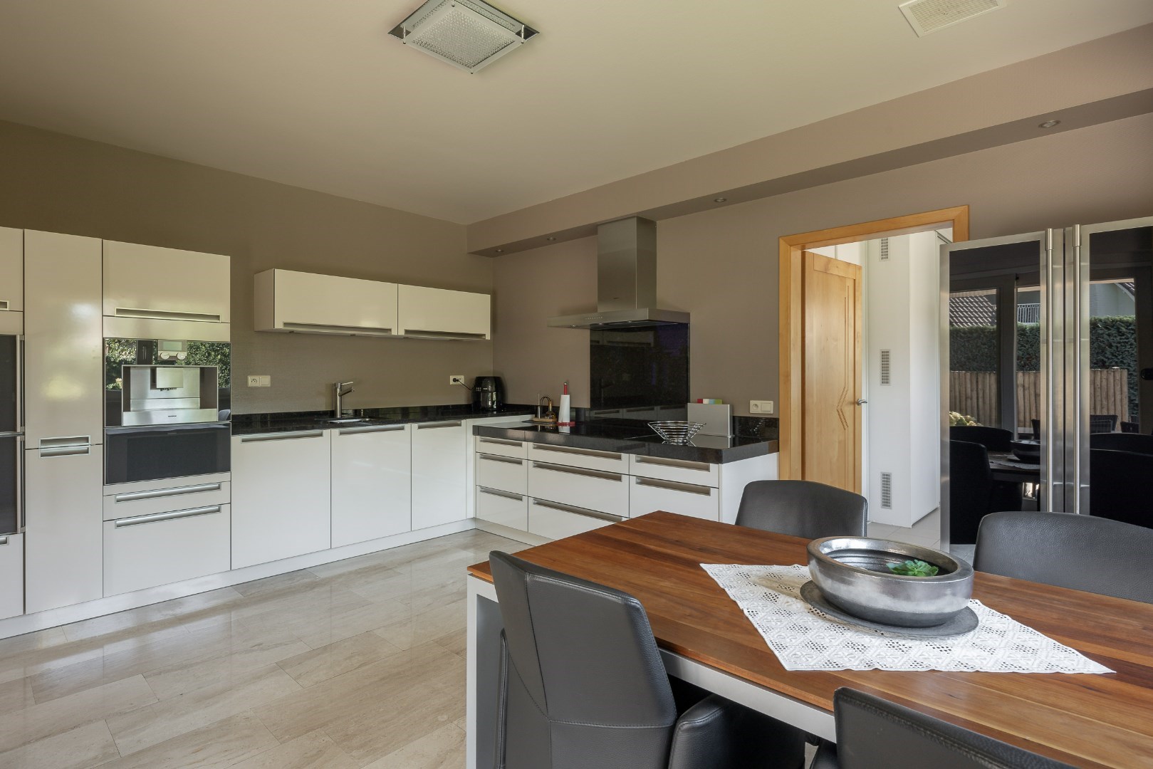 Verder is er ook toegang naar een apart toilet en uiteraard ook naar de leefruimte. De leefruimte is 42m² groot en heeft een aanpalende keuken van 19m². De keuken is voorzien van alle toestellen, zoals een koffiezetapparaat, 4-pits vuur, oven en microgolfoven, kruidenlades, inbouwspoelbak en een prachtig natuursteen blad. Zowel de keuken, badkamer als toilet zijn volledig vernieuwd in 2016.