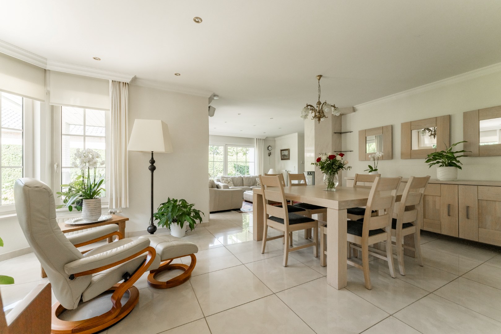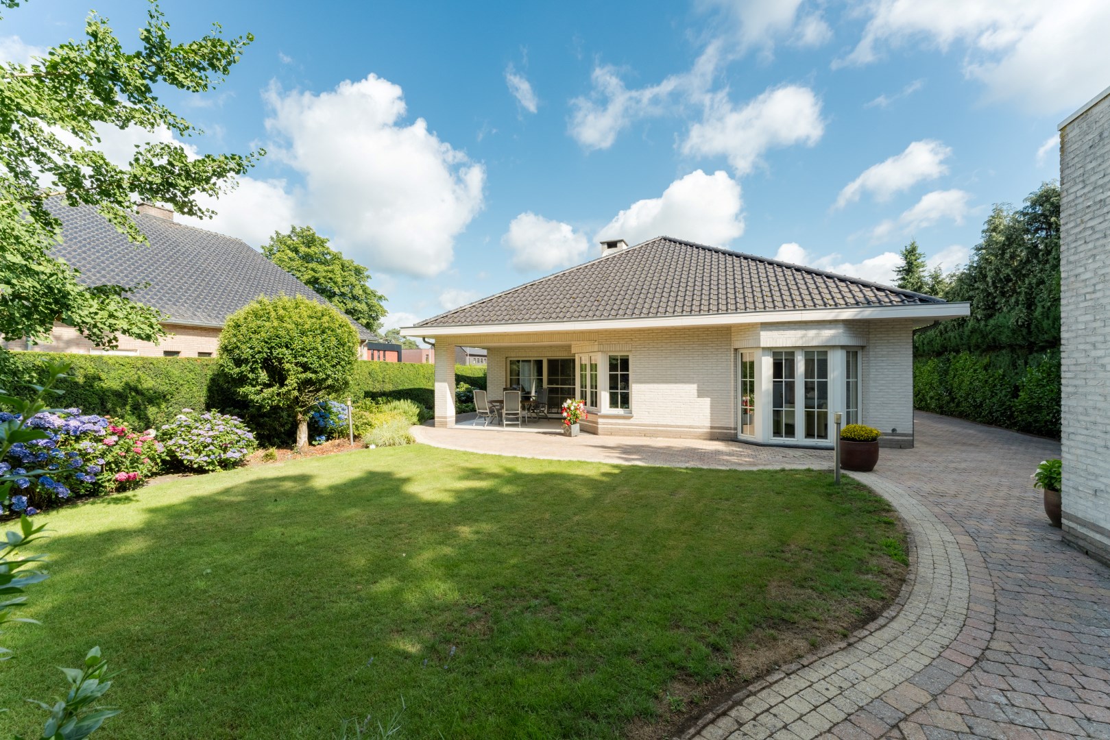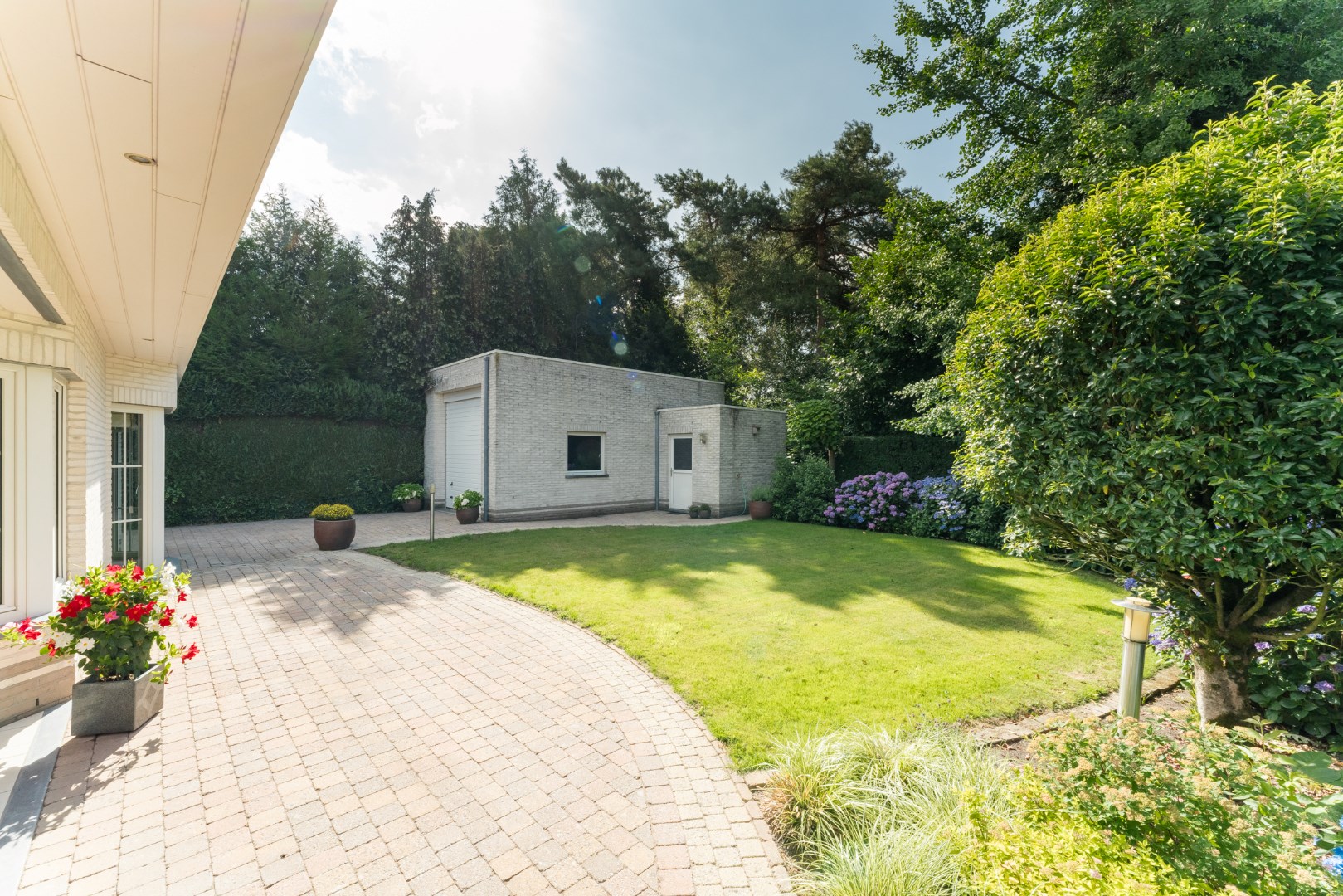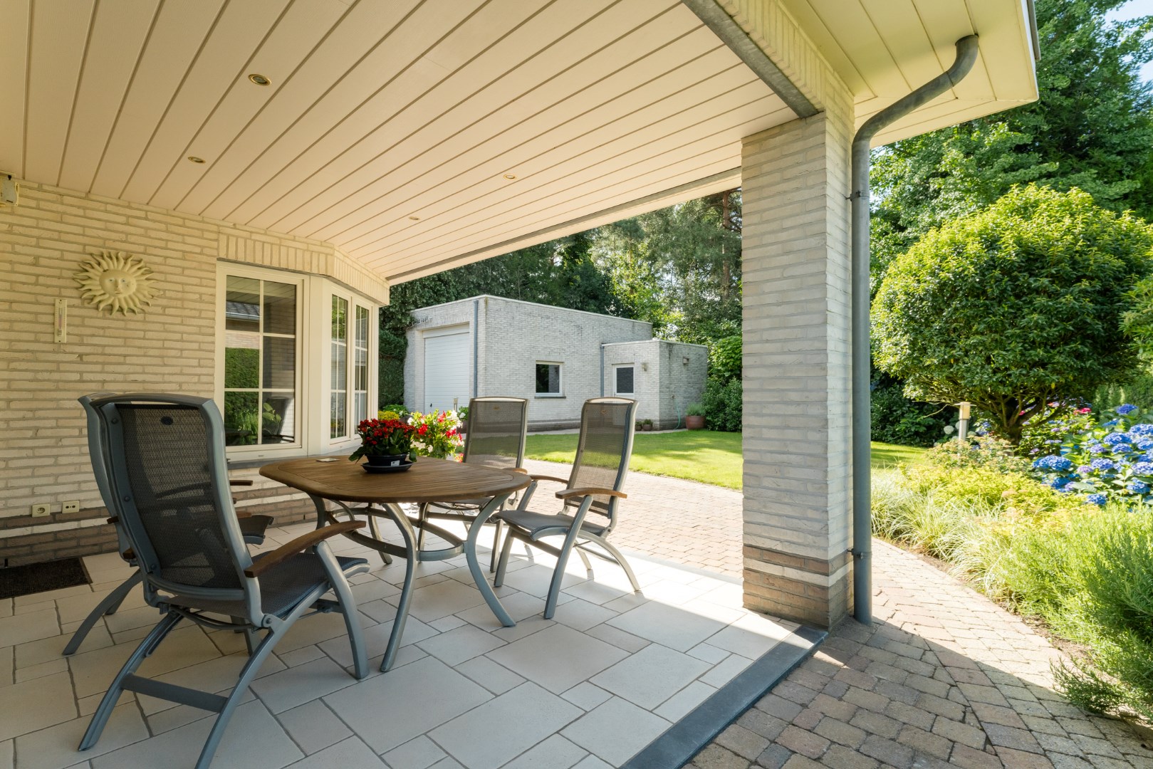 Vanuit de leefruimte is er aansluiting met het overdekt terras en de mooie, groene aangelegde tuin.