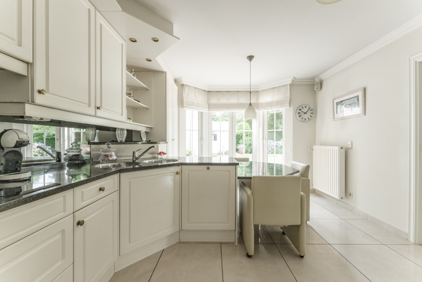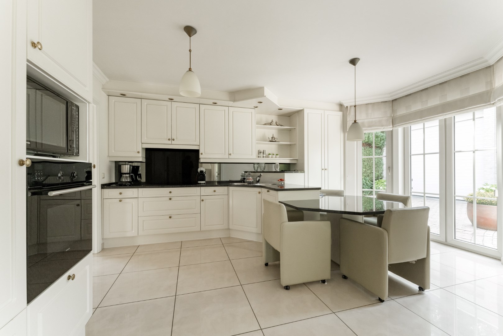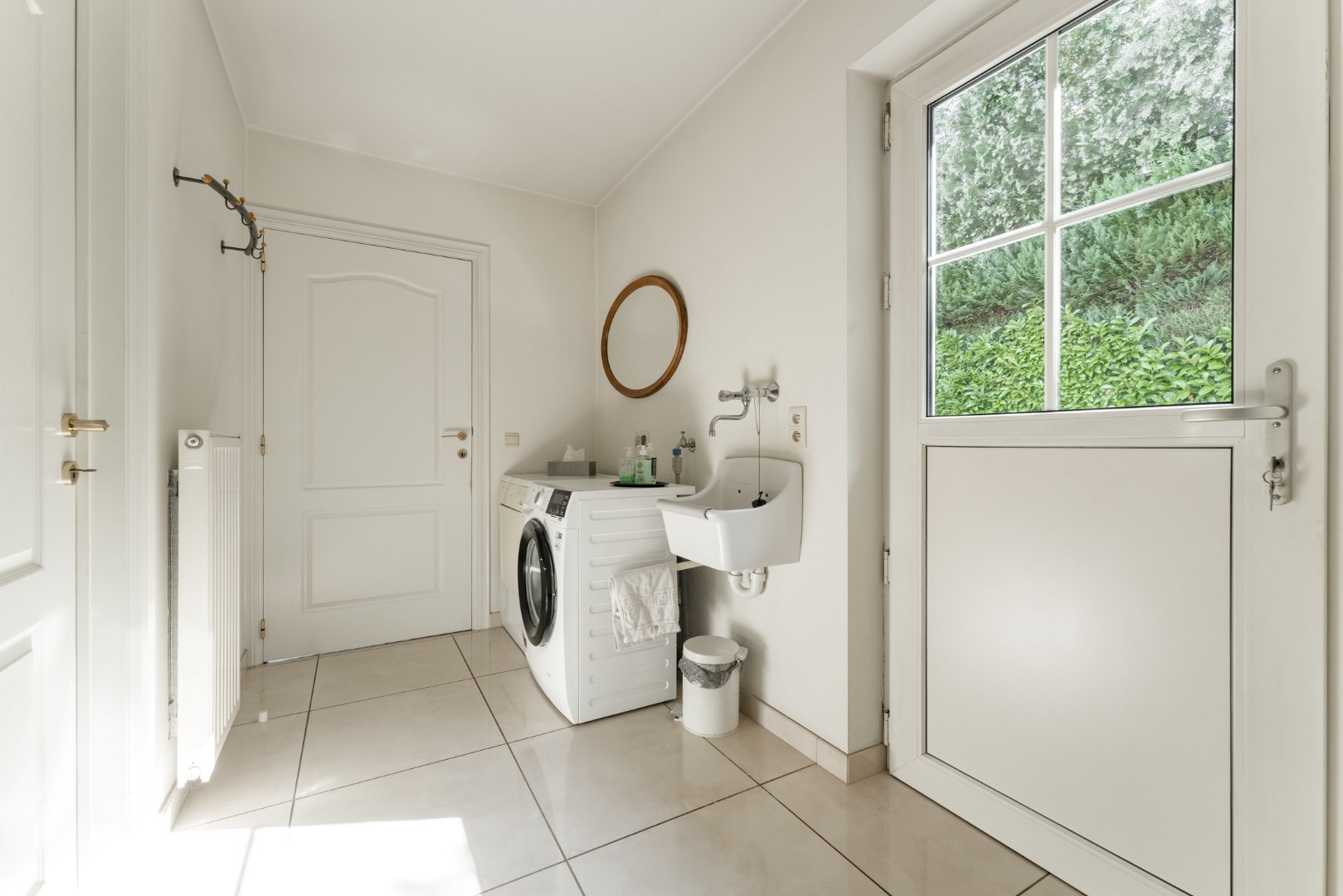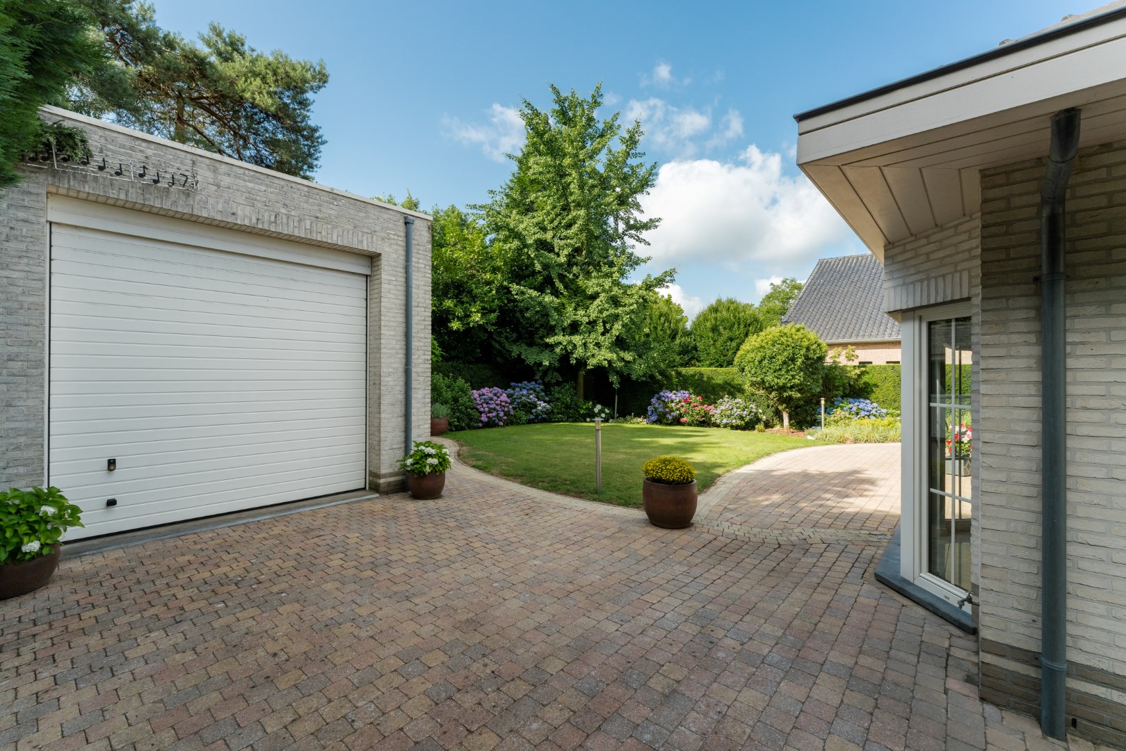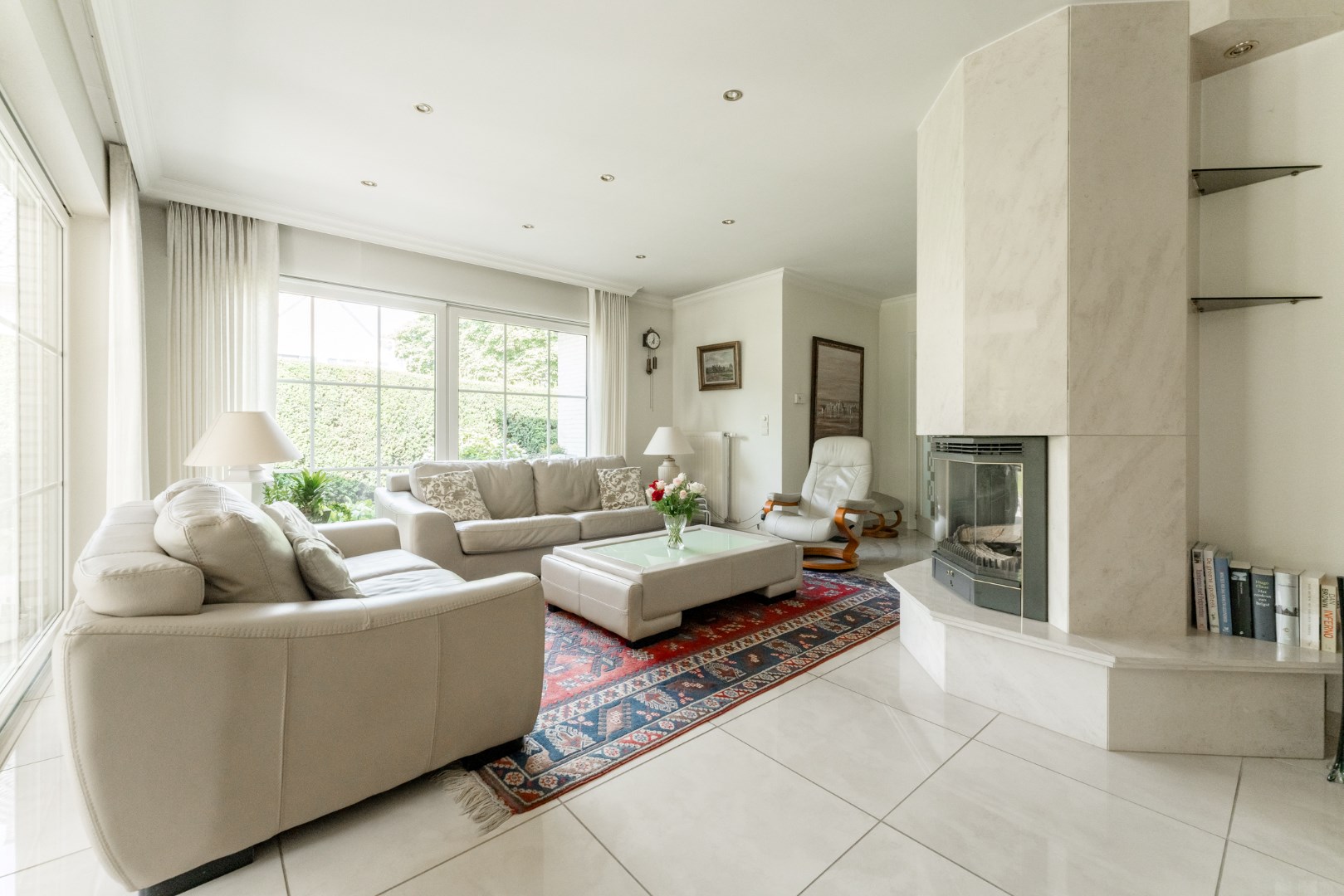 Vanuit de leefruimte is er aansluiting met het overdekt terras en de mooie, groene aangelegde tuin.