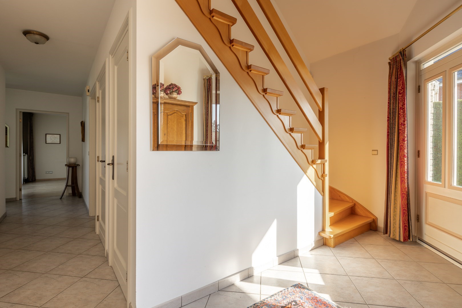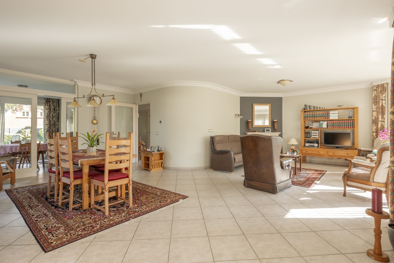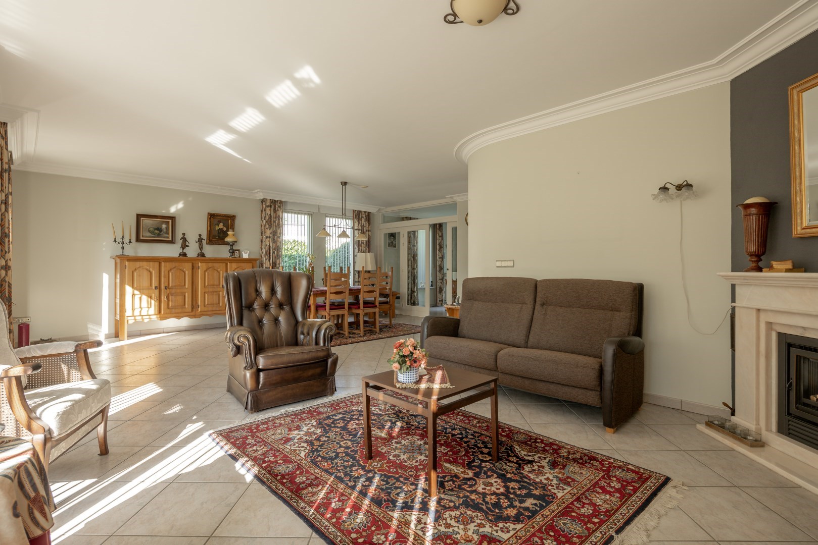 Vanuit de inkomhal is er toegang tot bijna alle ruimtes. Uiteraard is hier ook de doorgang naar de zeer ruime leefruimte. Deze is voorzien van vloerverwarming, alsook radiatoren en een gashaard. De leefruimte sluit aan op de keuken die een mooie uitkijk heeft over het tuinperceel.