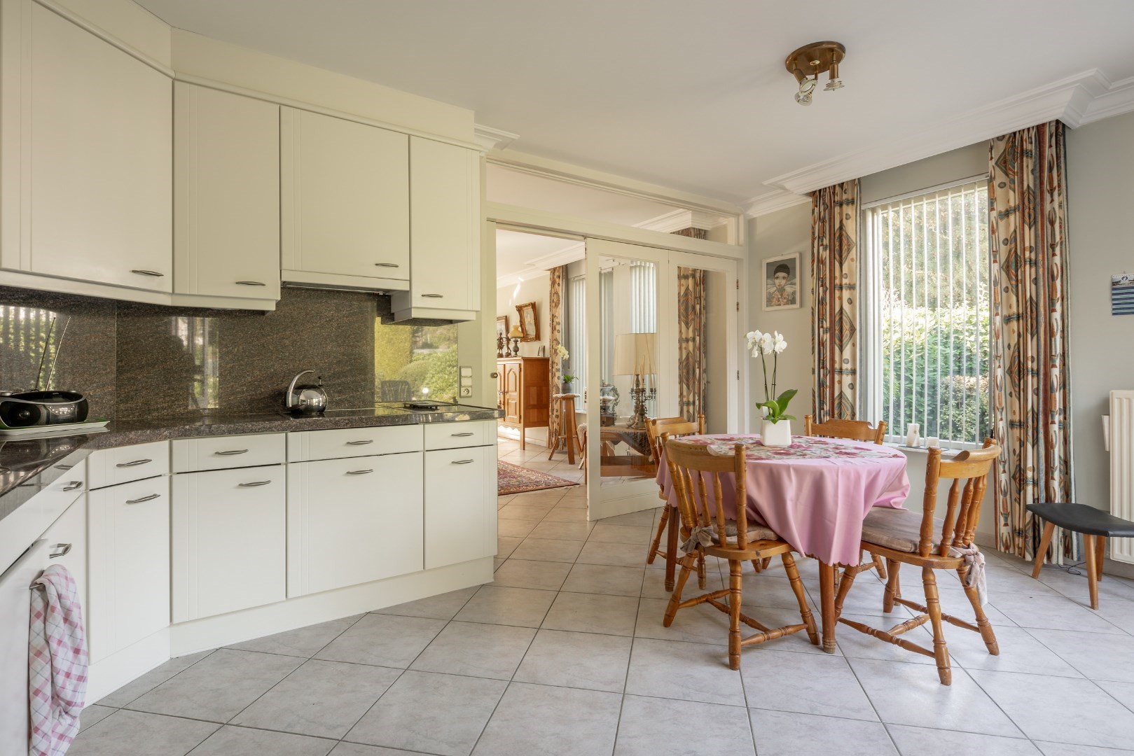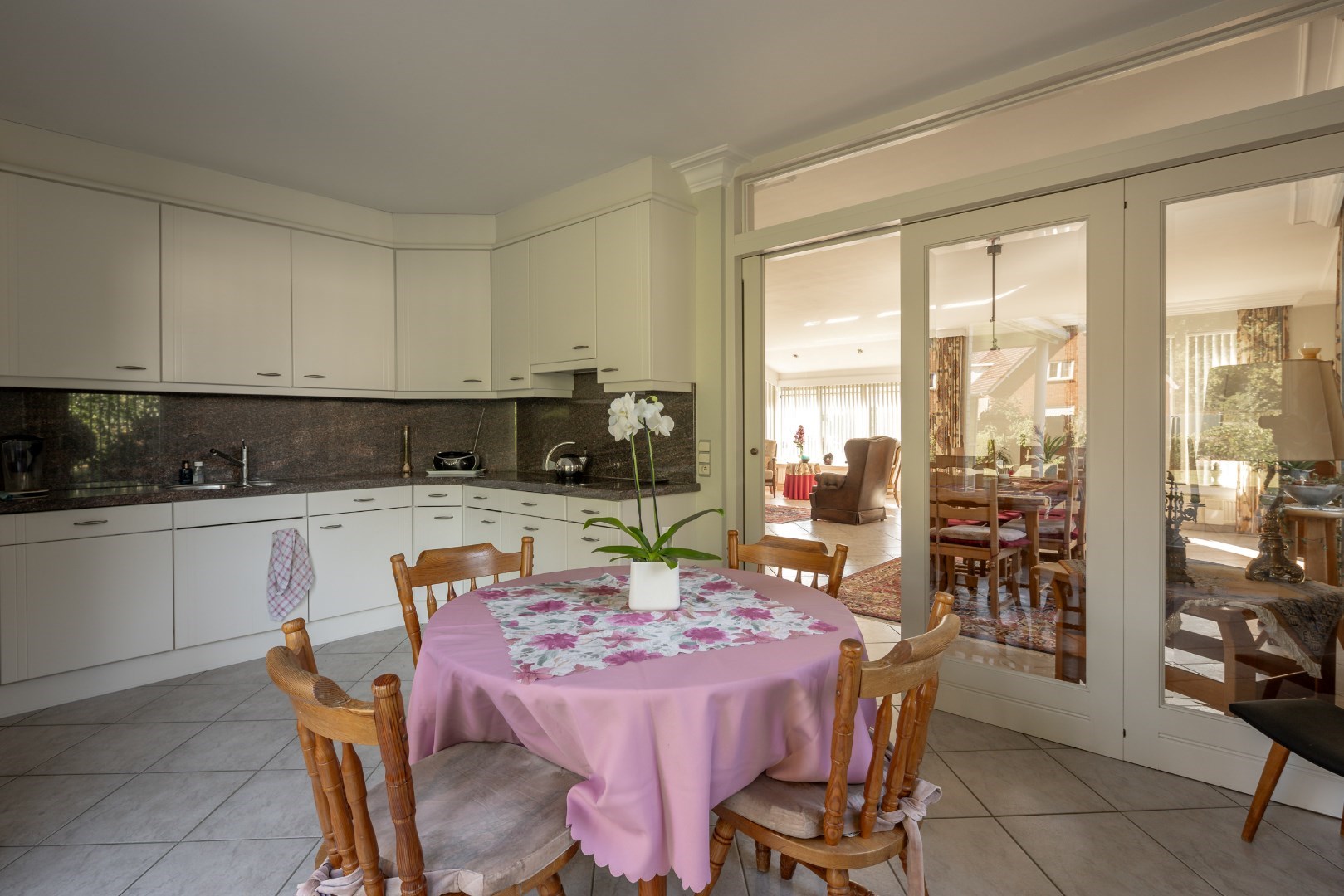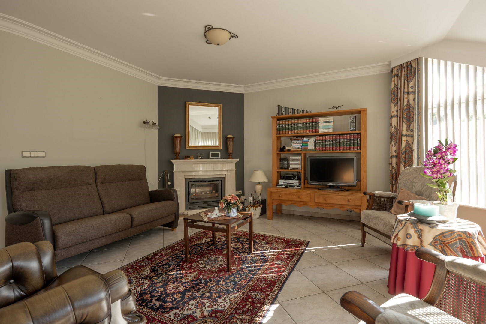 Vanuit de inkomhal is er toegang tot bijna alle ruimtes. Uiteraard is hier ook de doorgang naar de zeer ruime leefruimte. Deze is voorzien van vloerverwarming, alsook radiatoren en een gashaard. De leefruimte sluit aan op de keuken die een mooie uitkijk heeft over het tuinperceel.