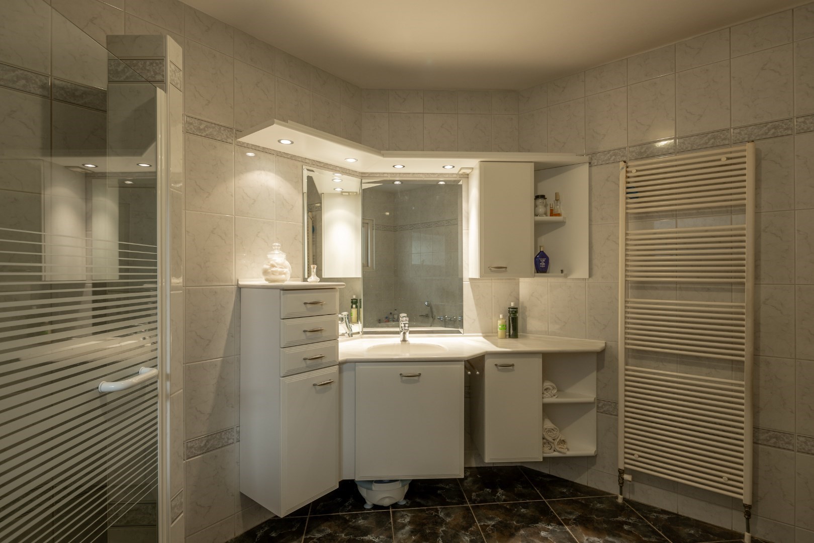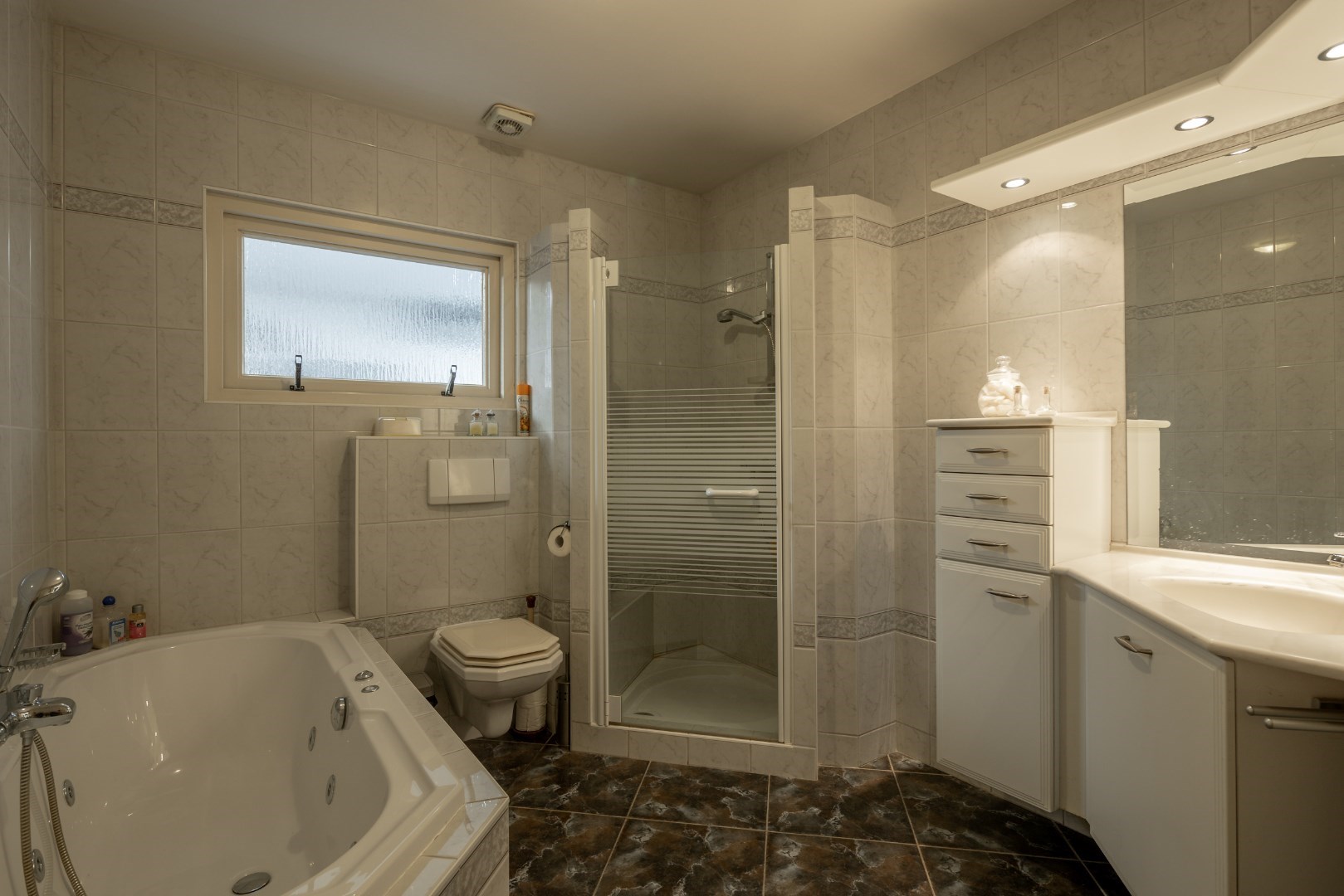 Vervolgens is er gelijkvloers een ruime slaapkamer met aanpalende badkamer. Deze is goed uitgerust met een apart bad, douche, toilet en badmeubel.