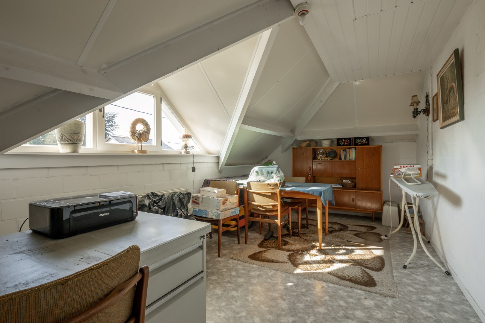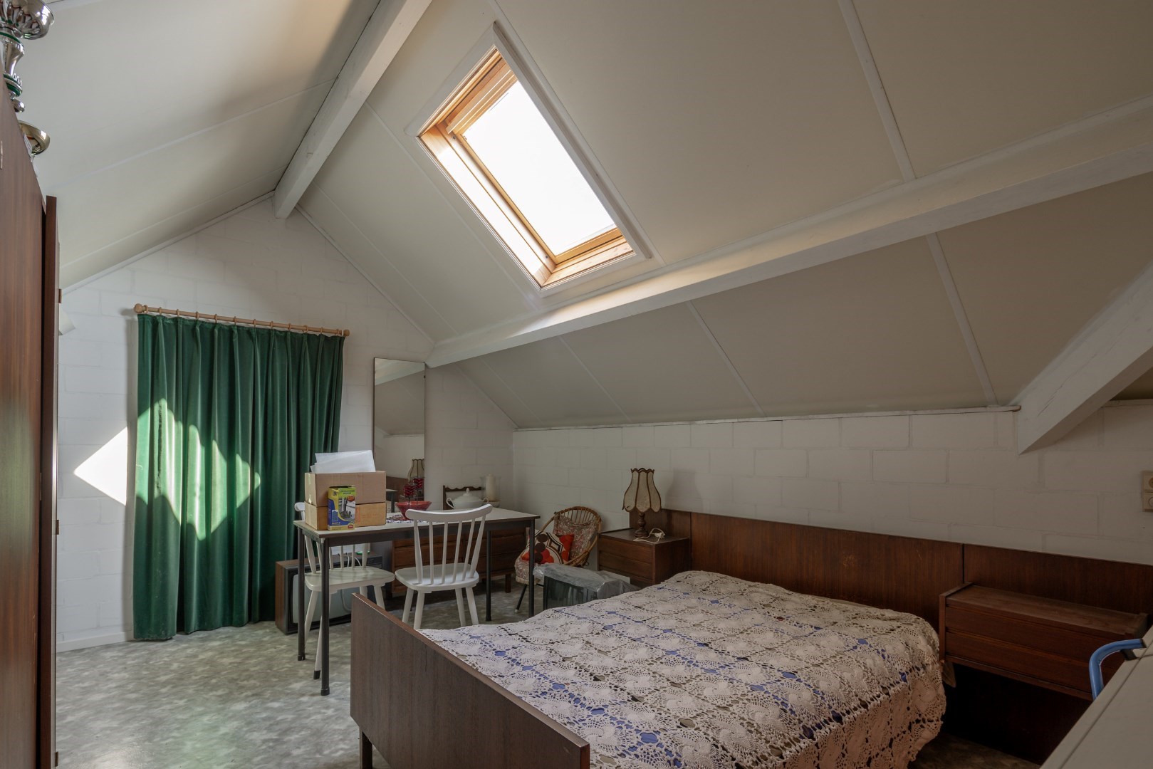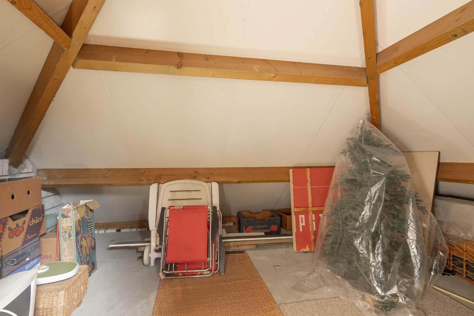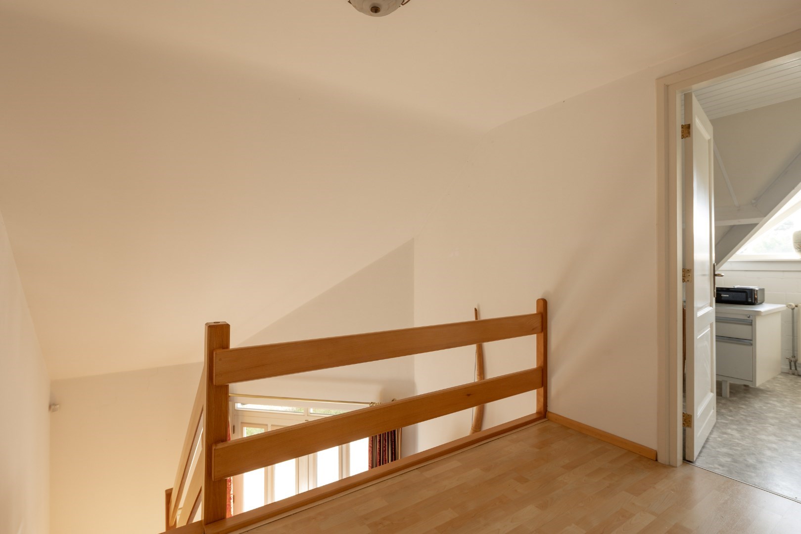 De woning heeft ook een vaste trap naar het verdiep, waar nog 2 slaapkamerruimtes zijn en opbergruimtes. Eén van de bergruimtes hier heeft de voorzieningen zitten voor een eventuele badkamer extra te maken op verdiep.
