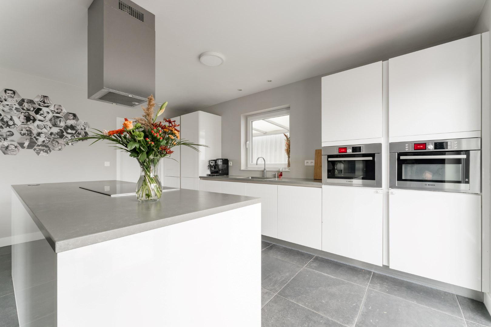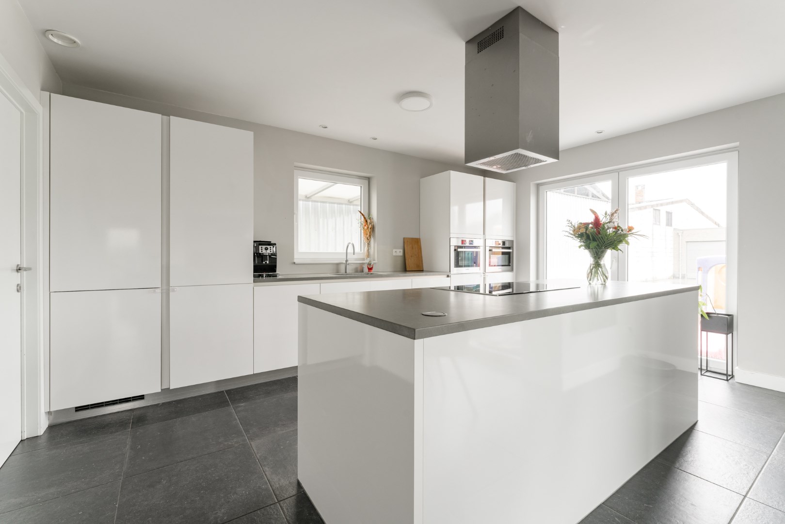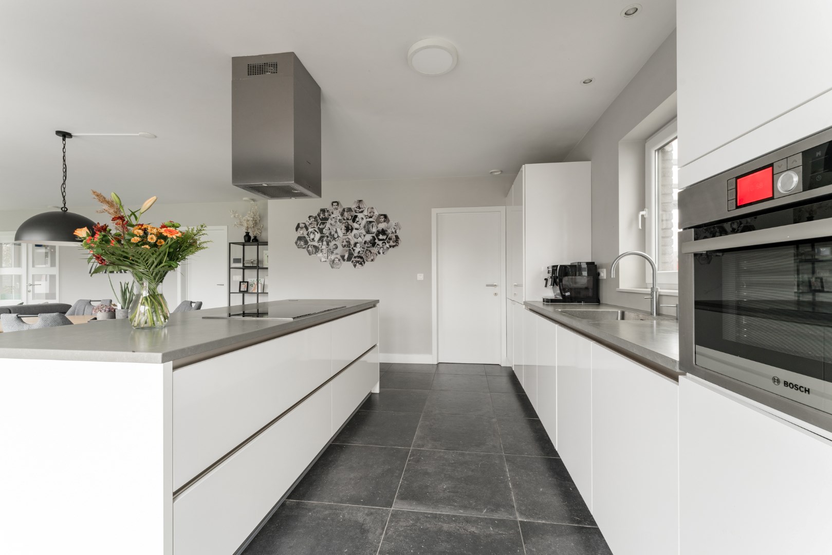 - Keuken: Quooker, Combi-stoom, combi-microgolf, vaatwassser, inductievuur, koelkast en diepvries, voorzien van een natuurstenen werkblad.