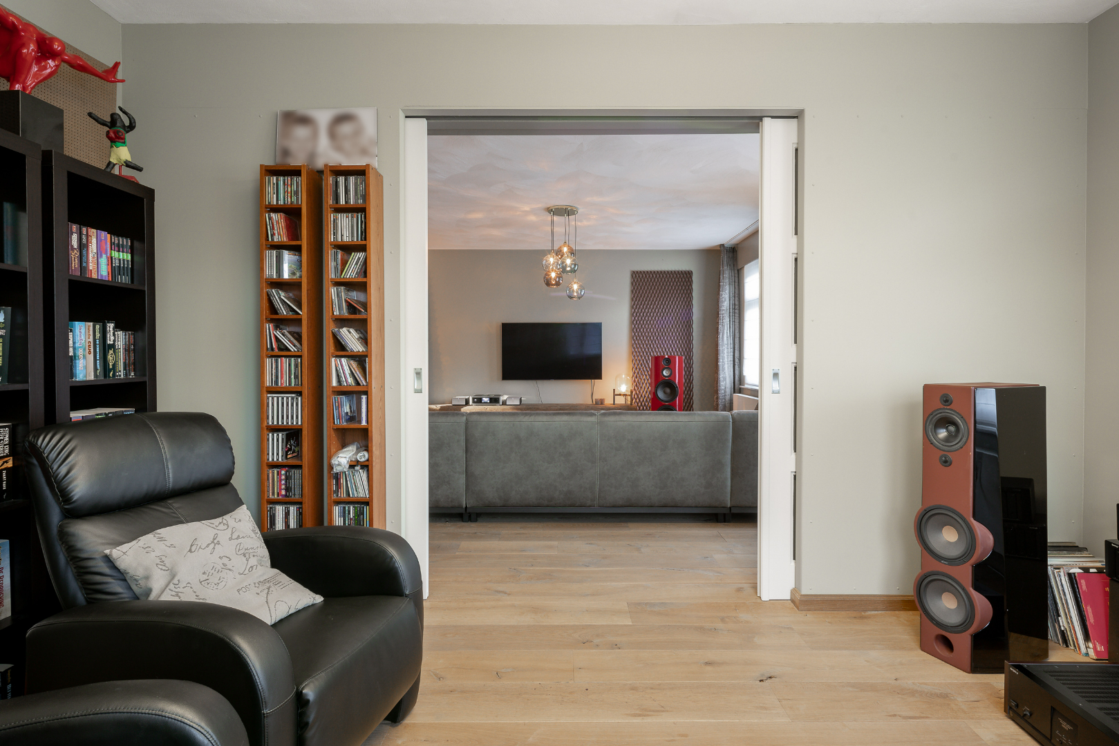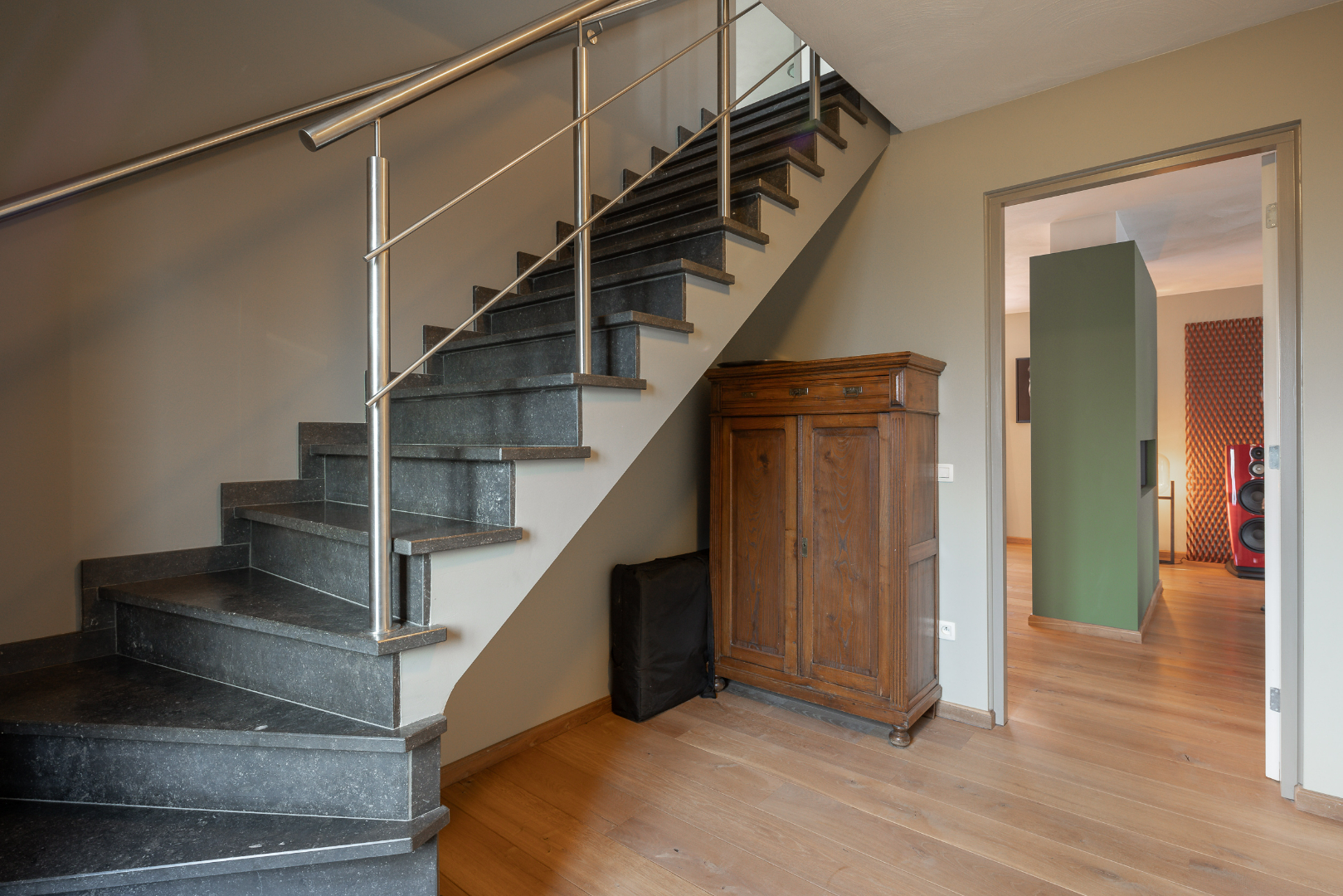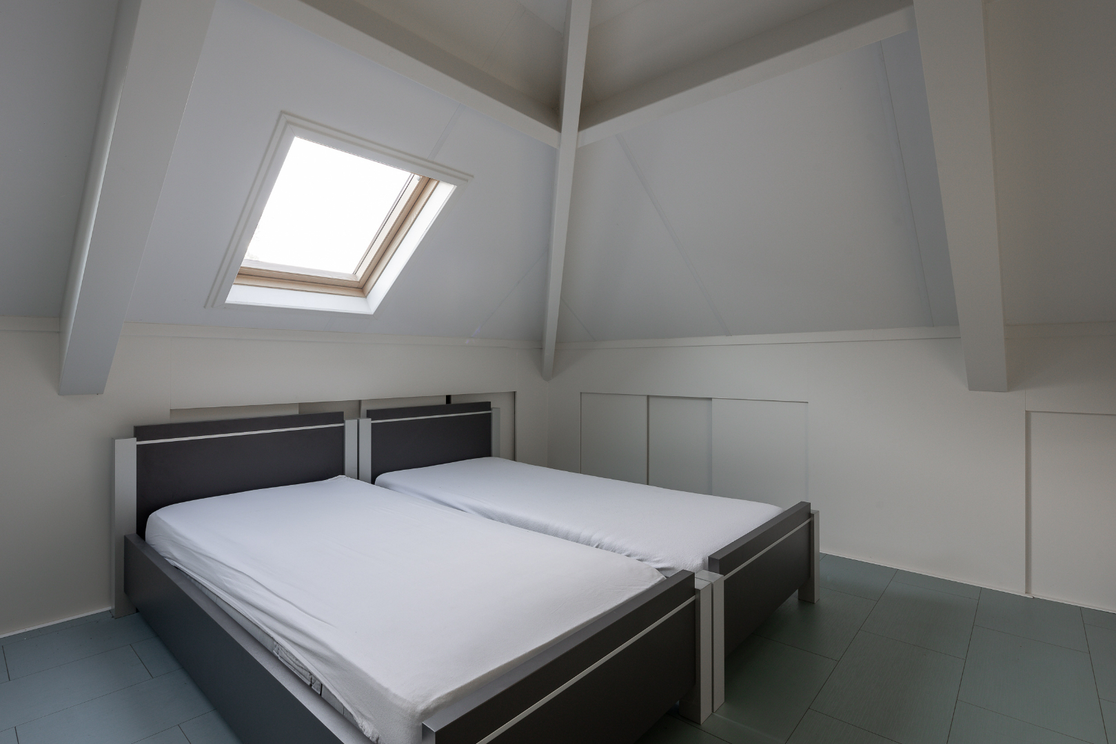 Vervolgens is er een vaste trap naar de zolder waar nog tal van mogelijkheden zijn. Voorlopig is één deel ingedeeld als slaapkamer en het andere deel is omgevormd tot home cinema.