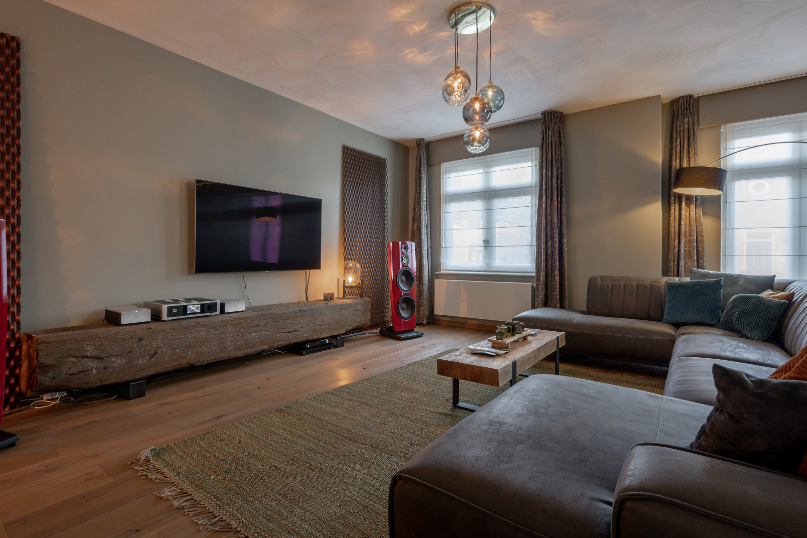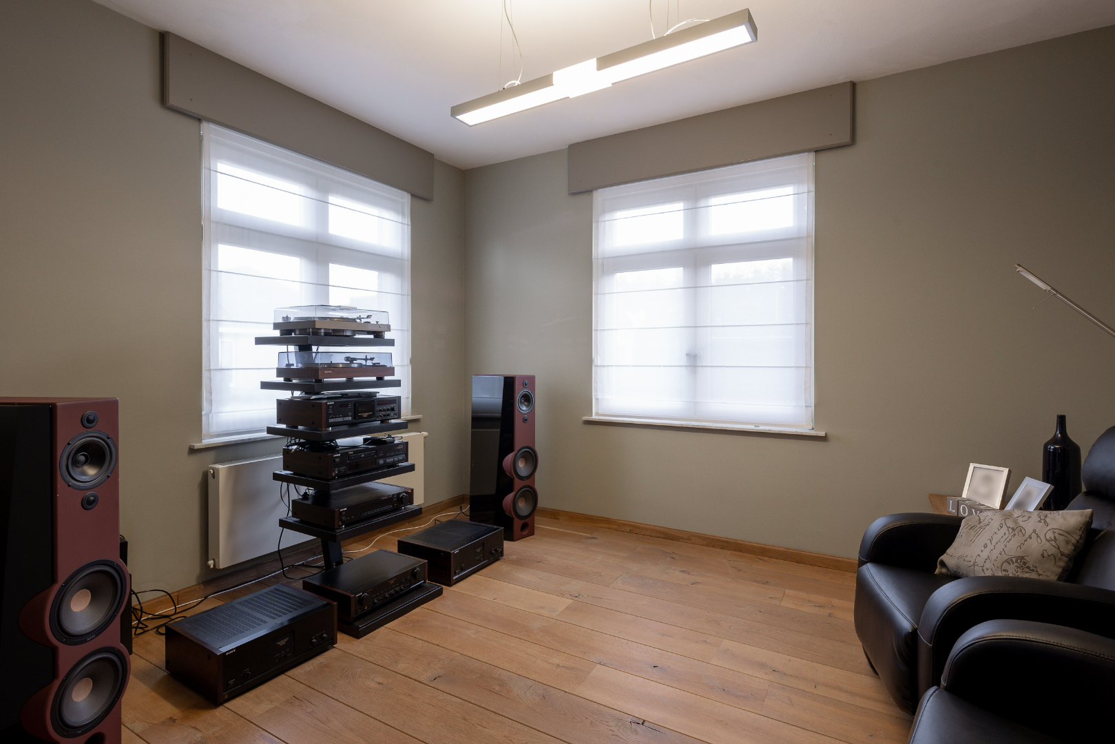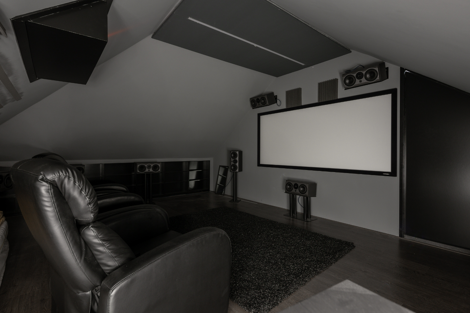 Vervolgens is er een vaste trap naar de zolder waar nog tal van mogelijkheden zijn. Voorlopig is één deel ingedeeld als slaapkamer en het andere deel is omgevormd tot home cinema.