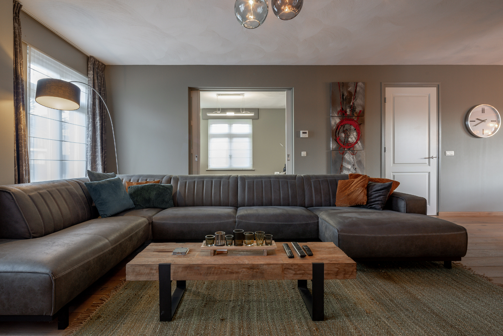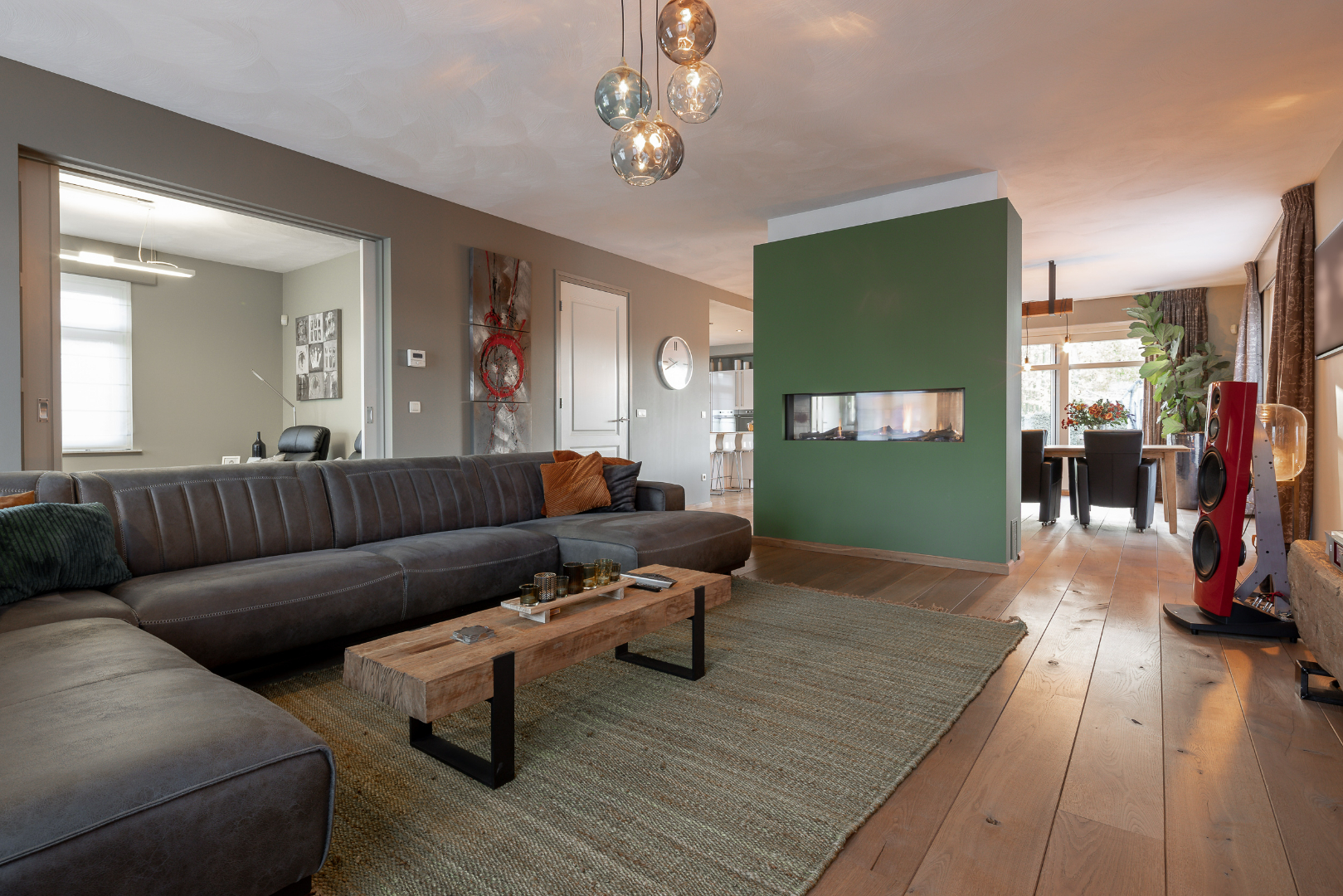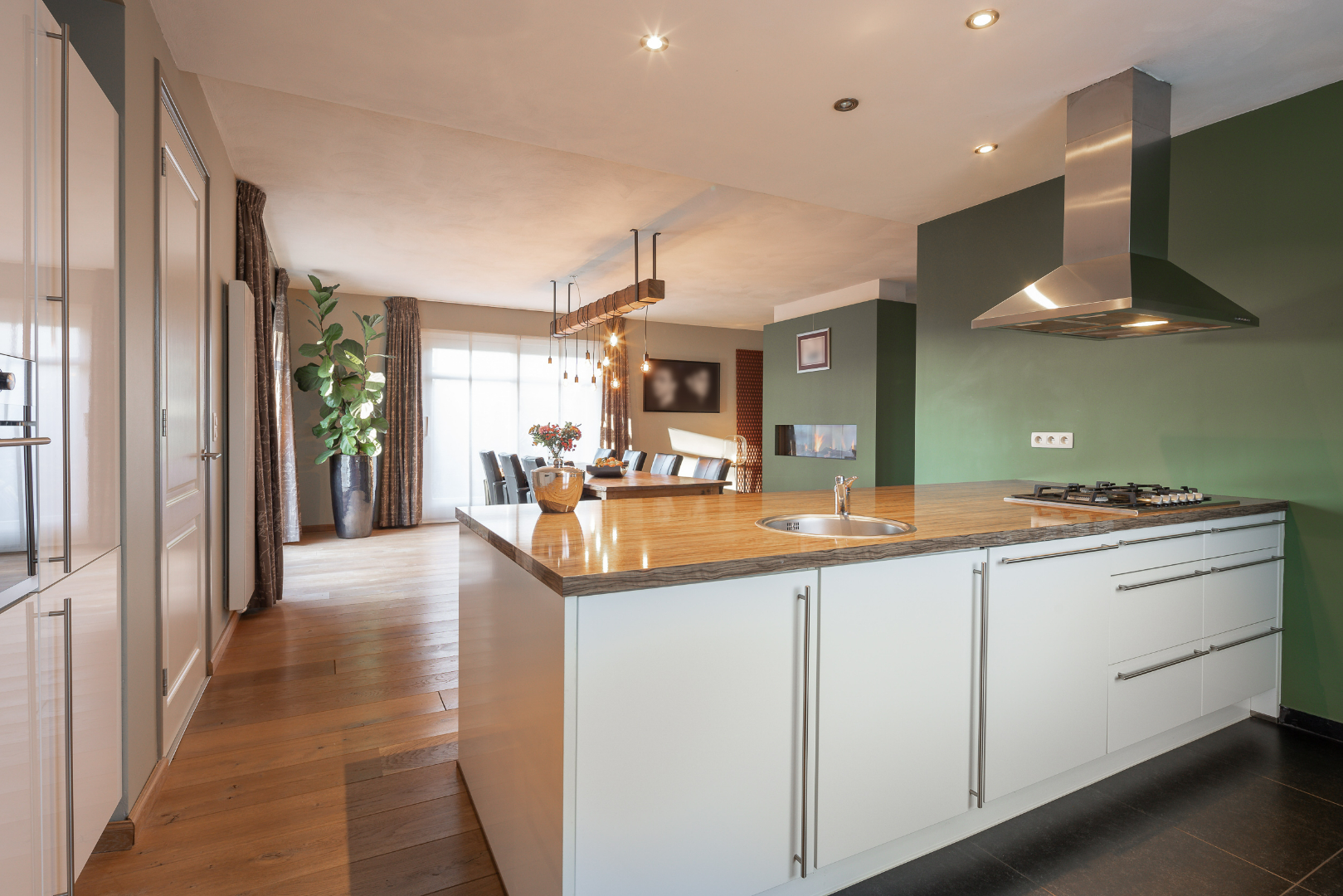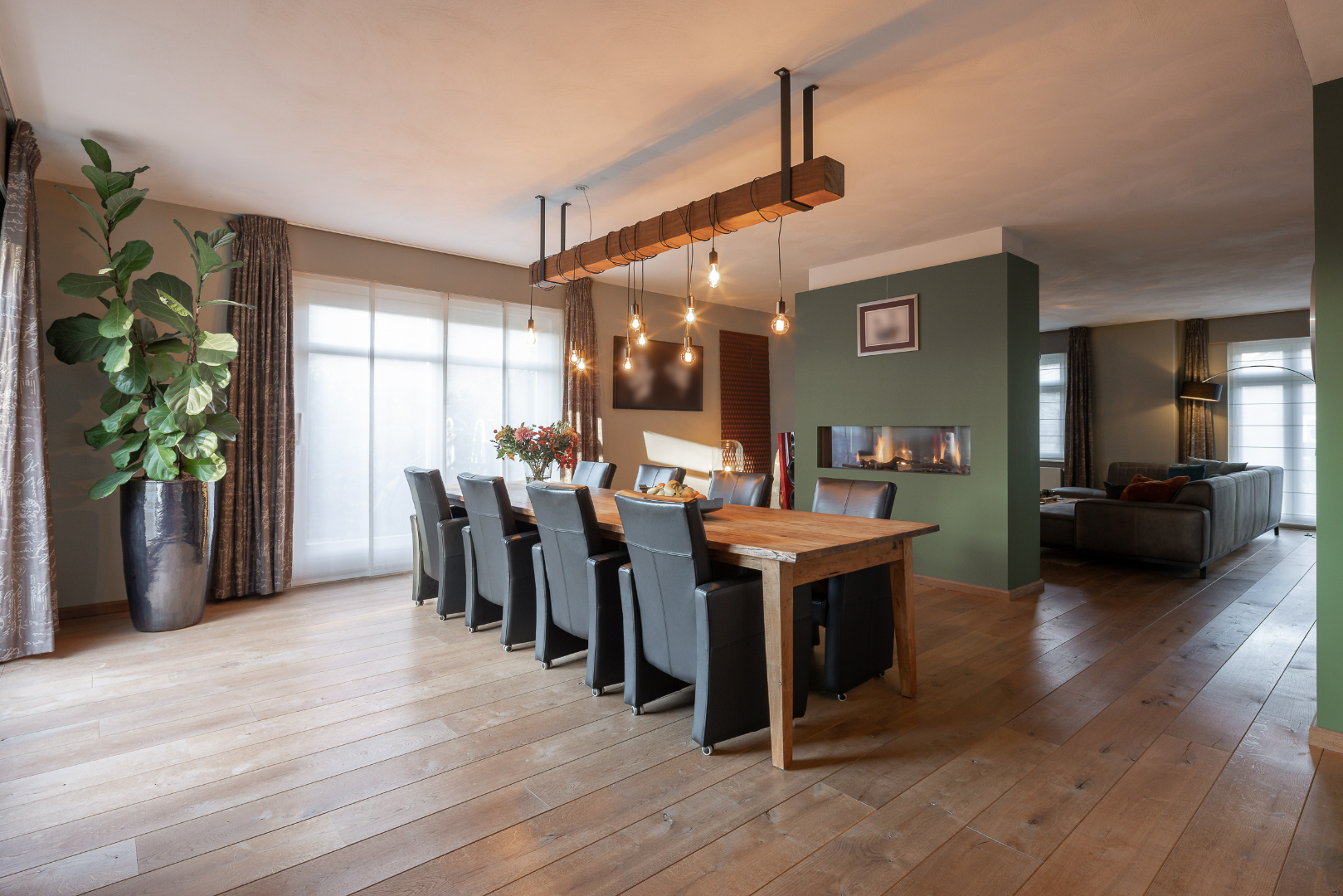 De ruime villa heeft een totale woonoppervlakte van maar liefst 284m². Gelijkvloers is er een ruime inkomhal, een zeer open ruime leefruimte die wordt opgesplitst door een ingebouwde gashaard. In de leefruimte ligt parket en is er een open verbinding gecreëerd met de keuken. Deze is voorzien van een kastenwand en eiland met gasvuur, vaatwasser, twee combi-ovens en koelkast met diepvries. Verder is er ook een ruime bureauruimte voorzien (om te toveren tot slaapkamer onder indien gewenst). Daarnaast ligt er nog een toilet en berging met alle voorzieningen gelijkvloers. Hier kan verwarmd worden met vloerverwarming, via radiatoren of via de gashaard in de leefruimte.