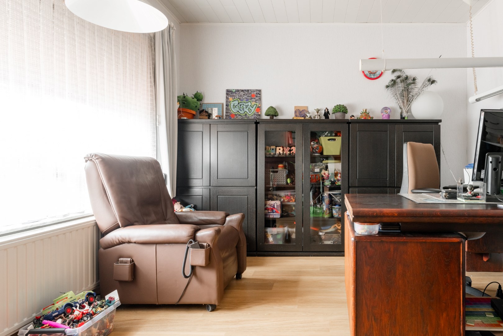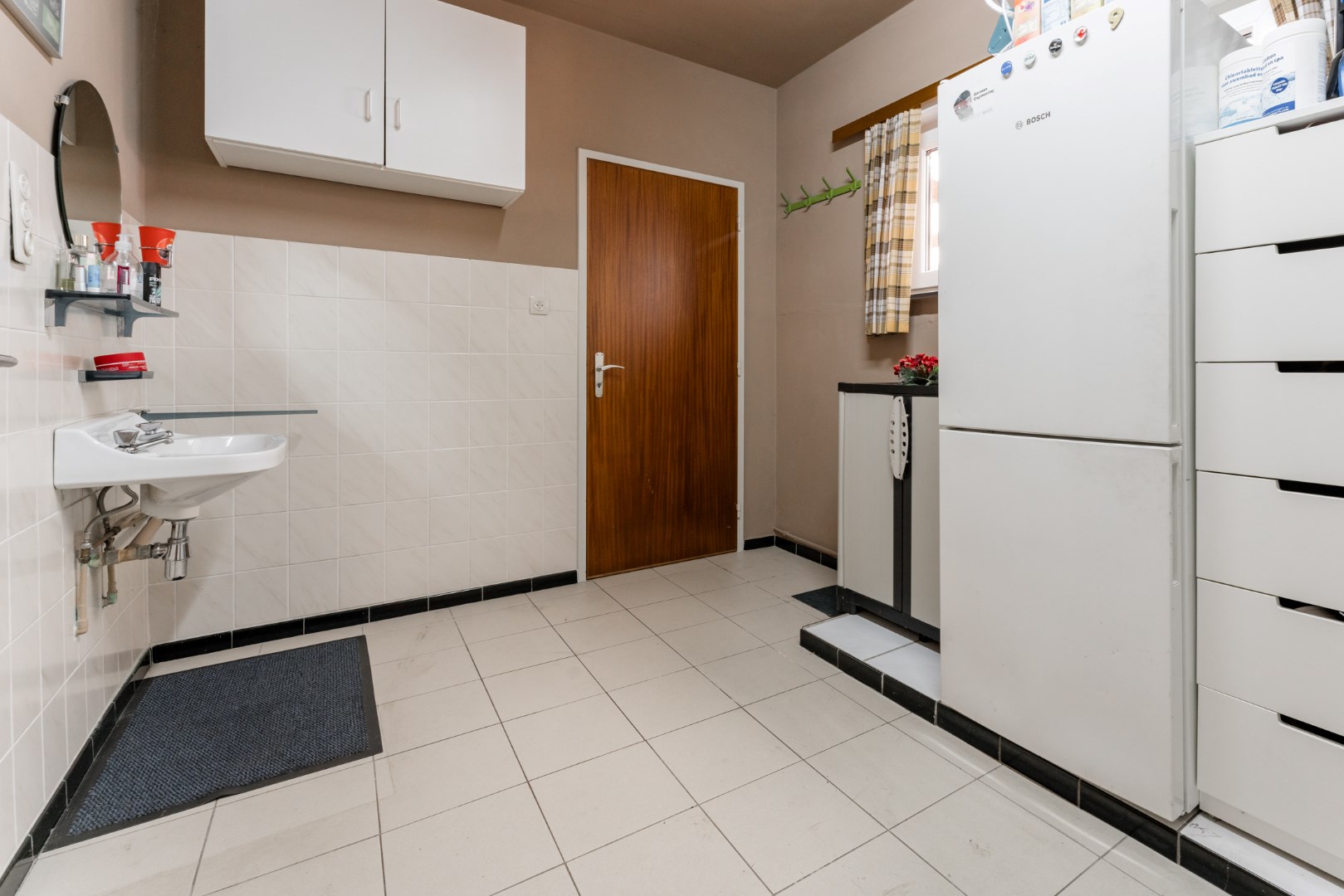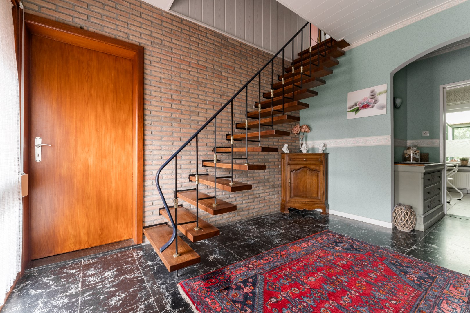 De woning heeft een royale inkomhal met aangrenzend slaapkamer of bureauruimte, een leefruimte die voorzien is van parket, een eetruimte en keuken. Verder is er voldoende bergruimte voorzien op het gelijkvloers, een wasplaats, apart toilet en een aangebouwde veranda.