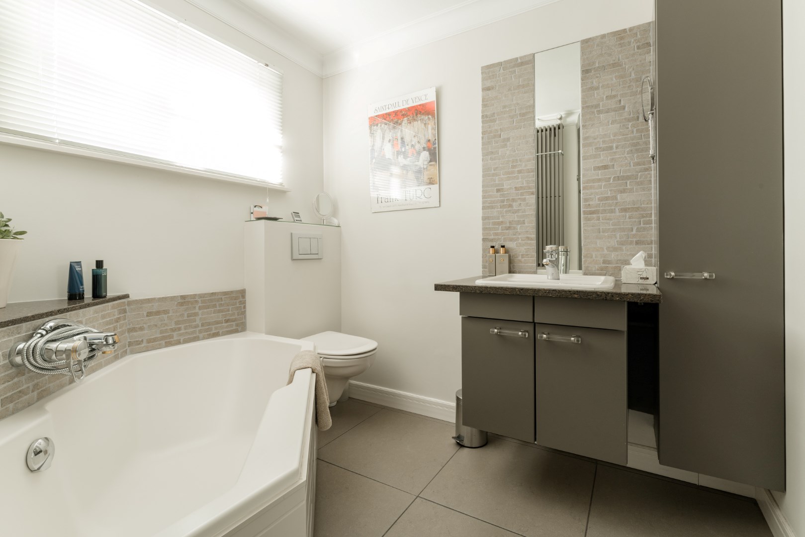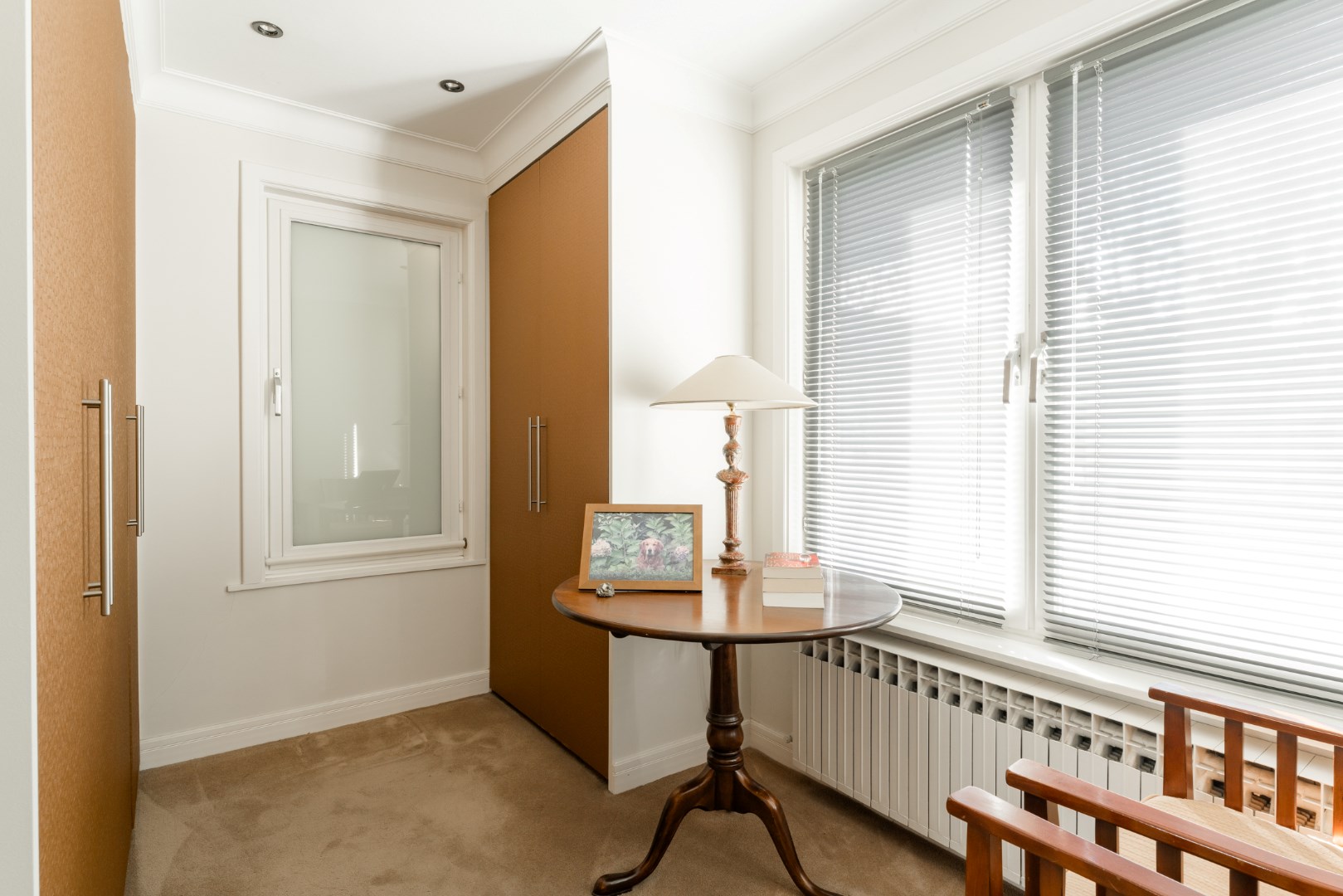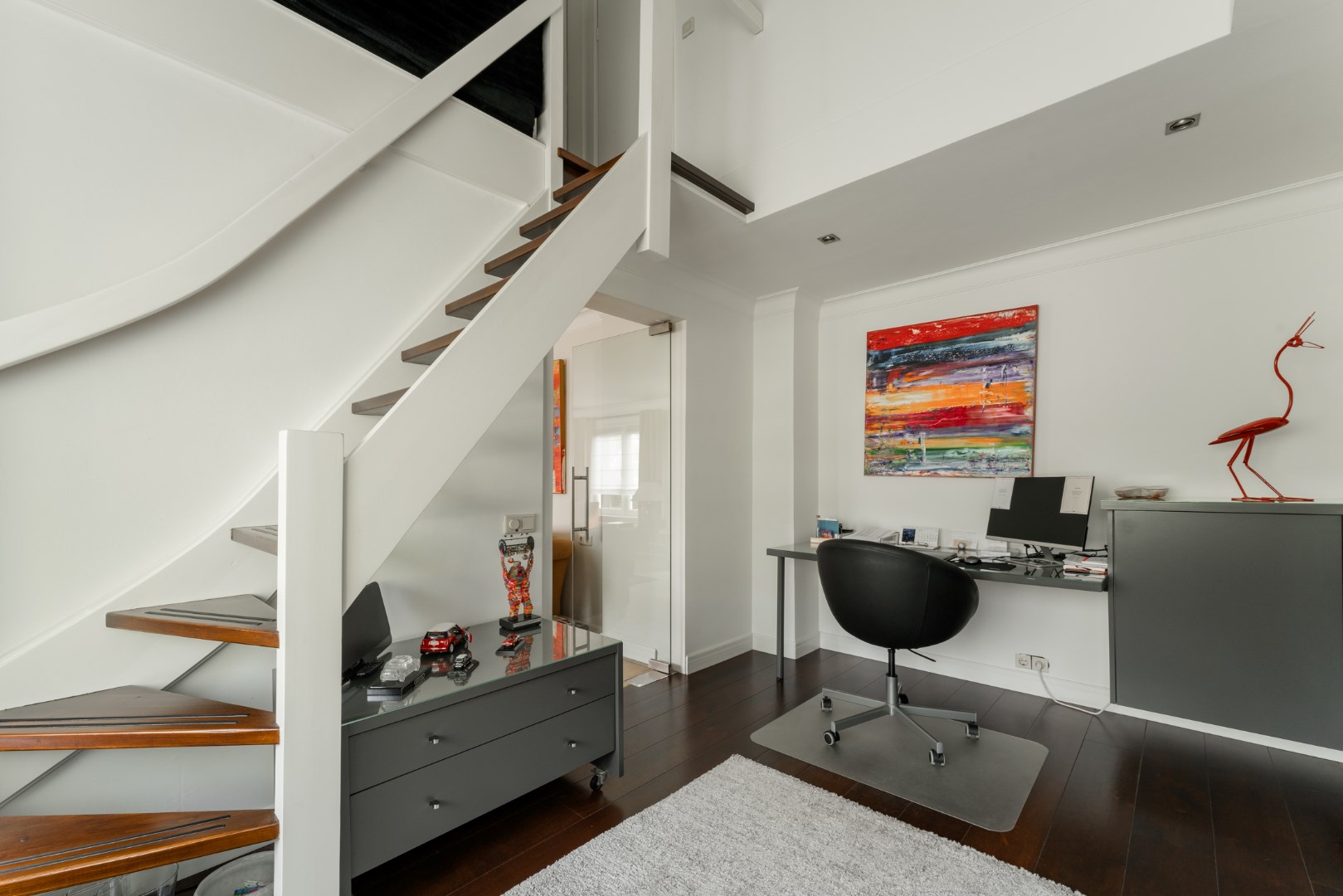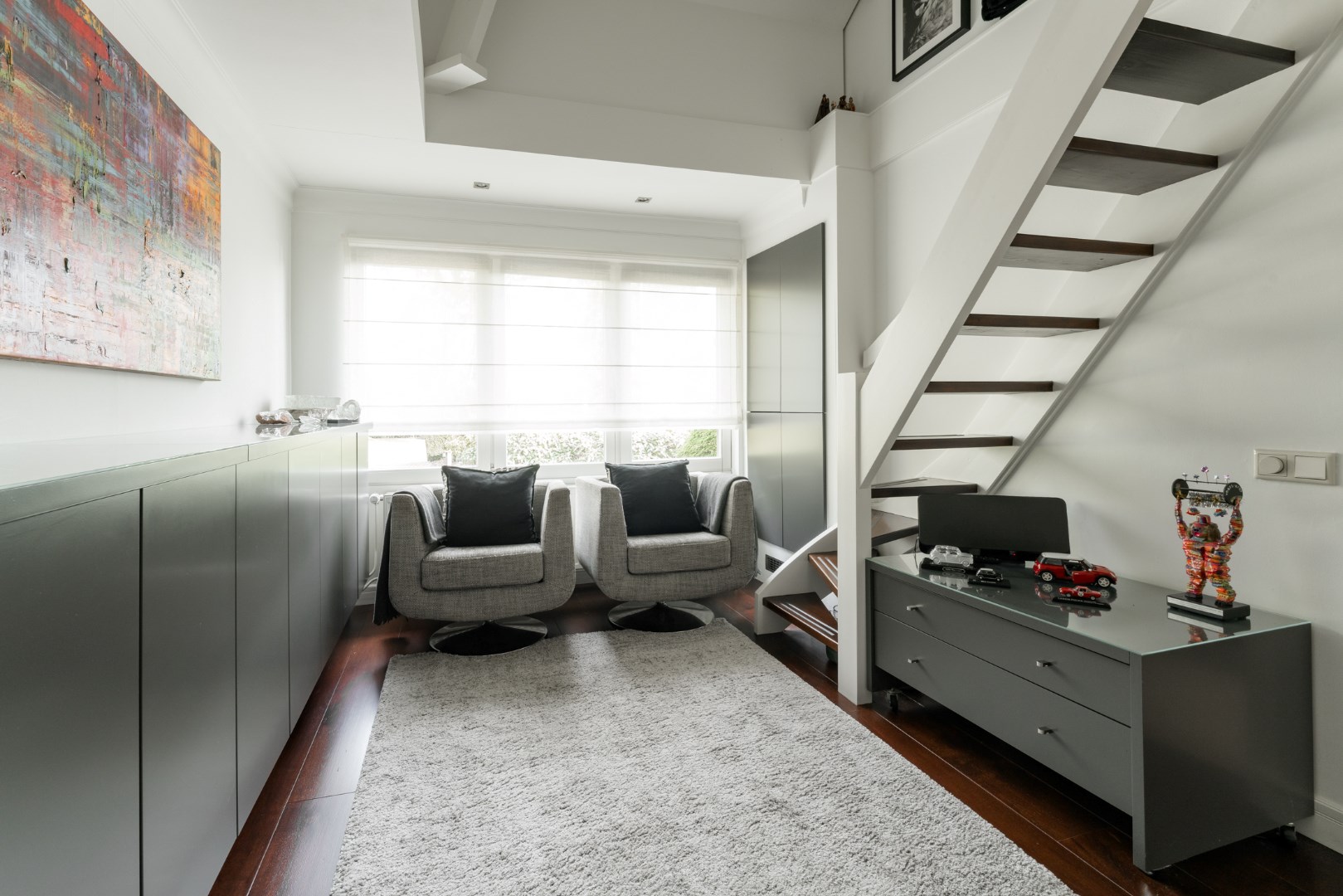 Naast de leefruimte is er gelijkvloers ook nog een mooi bureau/kantoor, dat eventueel omgevormd kan worden tot tweede slaapkamer. Ook deze ruimte werd voorzien van inbouwkasten met hoogwaardige kwaliteit.