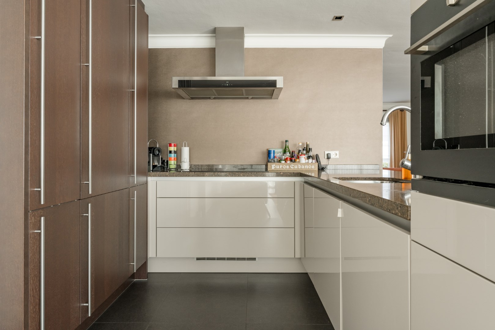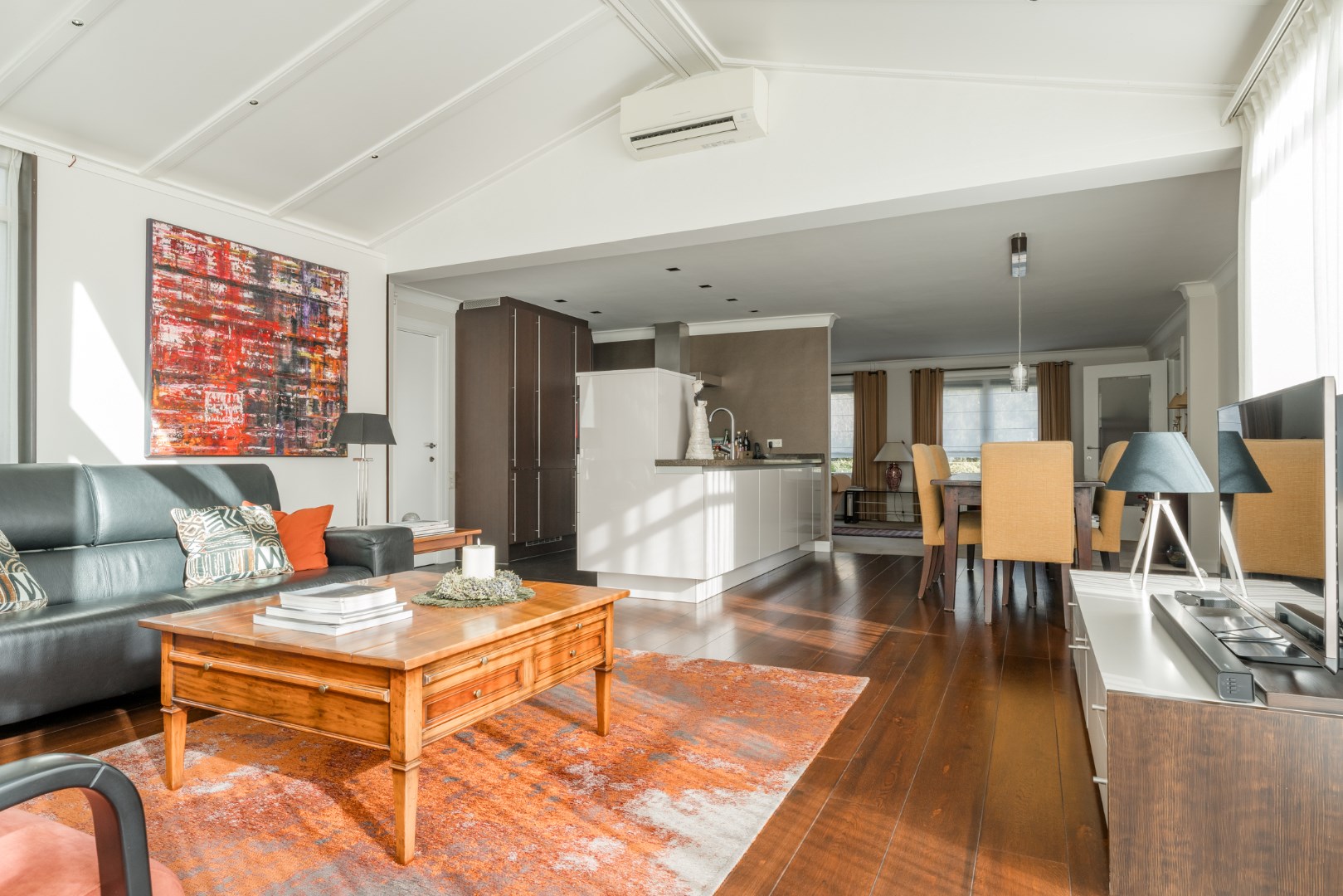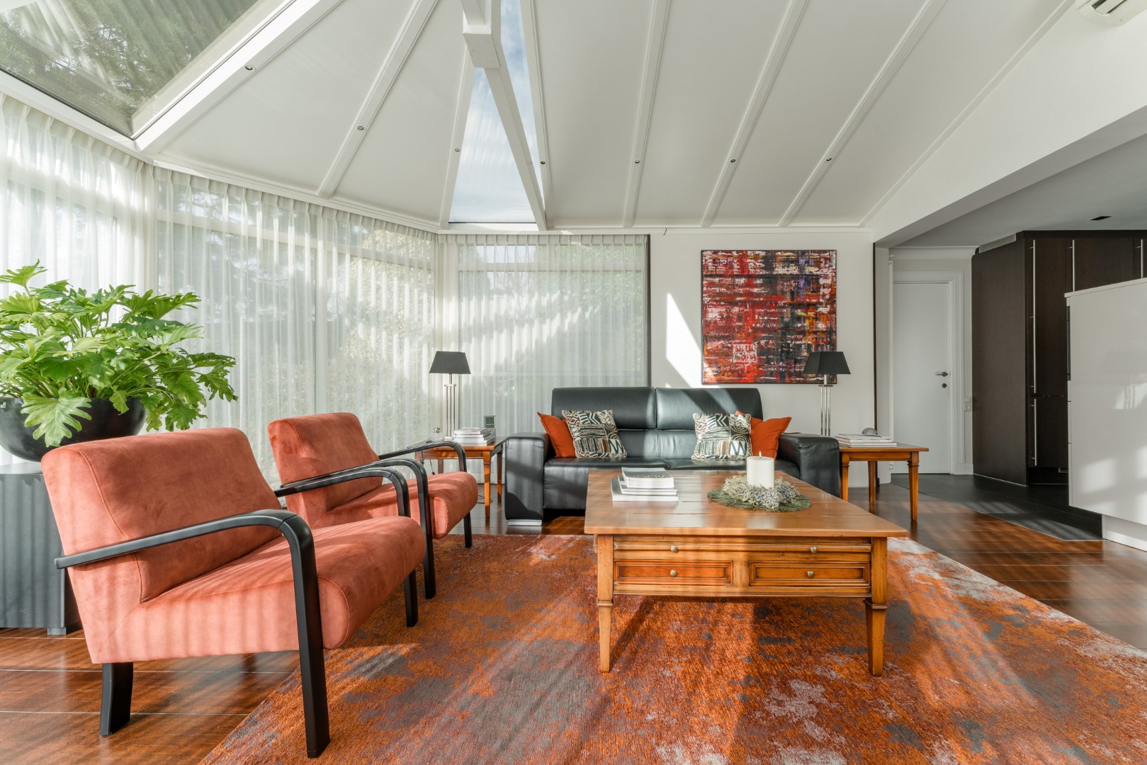 Wanneer we naar de andere kant gaan bij de inkomhal, komen we terecht in een zeer lichtrijke leefruimte. Dit is absoluut te danken aan een fantastische tuinkamer/veranda die bij de woning werd betrokken. In de leefruimte vinden we twee zithoeken, eentje in de tuinkamer en eentje vooraan voorzien van een open haard. Verder is er ook een ruime eetkamer met open keuken. Deze Poggenpohl keuken is voorzien van een natuurstenen blad en heeft alle nodige toestellen. Aangrenzend zit ook een bergruimte die voorzien werd van allemaal inbouwkasten. Het wordt al snel duidelijk dat deze woning tot in de puntjes werd afgewerkt.