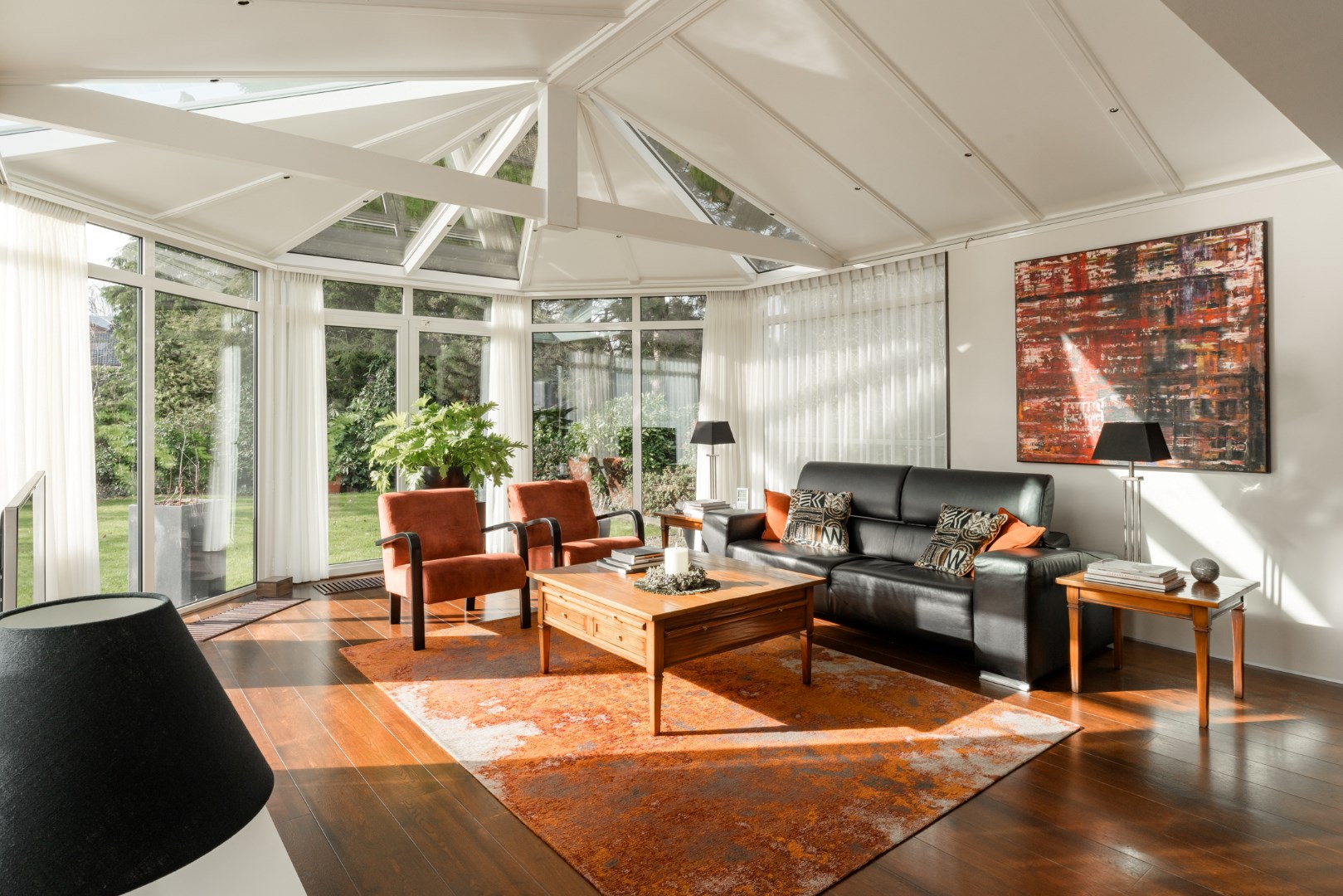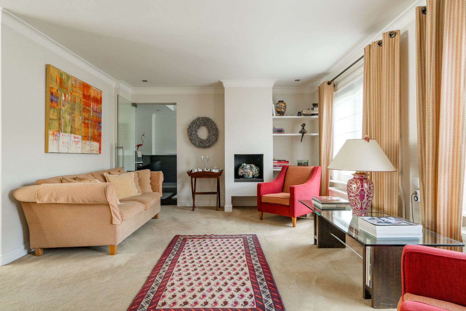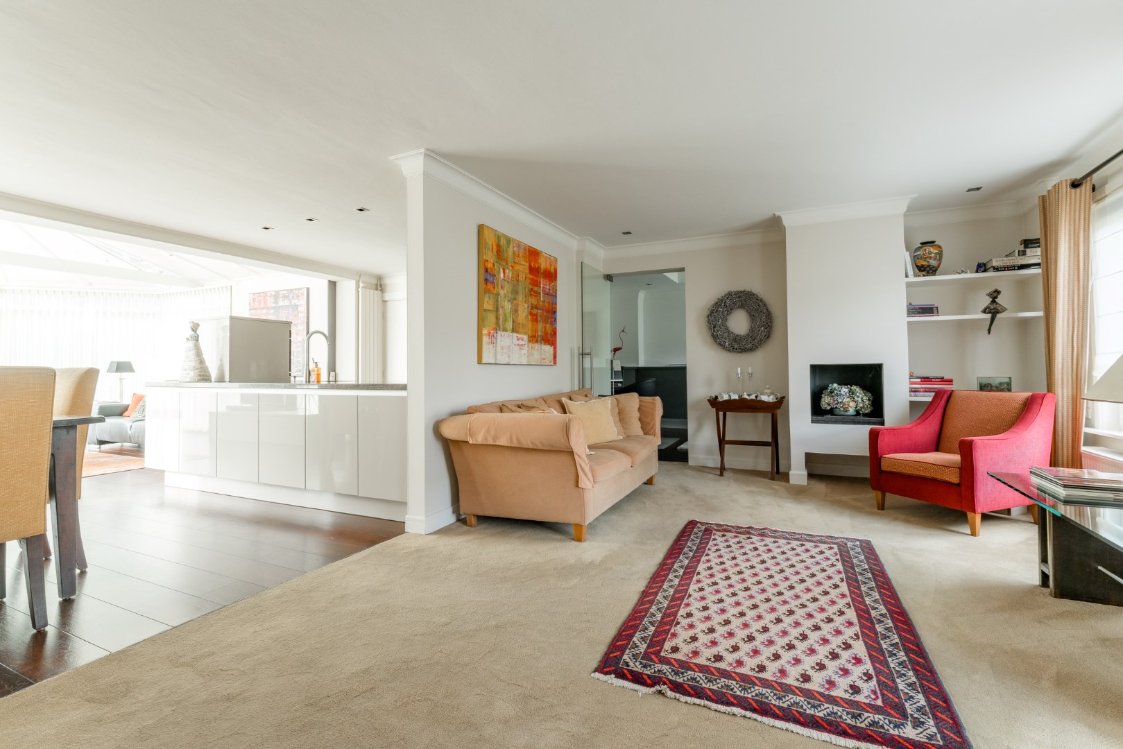Wanneer we naar de andere kant gaan bij de inkomhal, komen we terecht in een zeer lichtrijke leefruimte. Dit is absoluut te danken aan een fantastische tuinkamer/veranda die bij de woning werd betrokken. In de leefruimte vinden we twee zithoeken, eentje in de tuinkamer en eentje vooraan voorzien van een open haard. Verder is er ook een ruime eetkamer met open keuken. Deze Poggenpohl keuken is voorzien van een natuurstenen blad en heeft alle nodige toestellen. Aangrenzend zit ook een bergruimte die voorzien werd van allemaal inbouwkasten. Het wordt al snel duidelijk dat deze woning tot in de puntjes werd afgewerkt.