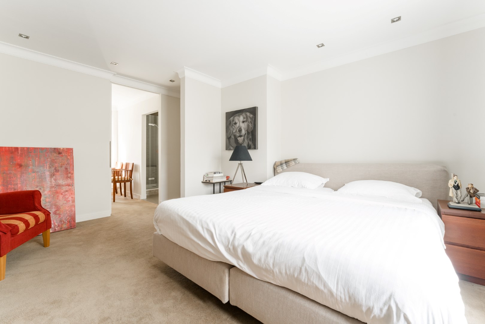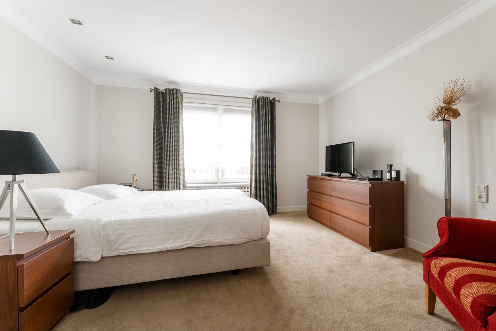 Wanneer we starten in het privatieve gedeelte, is er gelijkvloers een ruime master bedroom te vinden. Deze heeft aanpalend een dressing met zeer nette afgewerkte inbouwkasten en vervolgens een badkamer en suite. De badkamer is voorzien van een douche en bad, alsook toilet en lavabo.