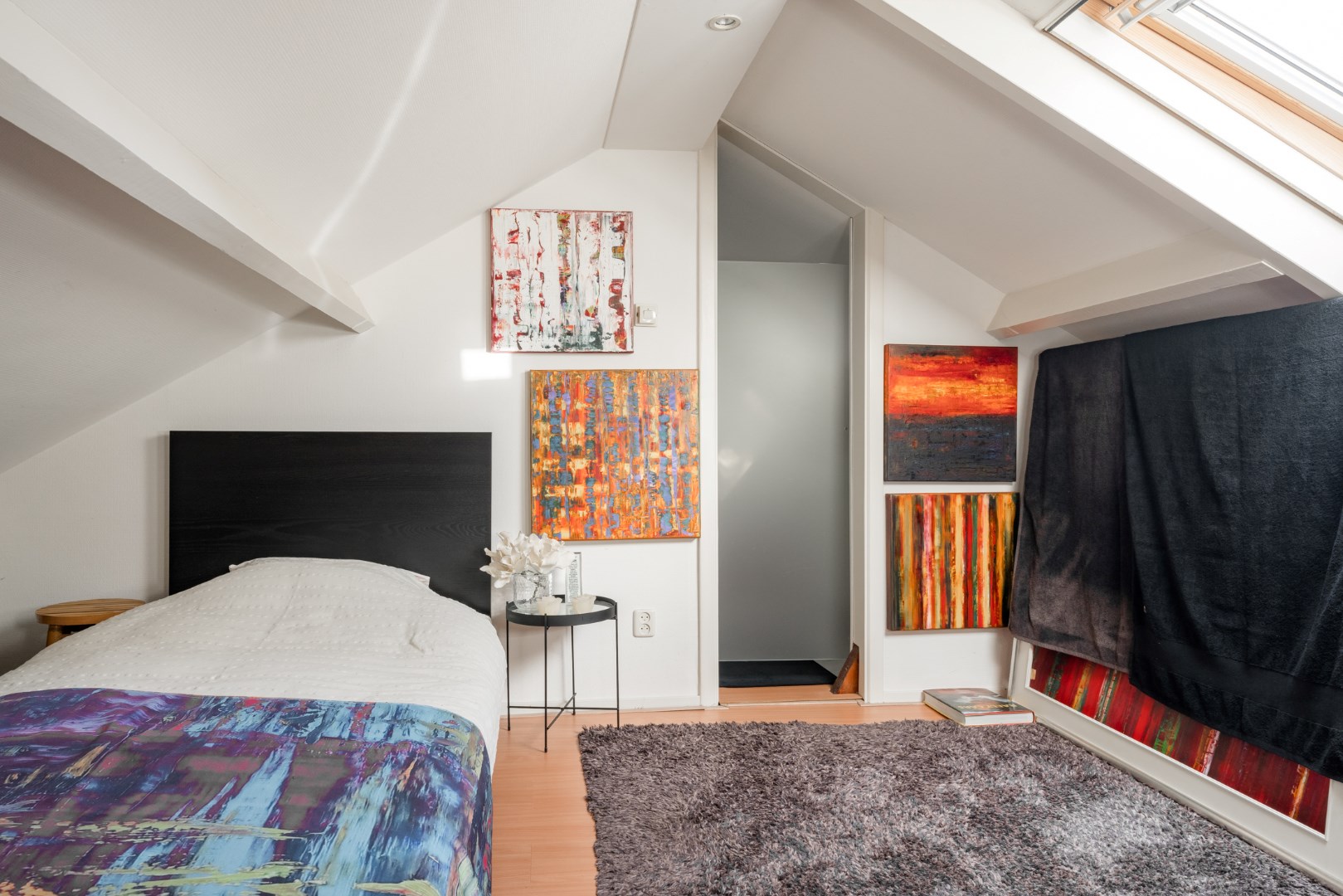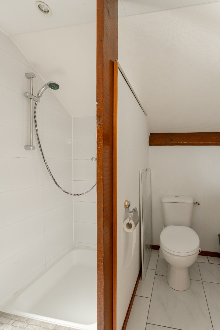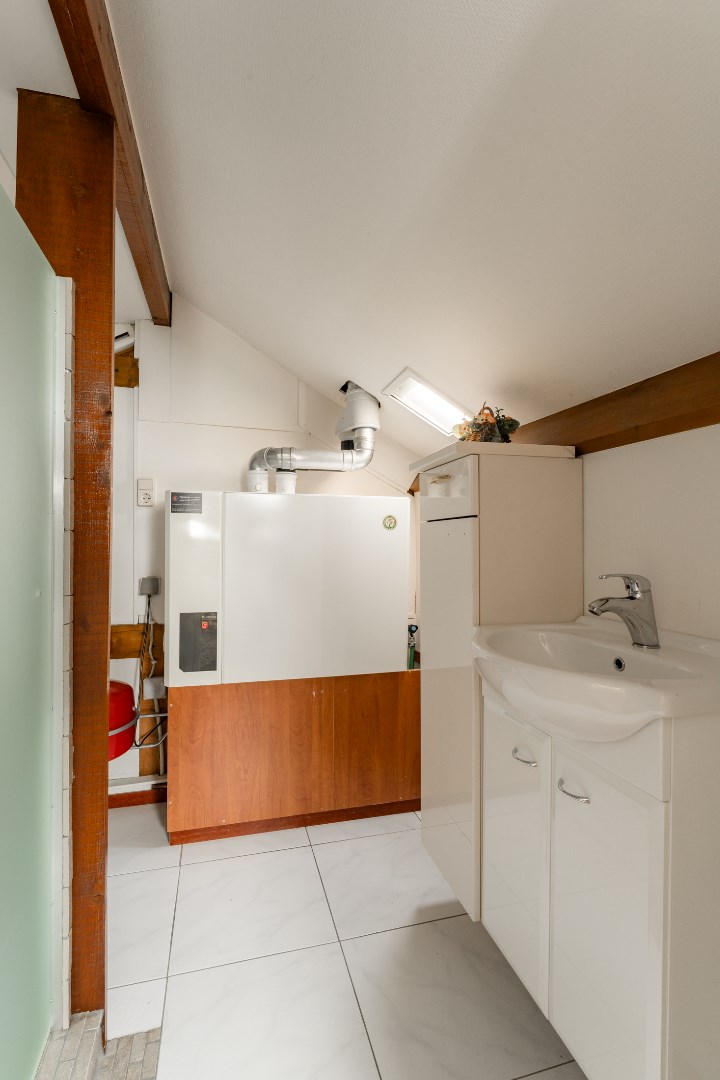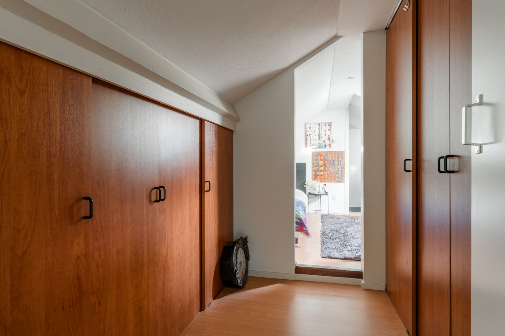Vanuit deze ruimte is er een vaste trap voorzien naar boven, waar opnieuw inbouwkasten, een slaapkamer met airco en een badkamer terug te vinden zijn. Deze badkamer beschikt over een lavabo, douche en toilet.