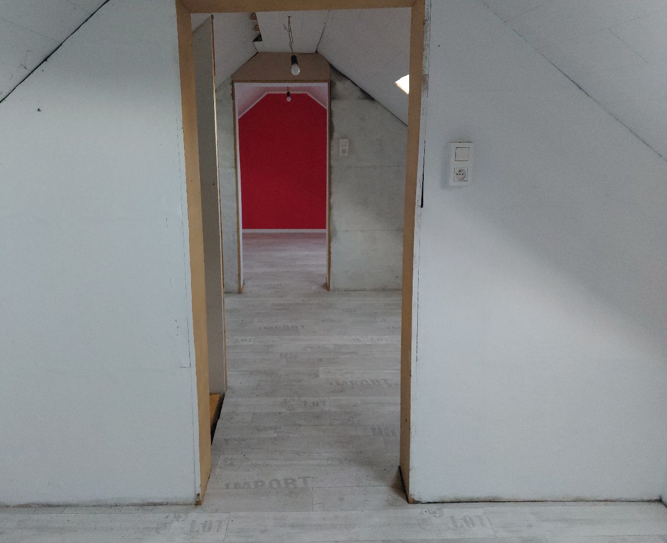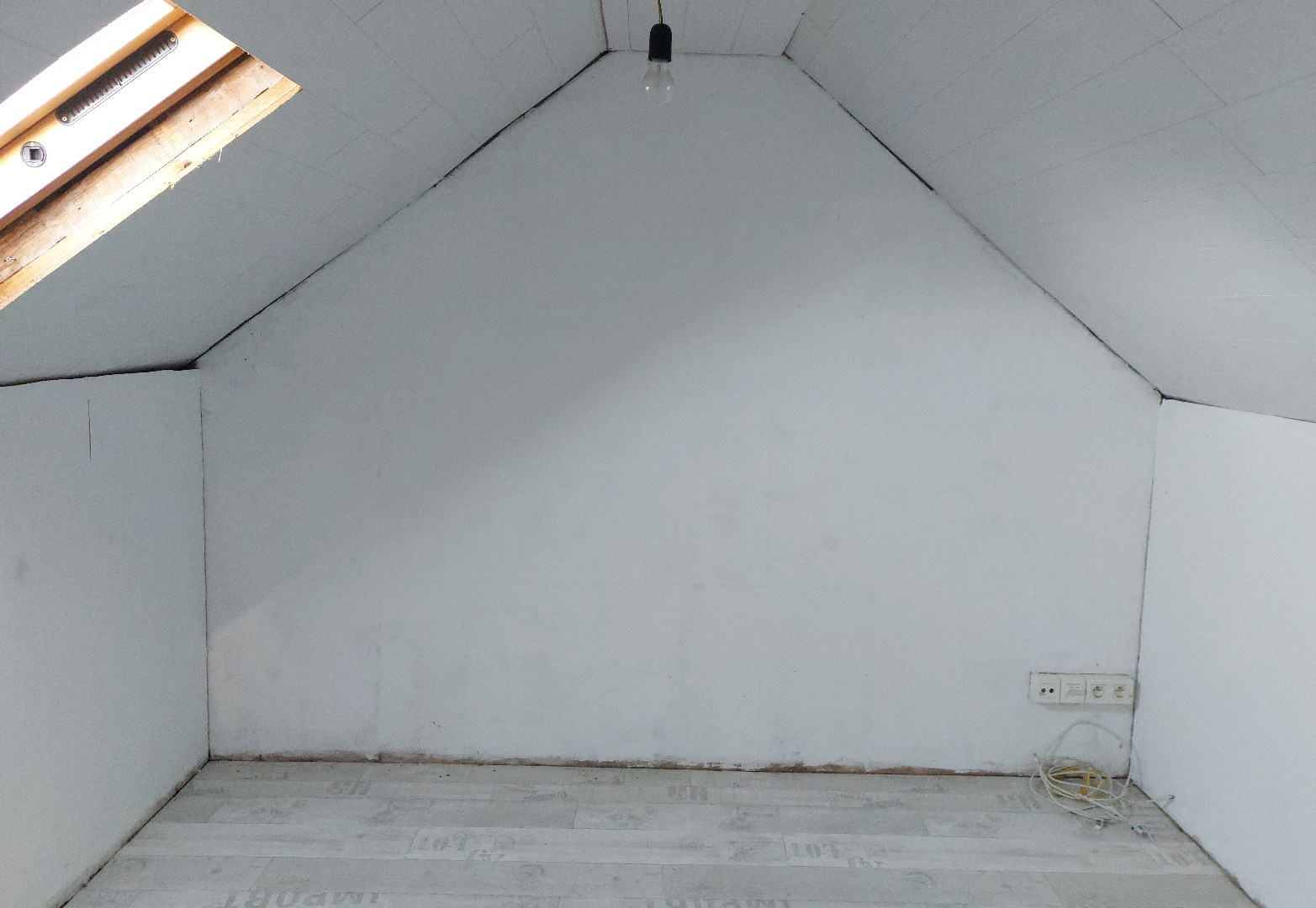 Vanuit de voordeur komen we terecht in de inkomhal. Deze is voorzien van een vaste trap naar het bovenverdiep. Boven is één grote zolder verdeeld in drie stukken, waardoor er twee slaapkamers mogelijk zijn.