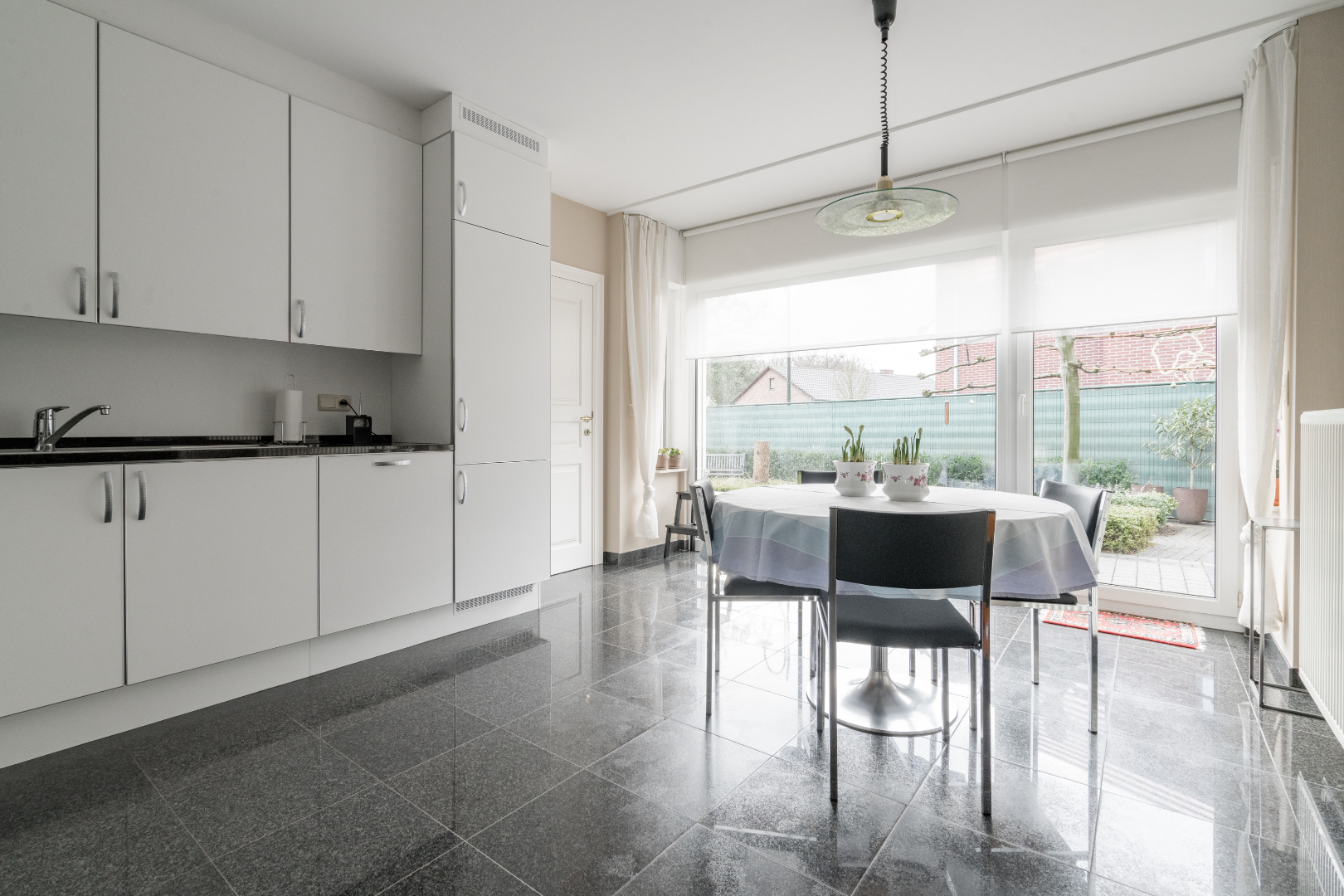 Indeling: Inkomhal, bureel/slaapkamer op het gelijkvloers, woonkamer (+- 47m²) met toegang naar het overdekte terras, volledig ingerichte keuken met zeer veel lichtinval dankzij de grote ramen, sas met toegang tot de aparte toilet, wasplaats en inpandige garage