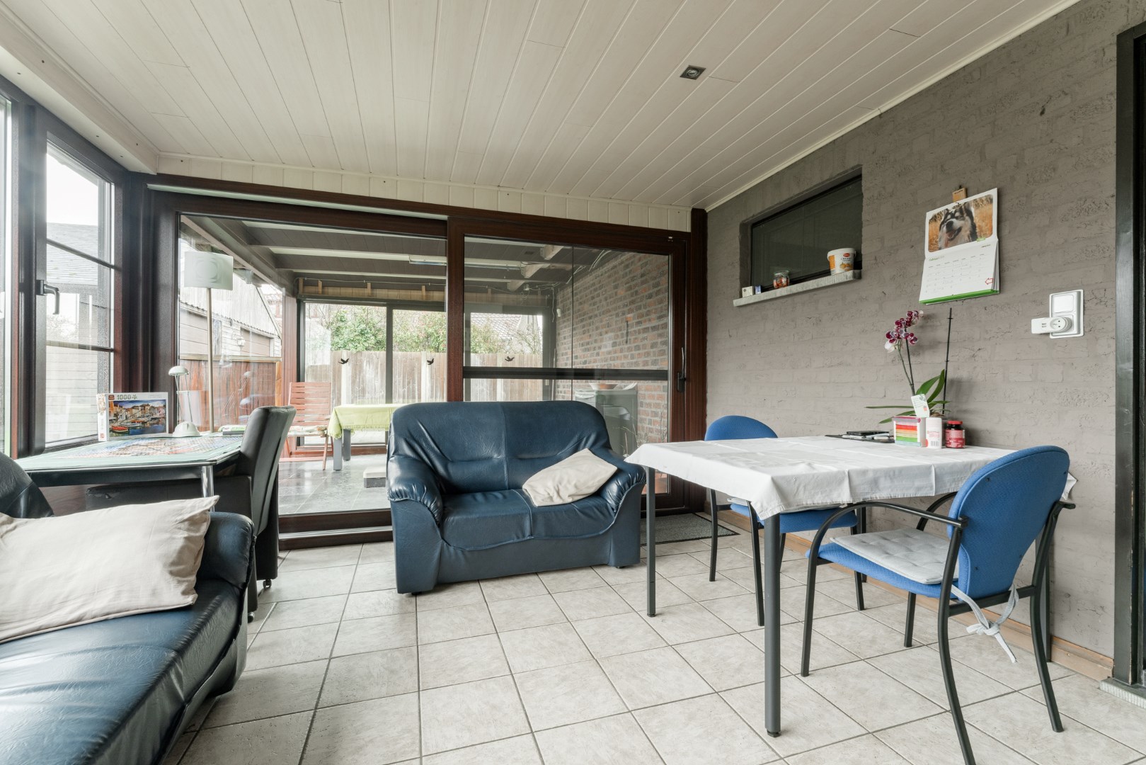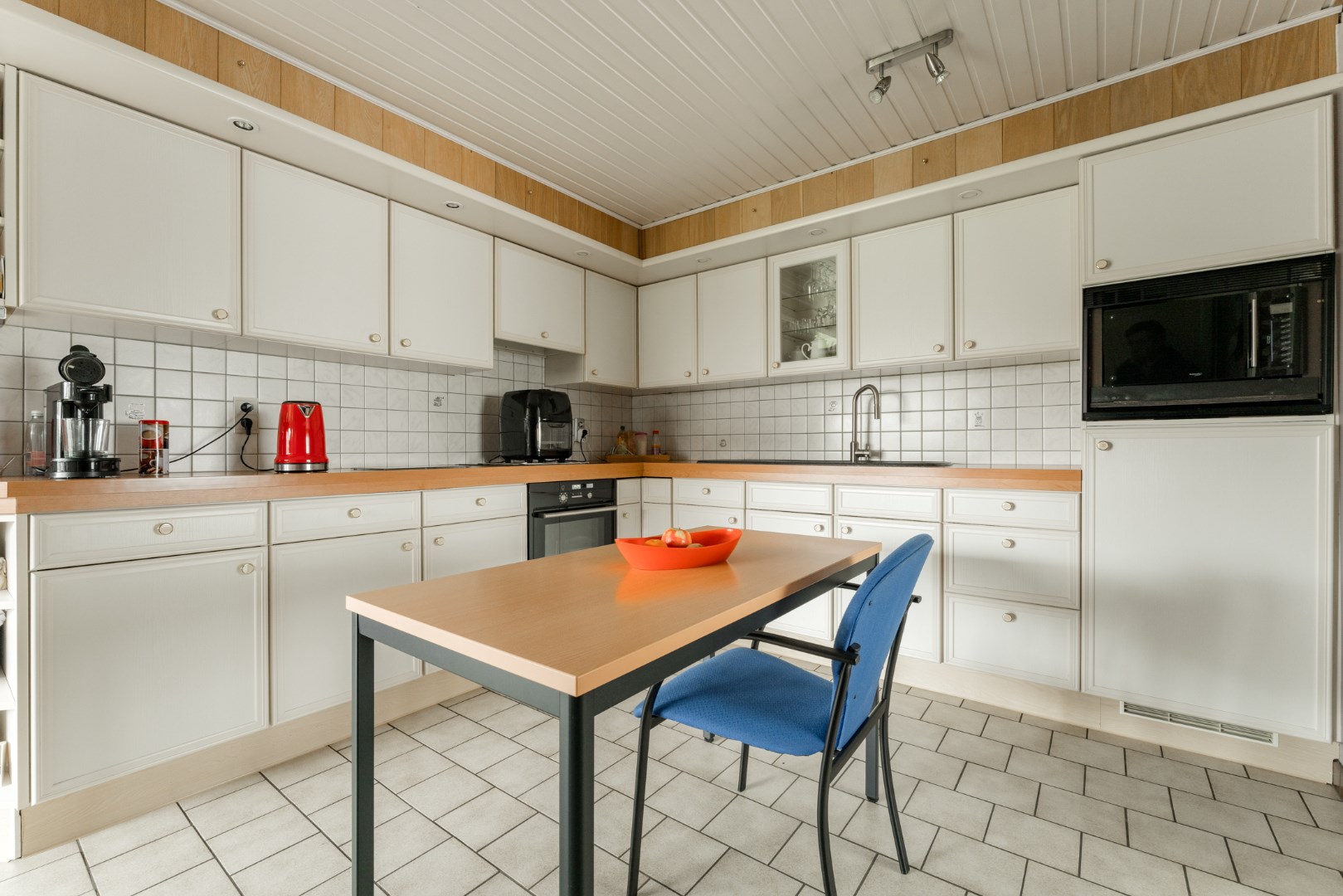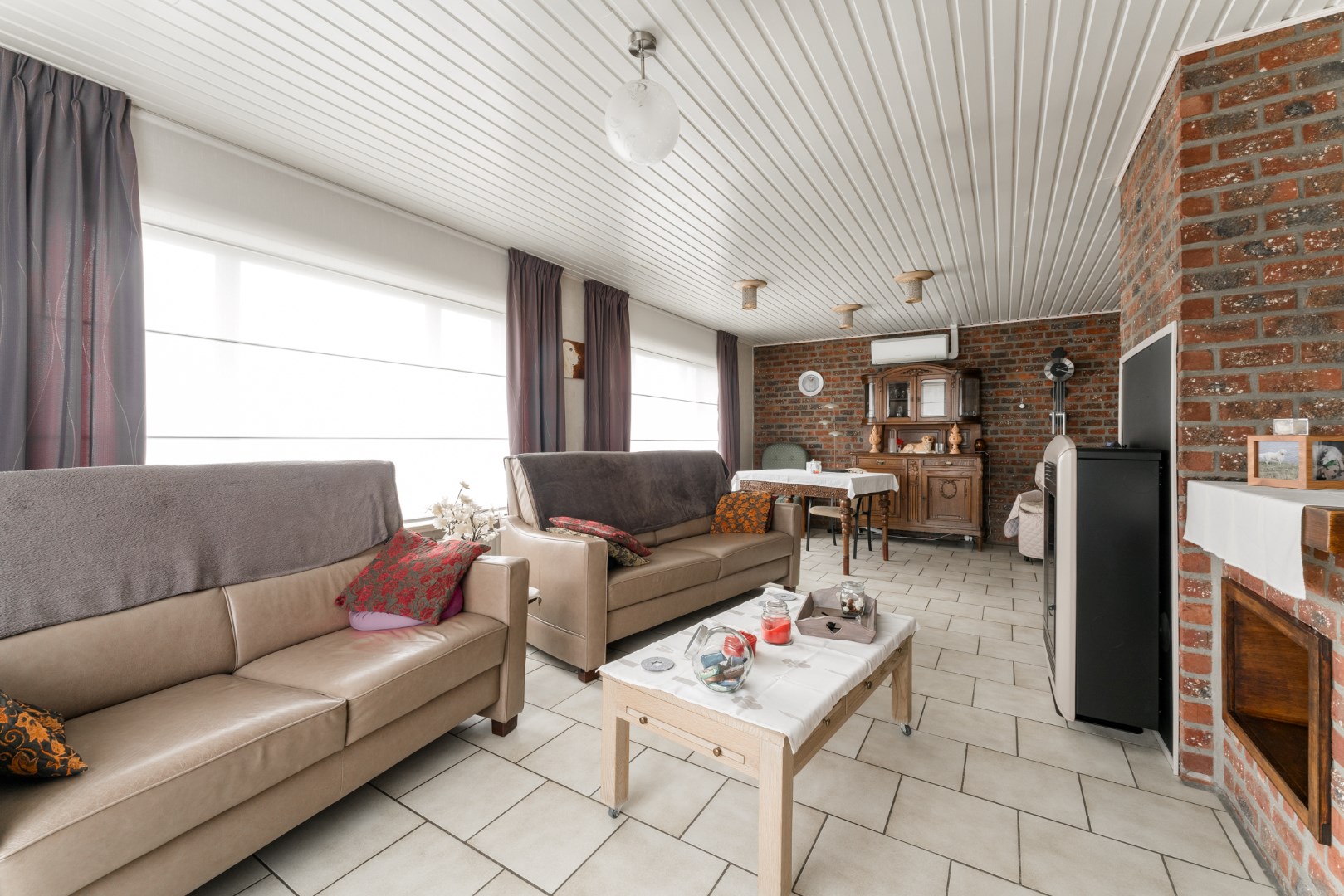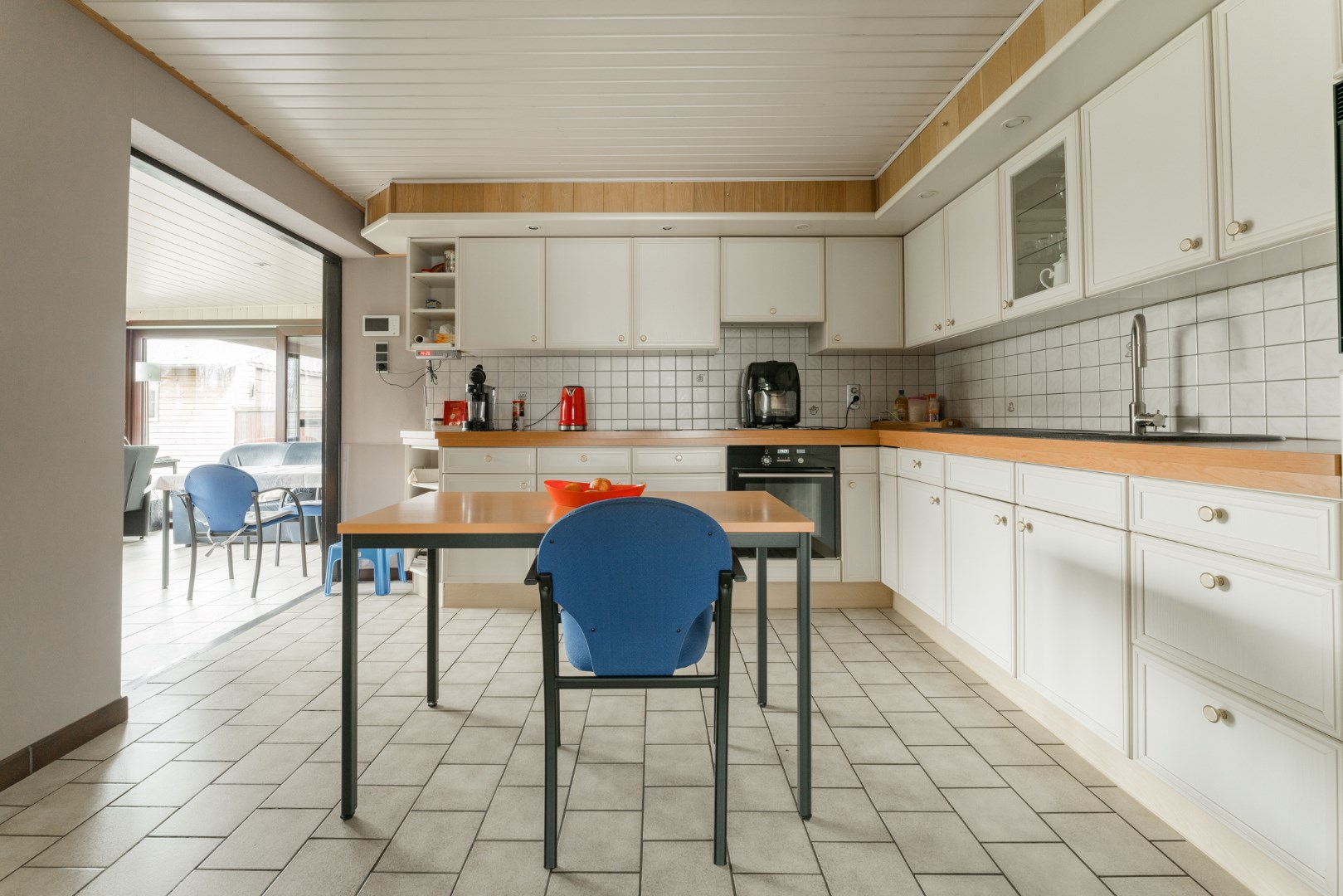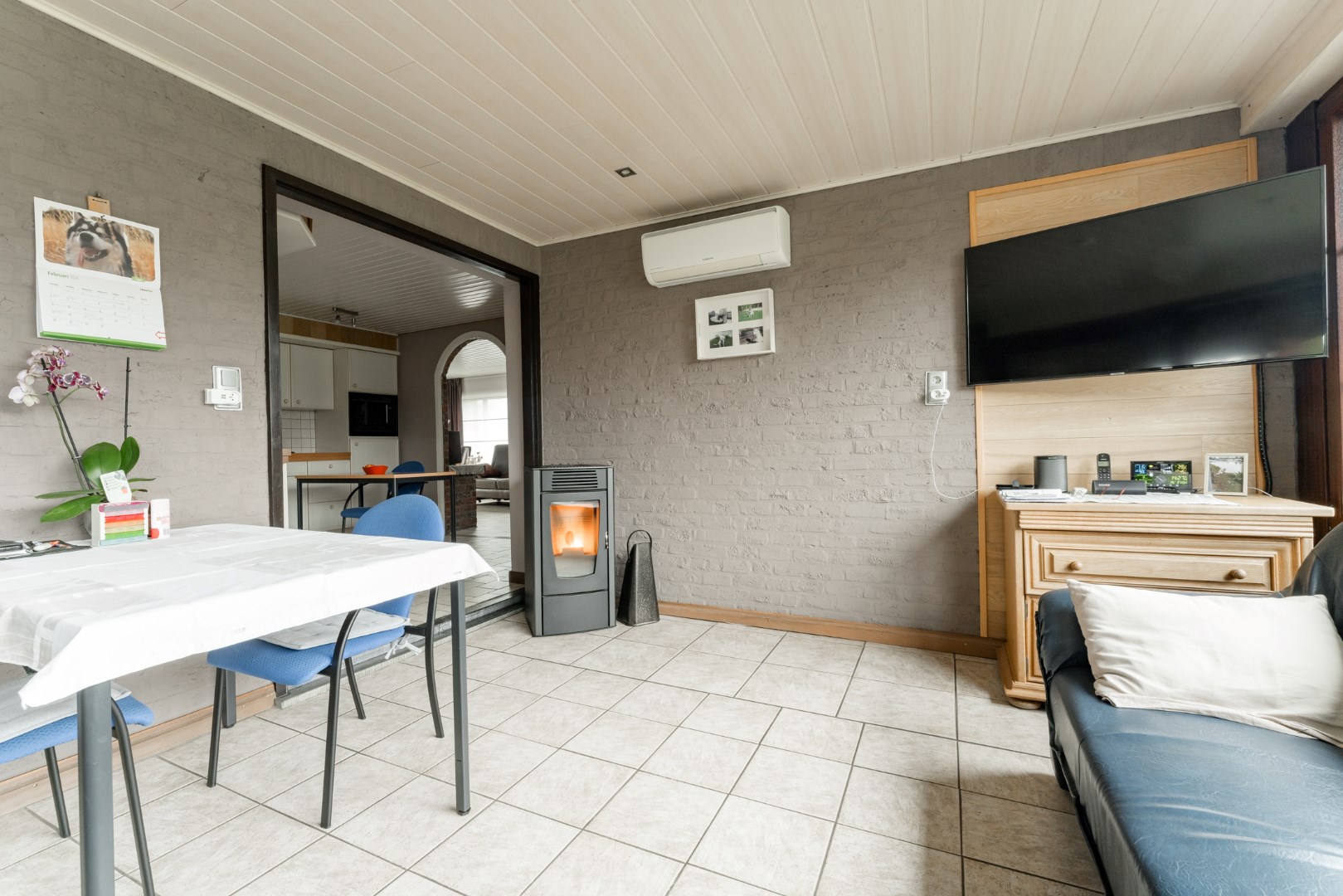 De keuken staat in verbinding met de aangebouwde veranda die je het gevoel geeft alsof je werkelijk in de tuin zit. Hier is opnieuw een unit voorzien om te verwarmen, alsook een pelletkachel.